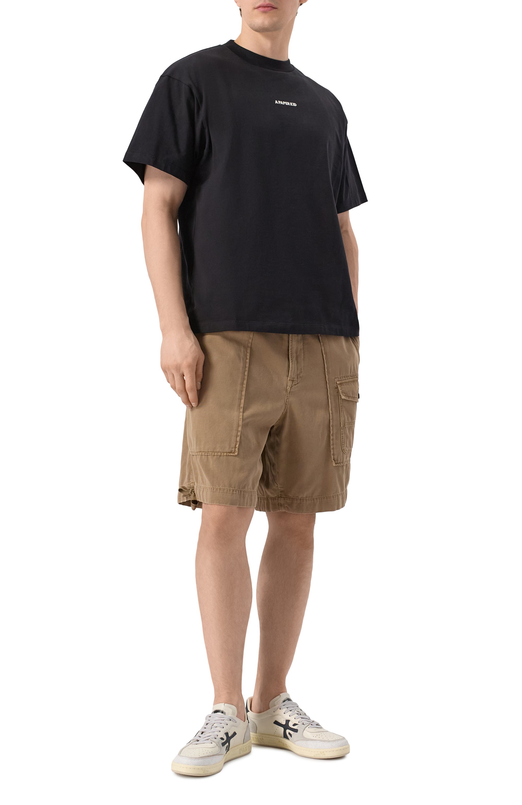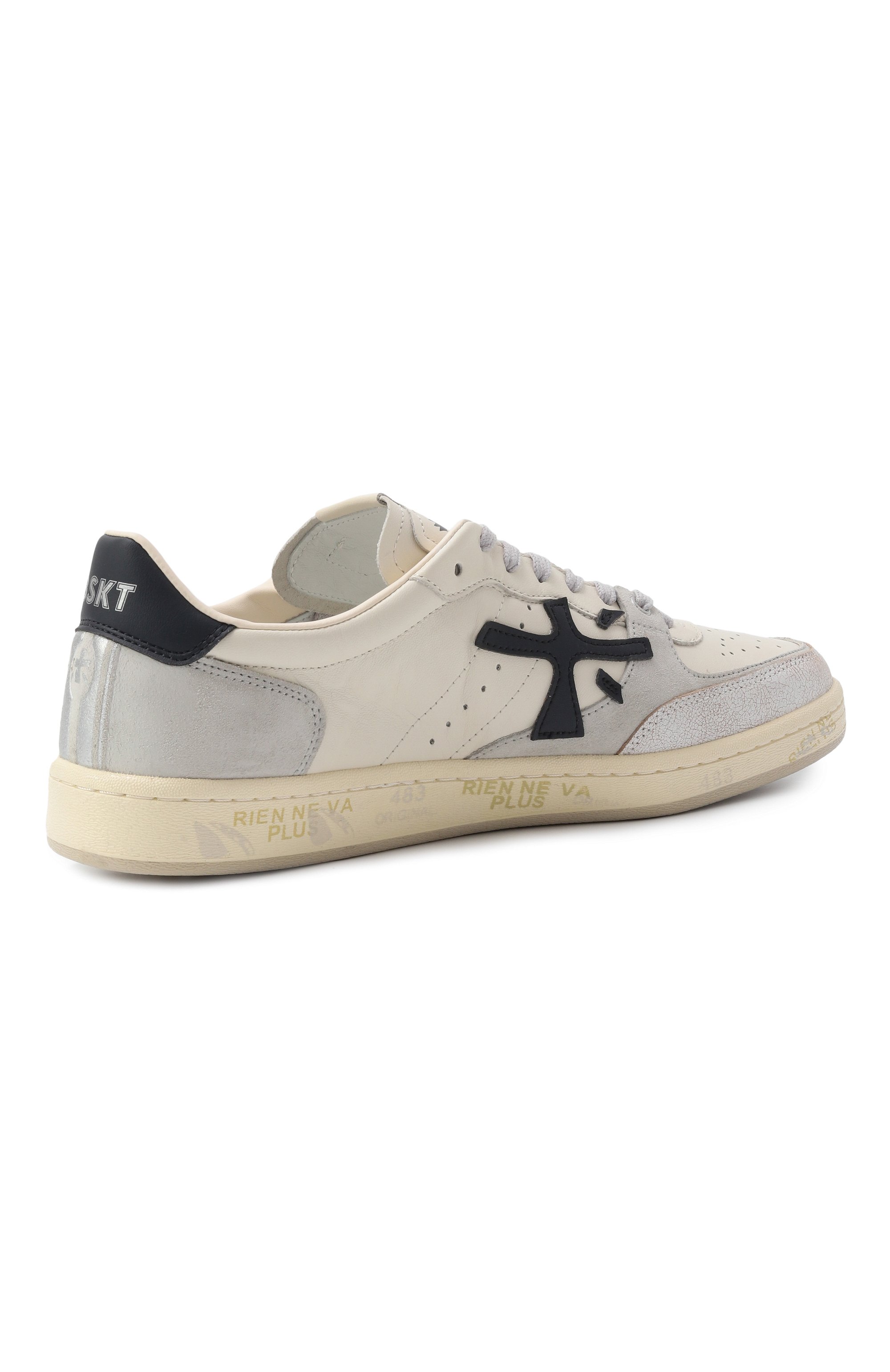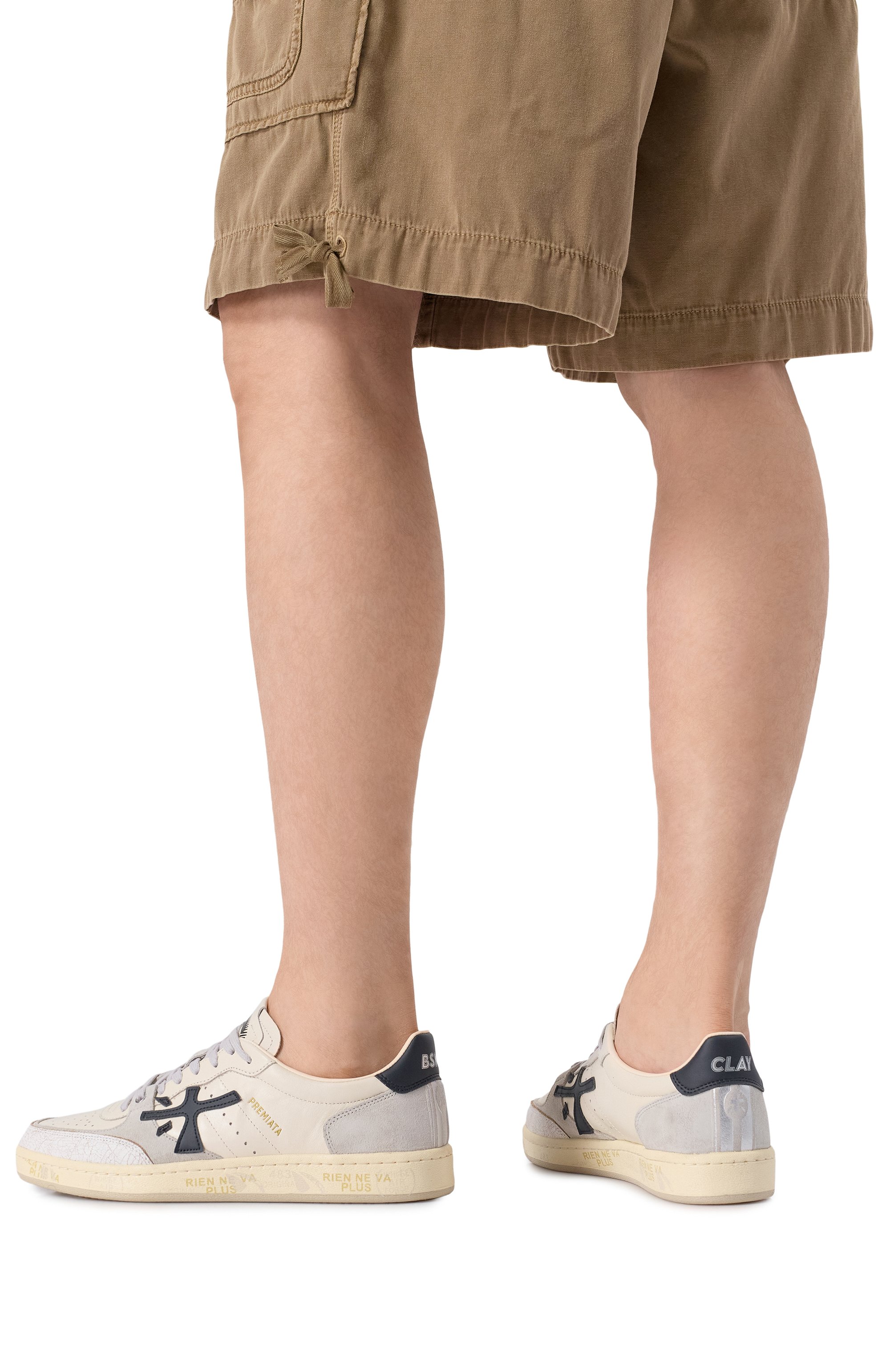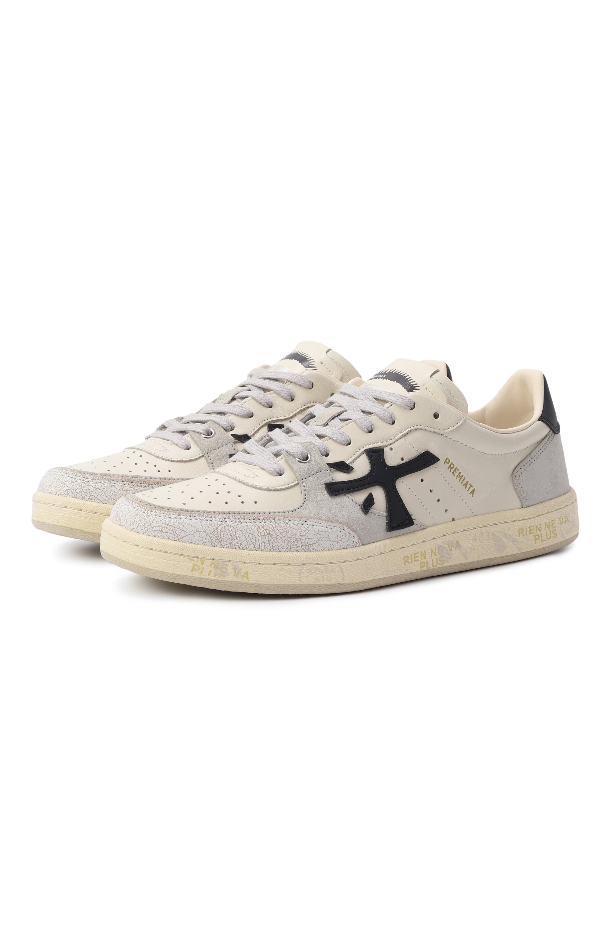 Кеды с перфорированной союзкой из гладкой кожи и замши на брендированной подошве и будто растрескавшимся мысом украшены фирменными иероглифами, логотипом по бокам и названием на заднике.