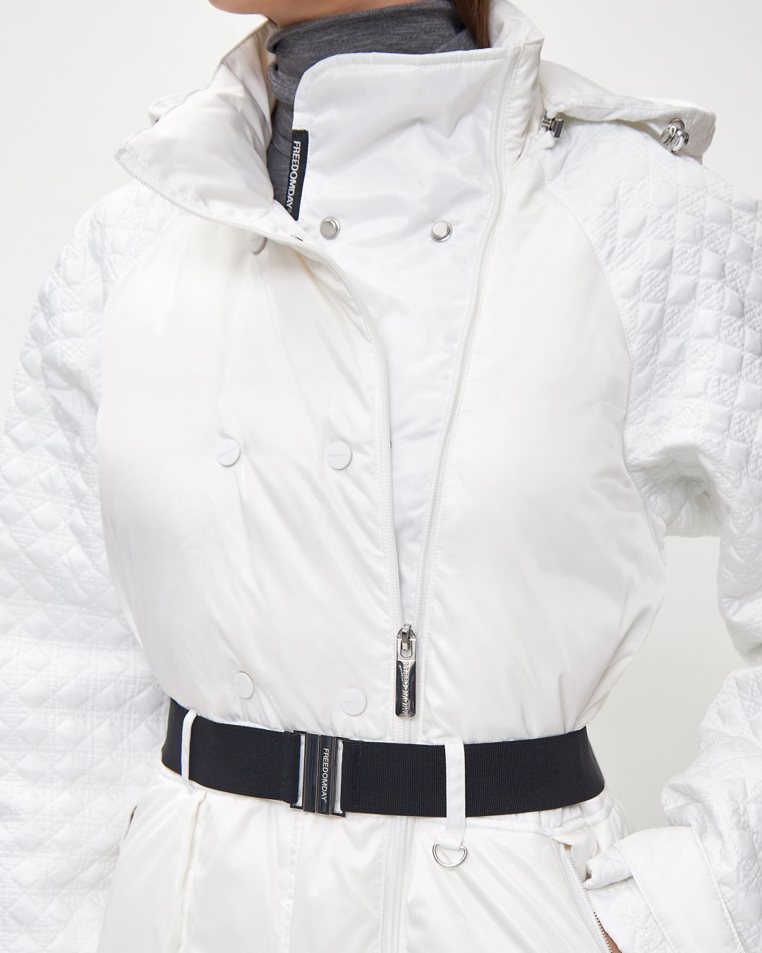 Комбенизон от бренда Freedomday изготовлен из 100% нейлона. Модель свободного кроя с капюшоном и накладными карманами по бокам. Изделие дополнили удобной застежкой на молнии и контрастным поясом для комфортнйо посадки.