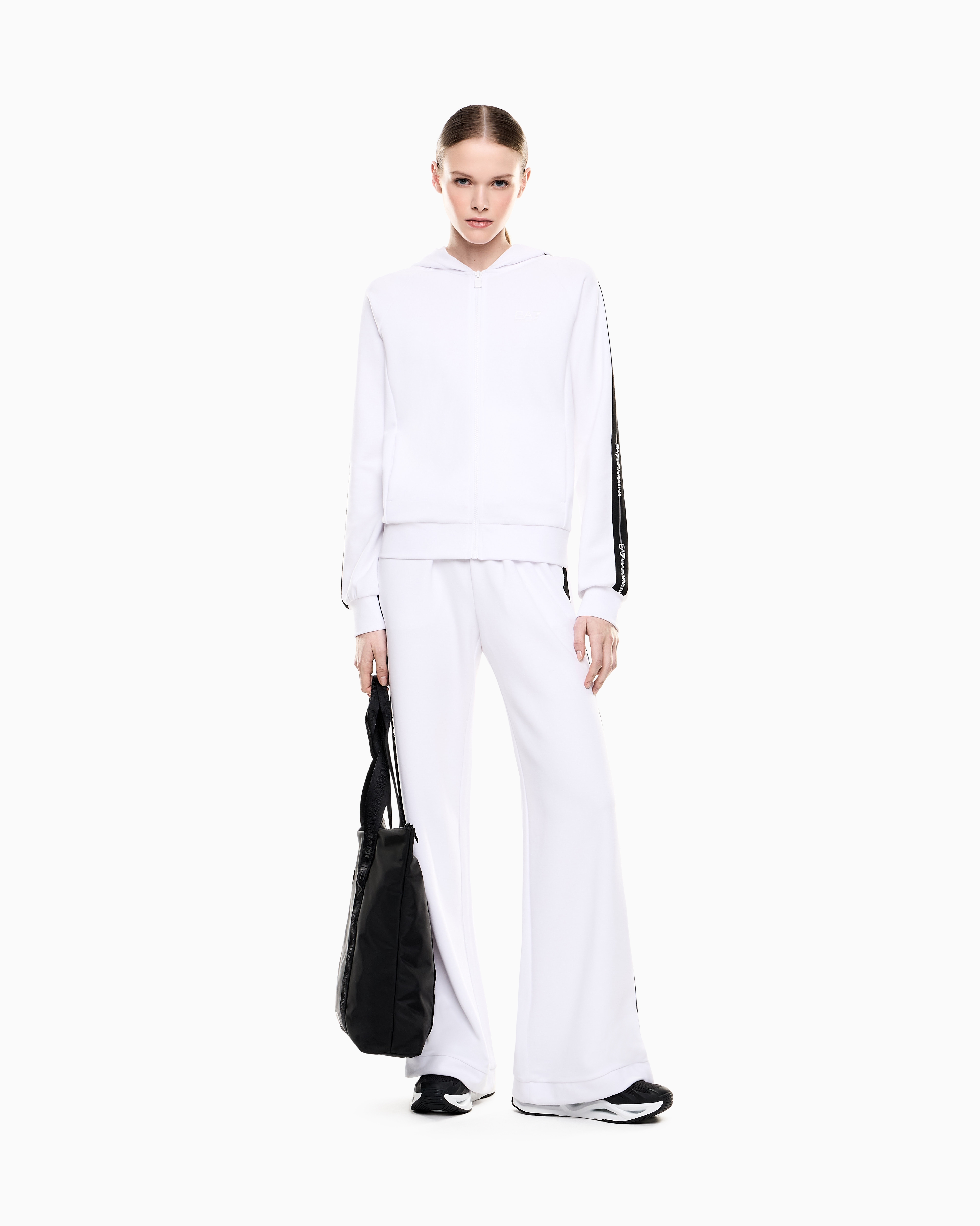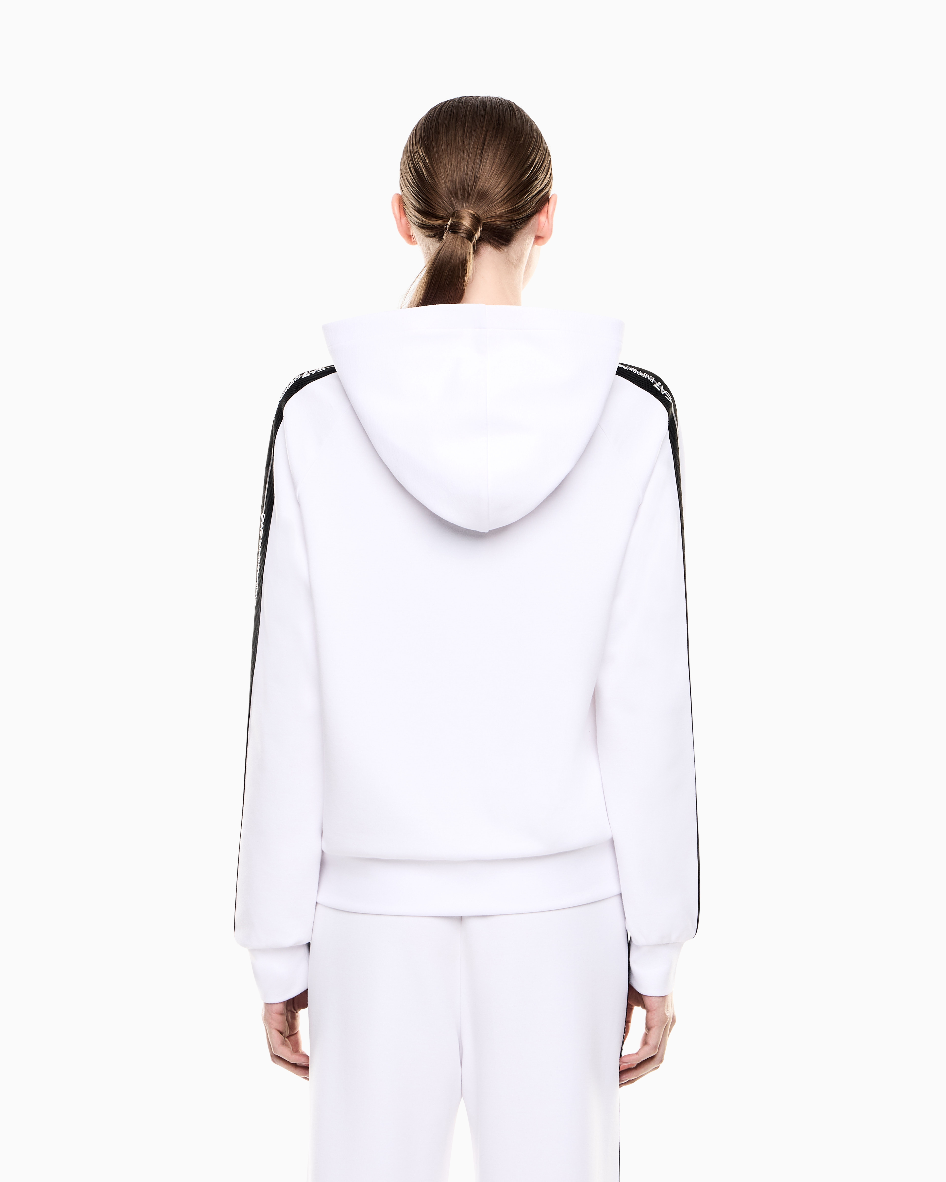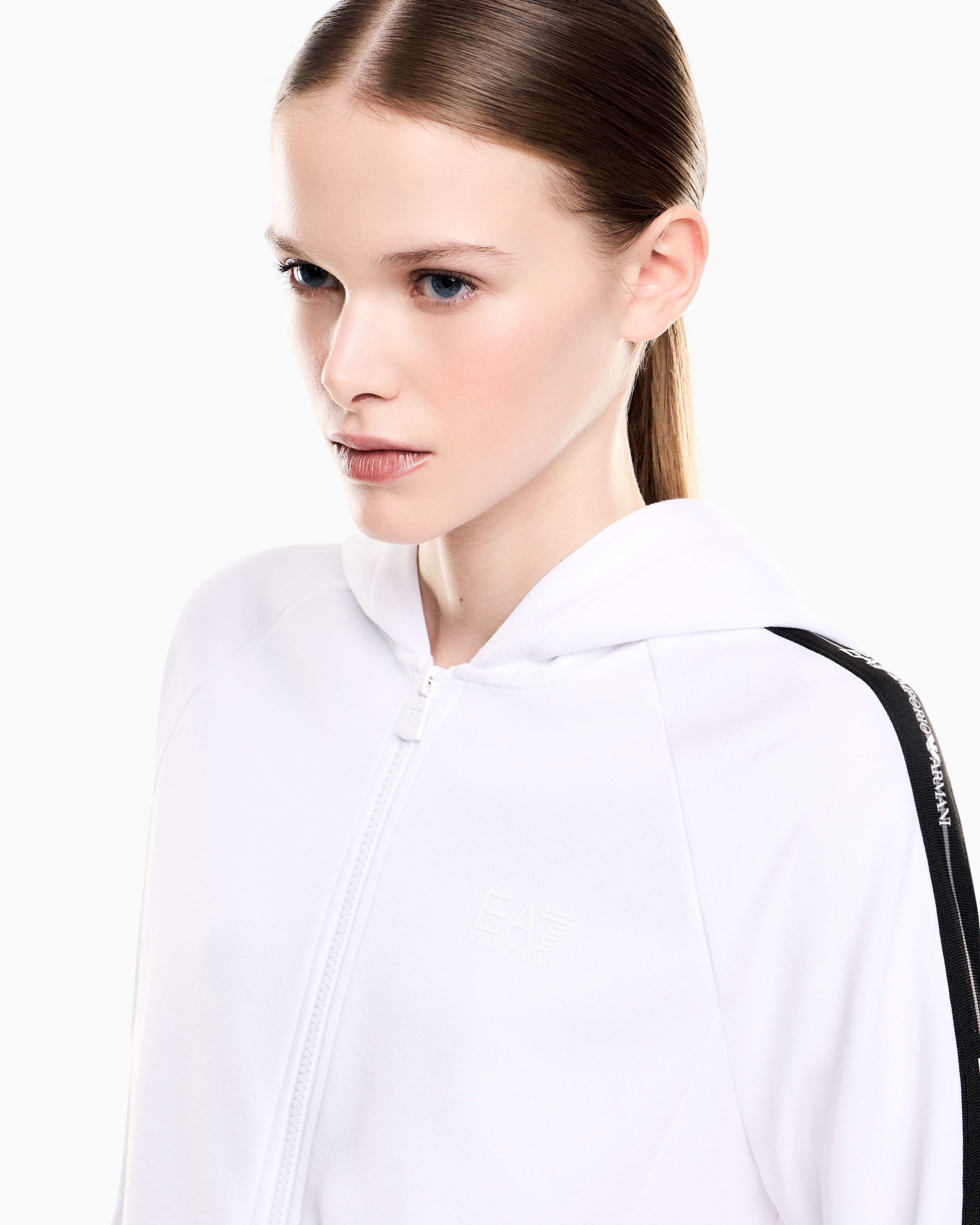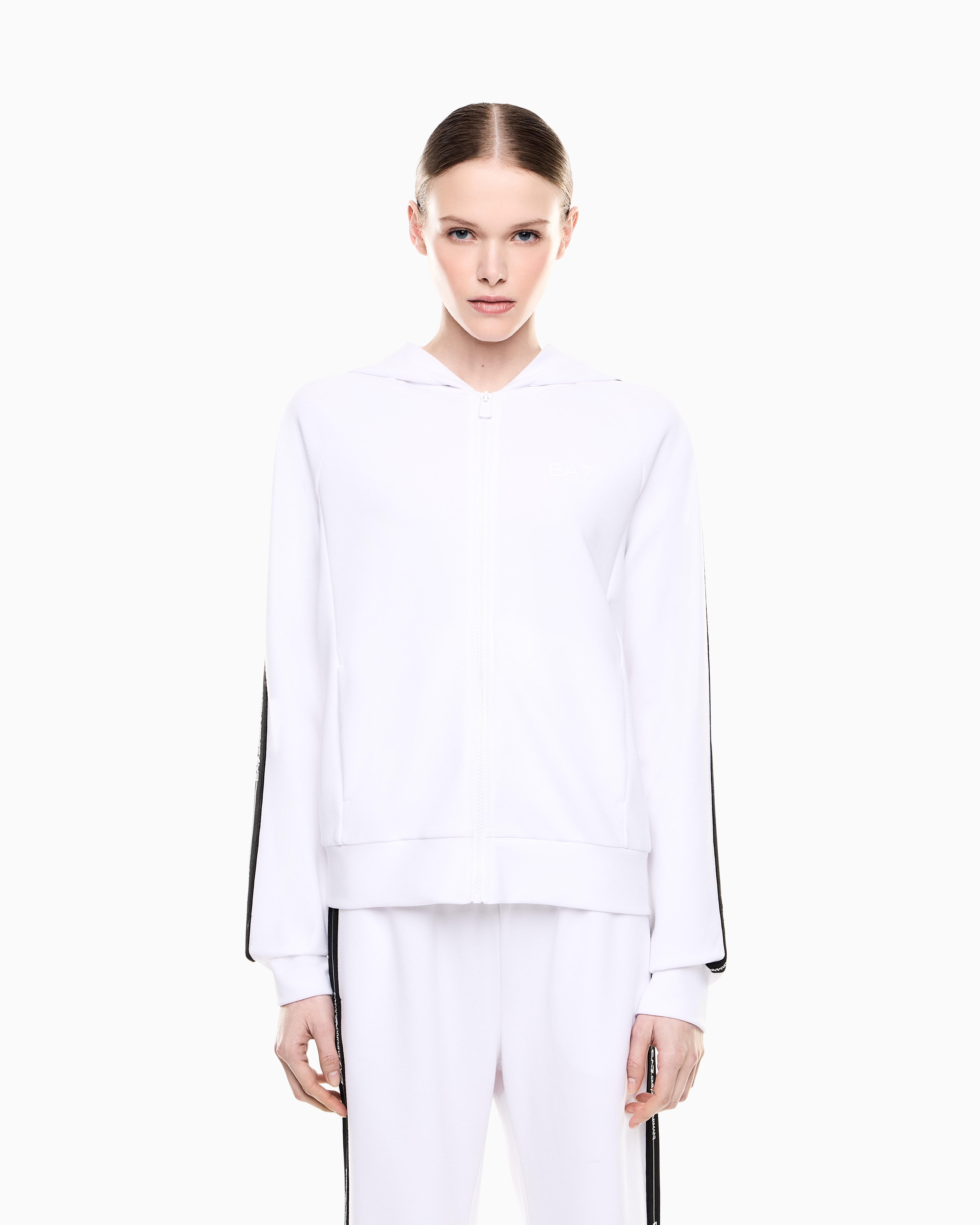 - толстовка с застежкой на молнию дополнена боковыми карманами, эластичными манжетами, капюшоном и контрастными бронированными лентами на рукавах;