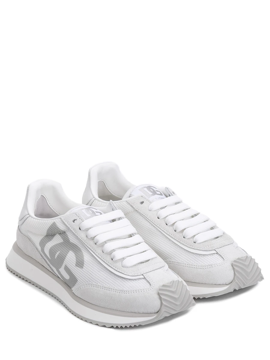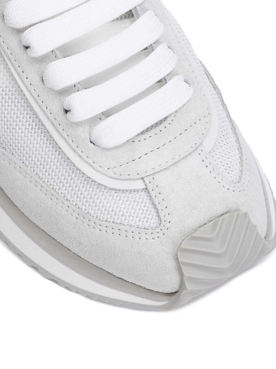 Кроссовки из комбинации пластичной замши и сетчатого текстиля с легкой рифленой подошвой, переходящей на мыс, отделали внутри мягкой ягнячьей и козьей кожей. Пару по бокам украсили крупной фирменной монограммой бренда, также дополнили ею патч на язычке, а тисненым логотипом бренда – гладкий задник.
