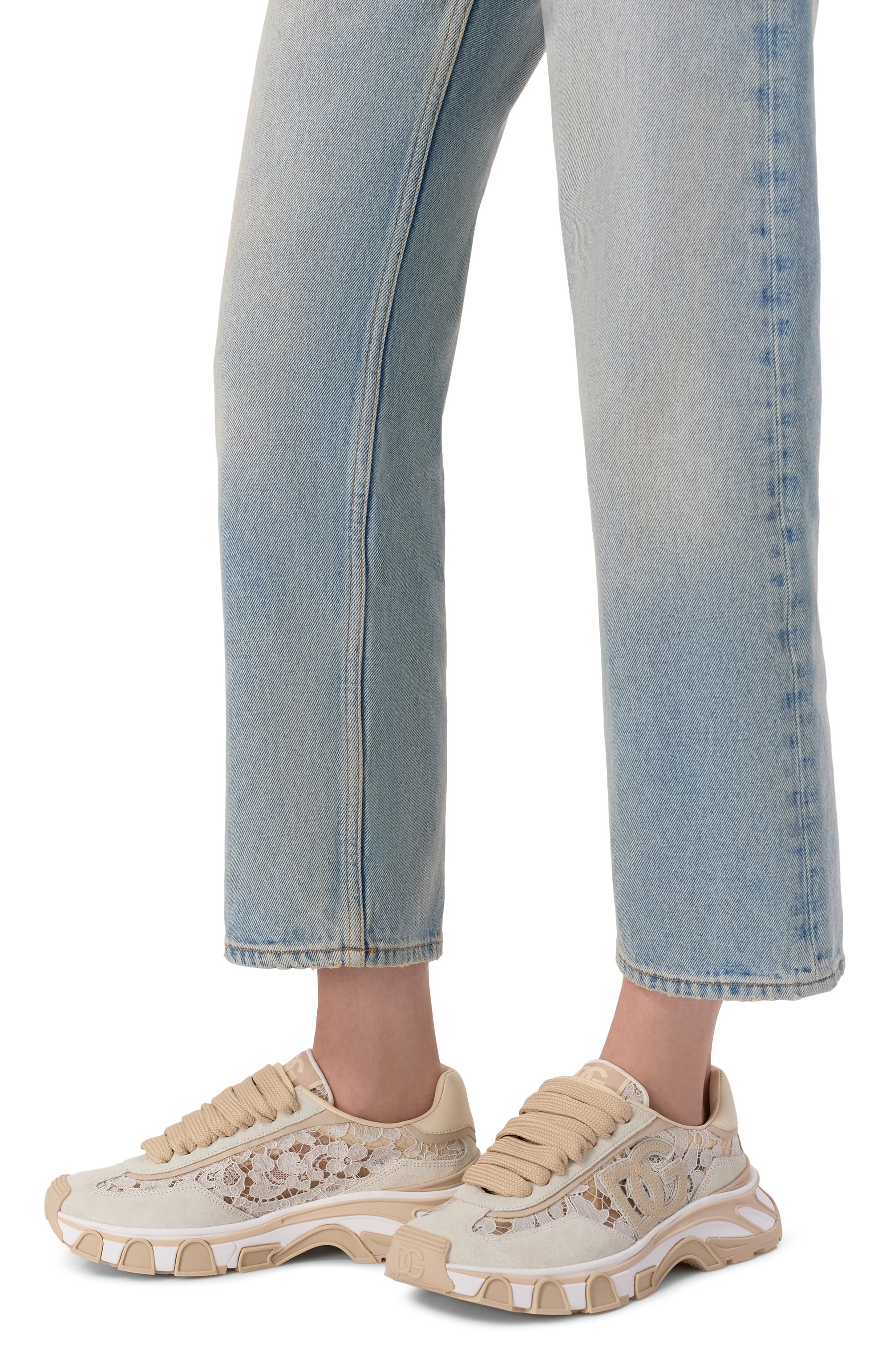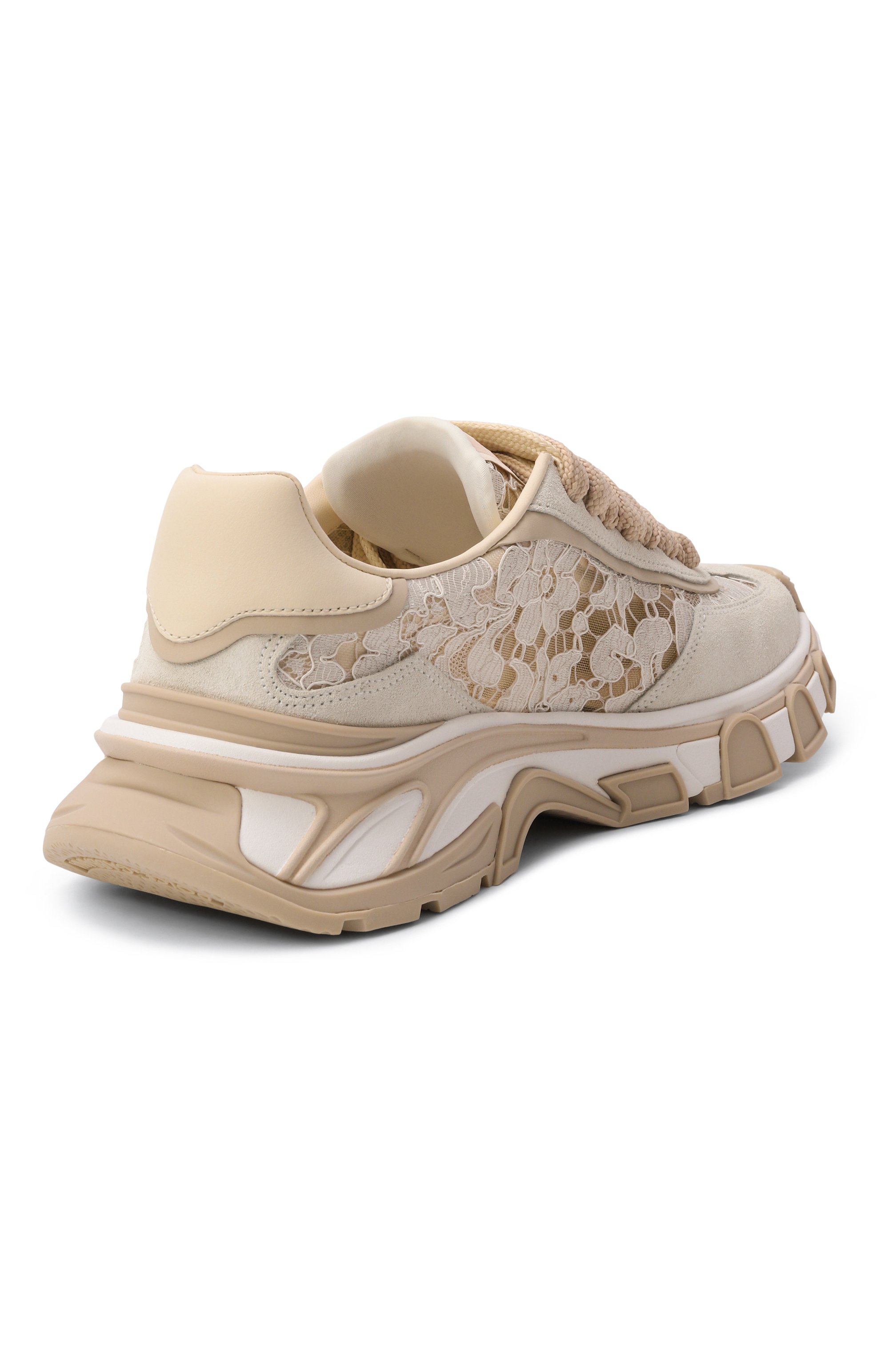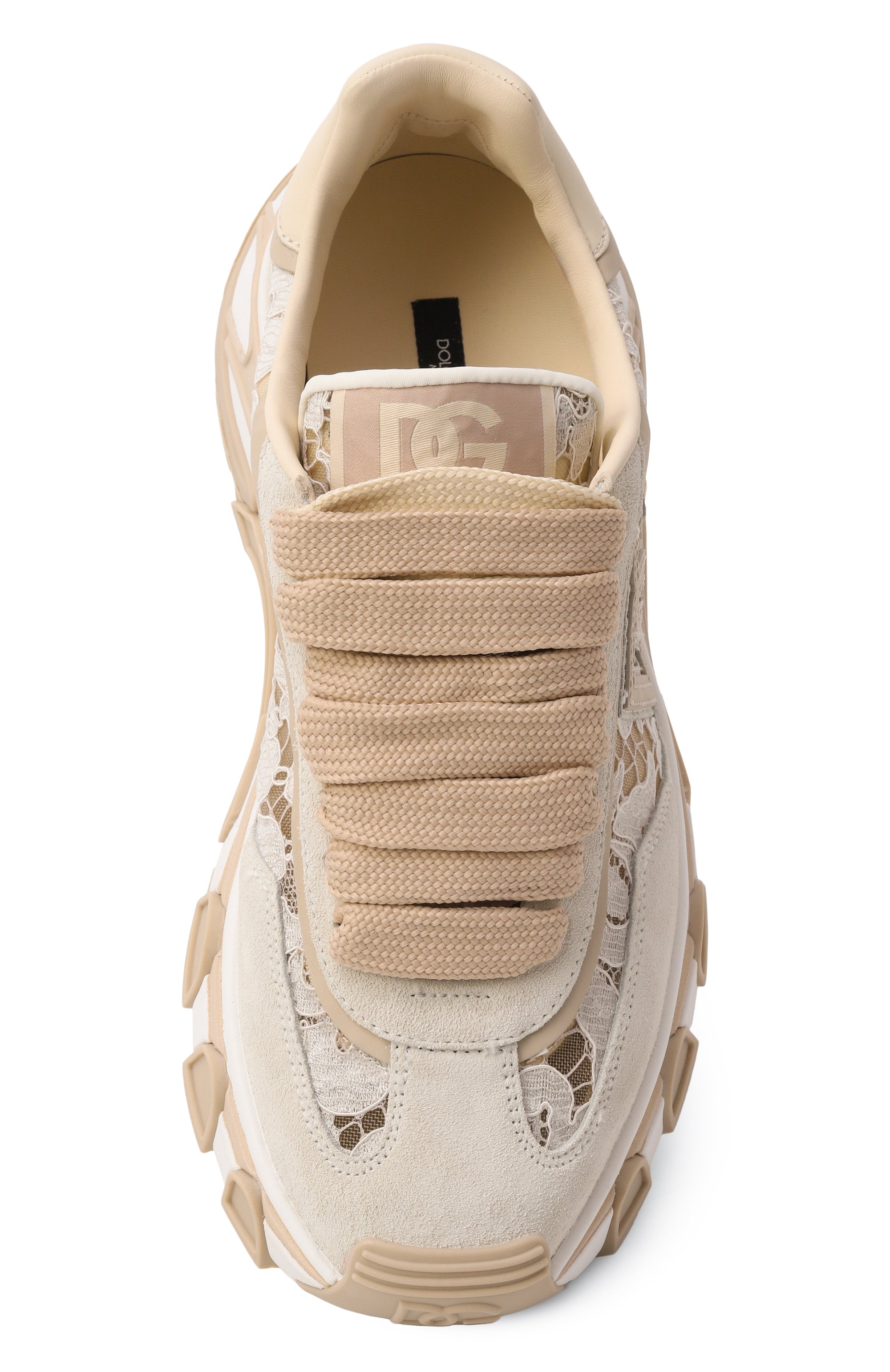 Кроссовки DG Country Road на подошве из комбинации термополиуретана и полимера Phylo из эффектного кружева на основе нейлона, вискозы и хлопка укрепили телячьей замшей и дополнили подкладом из кожи ягненка и полиамида стрейч. Сбоку пару украсили монограммой бренда, которой вторит патч на язычке.