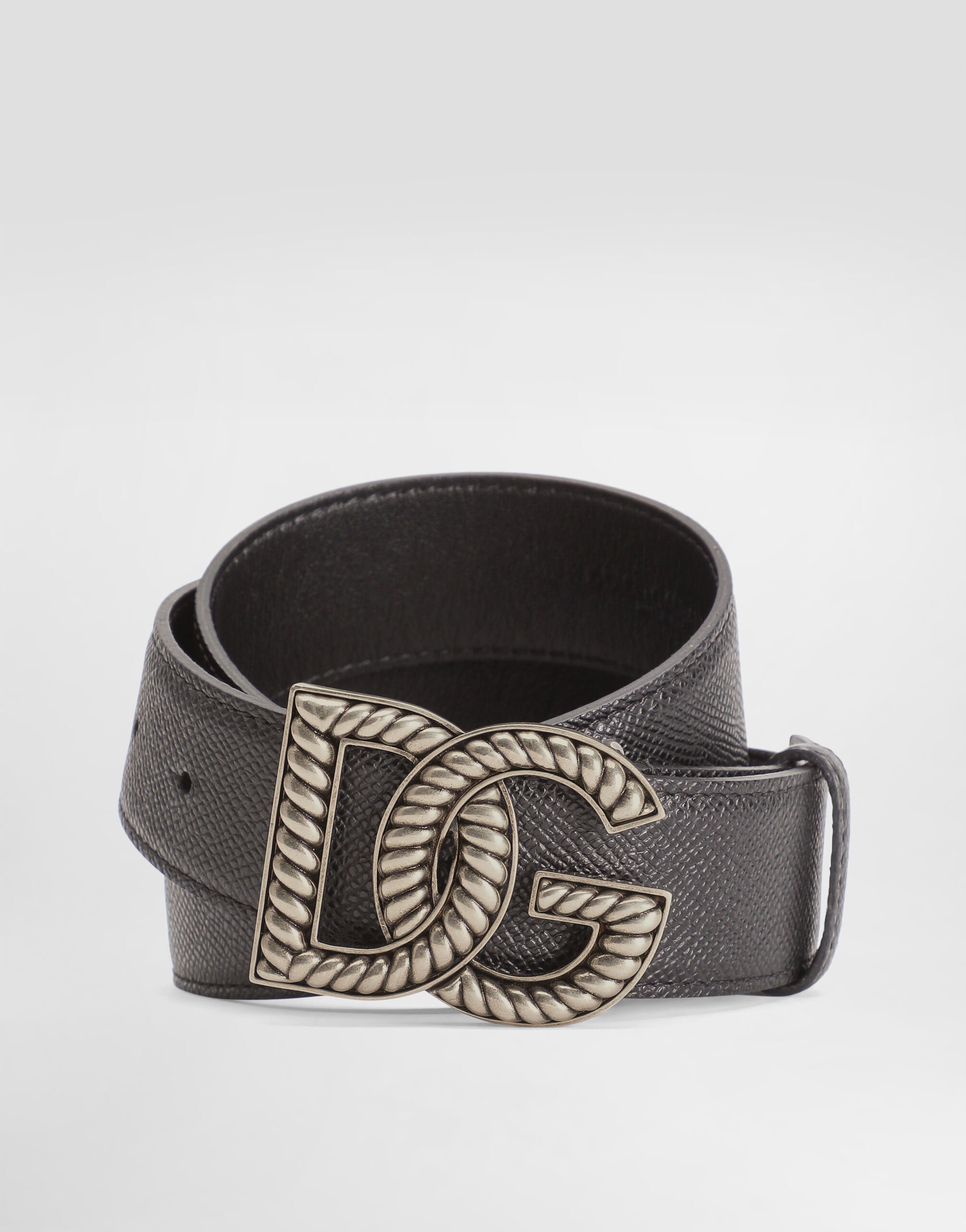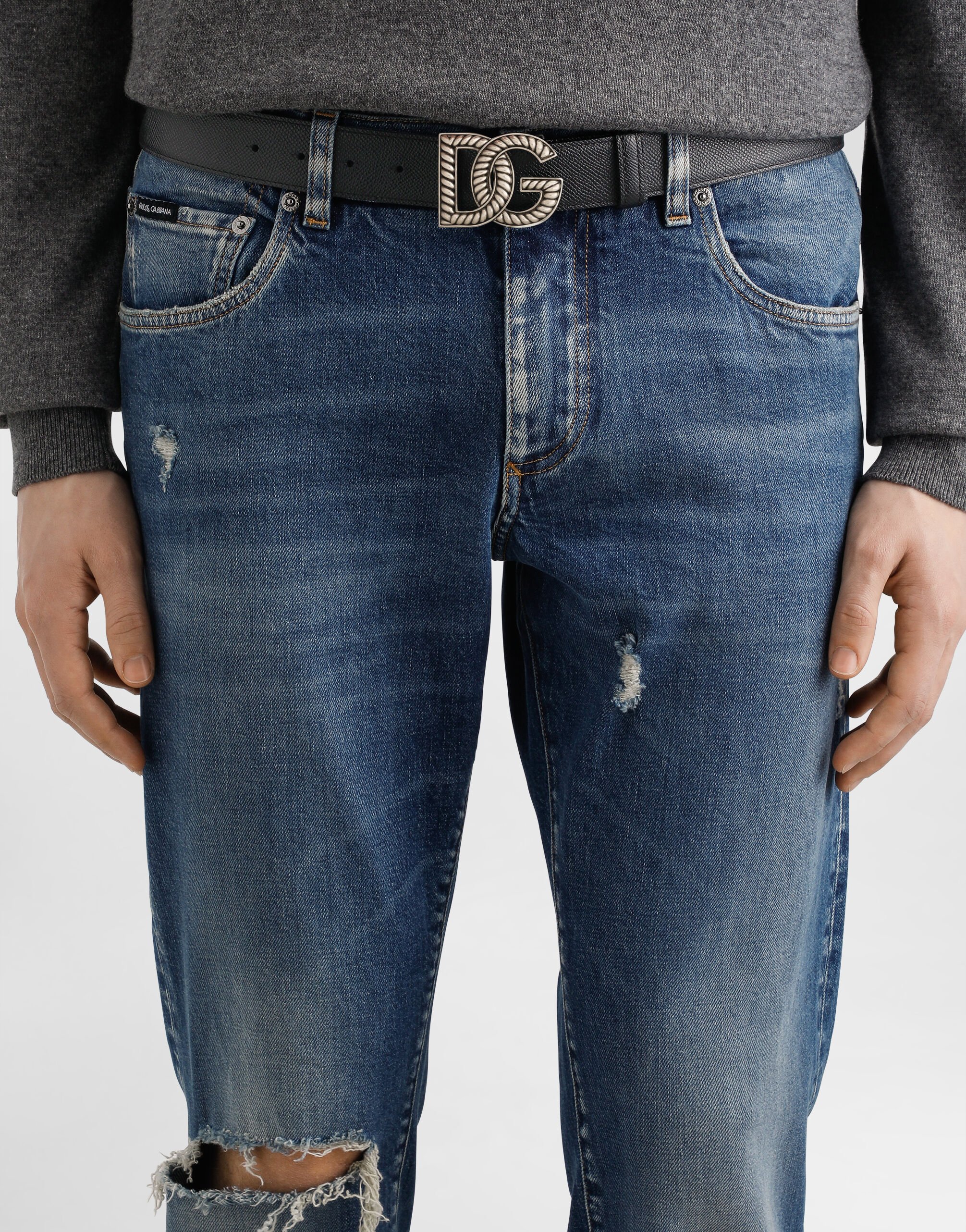 Двусторонний ремень из телячьей кожи: гладкой и с тиснением Alpine. Модель застегивается акцентной кобурной пряжкой в виде фирменной монограммы бренда.