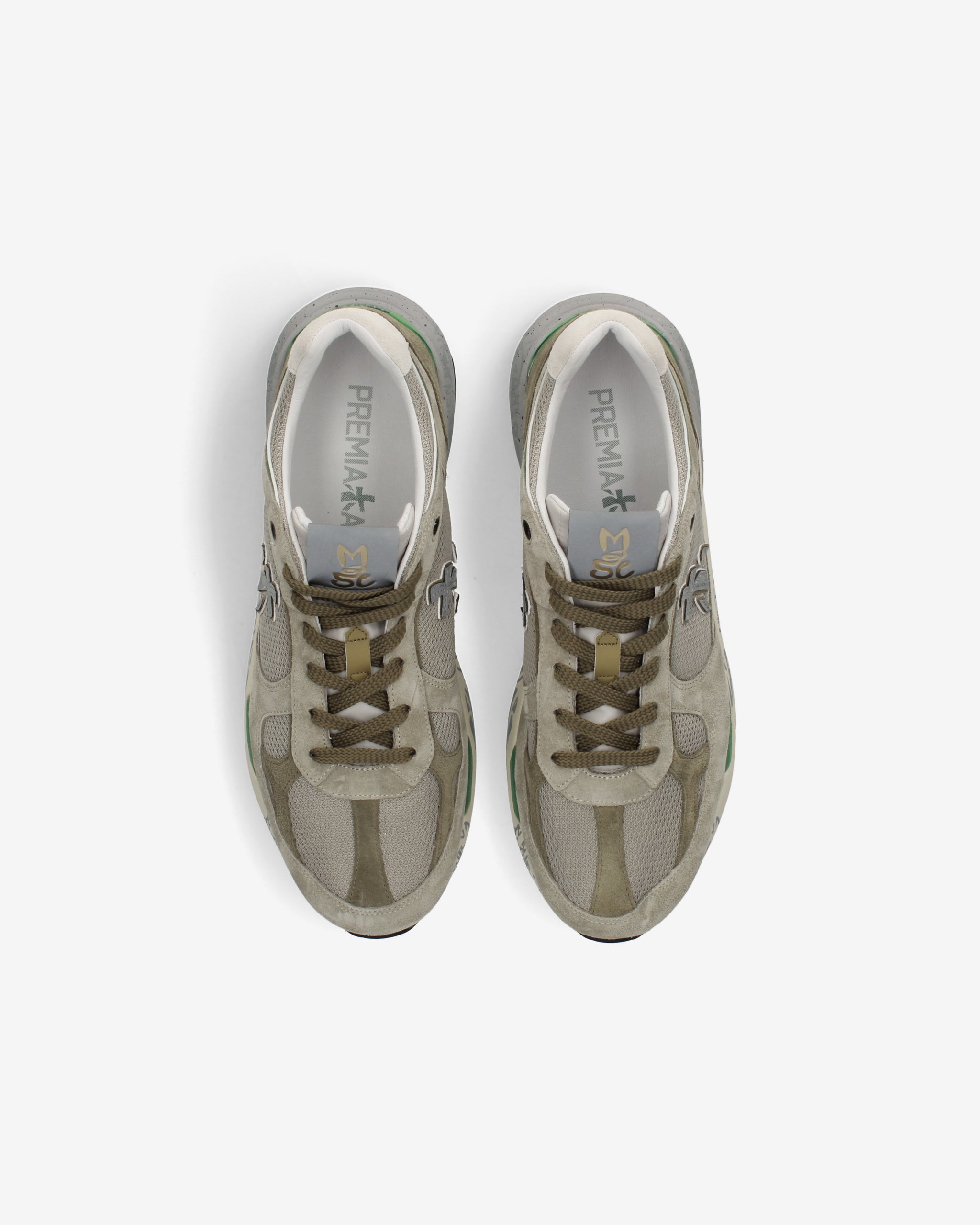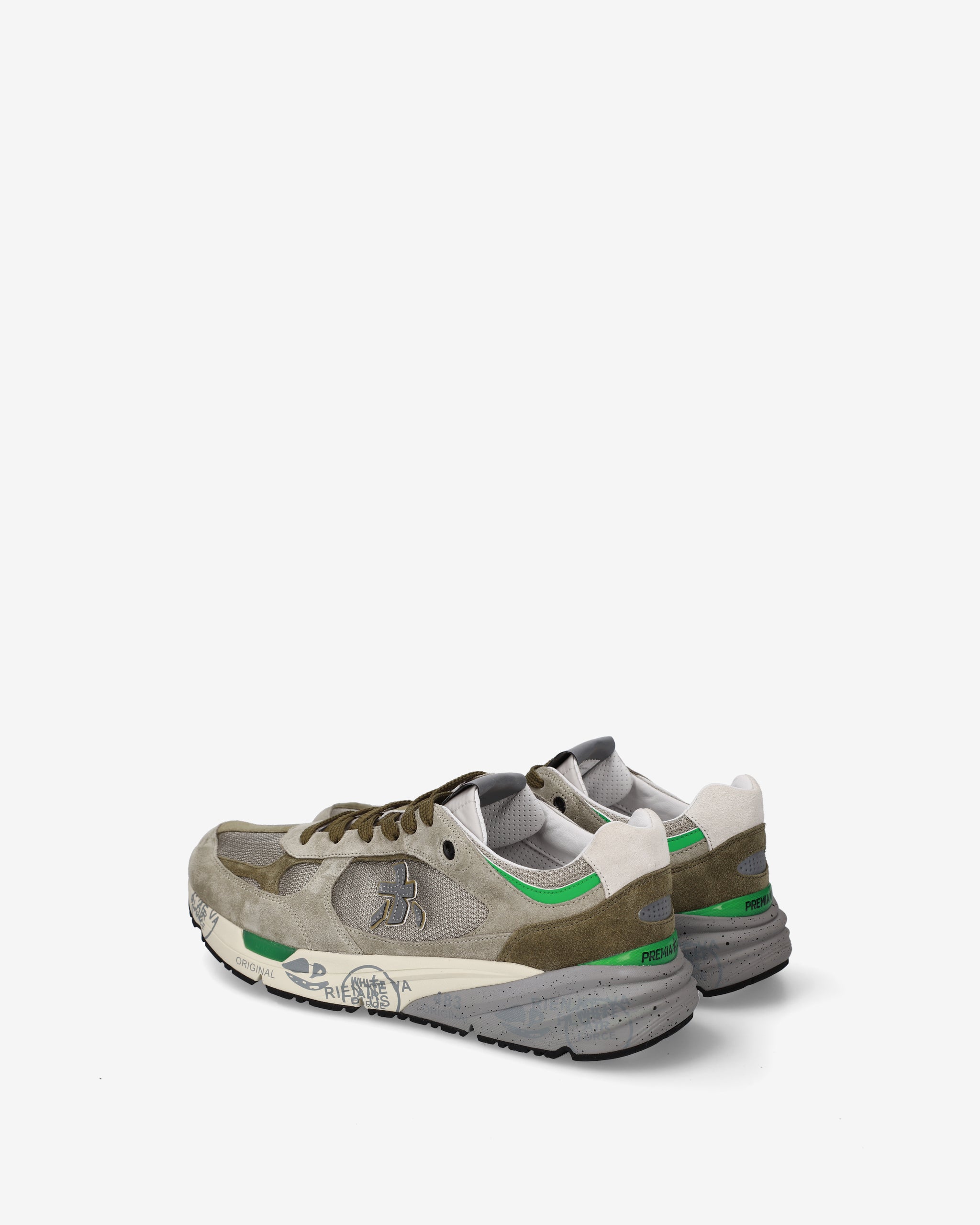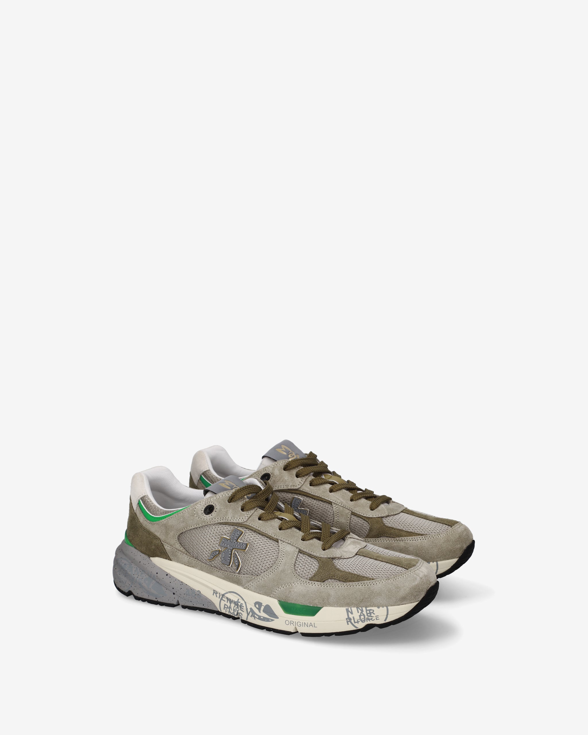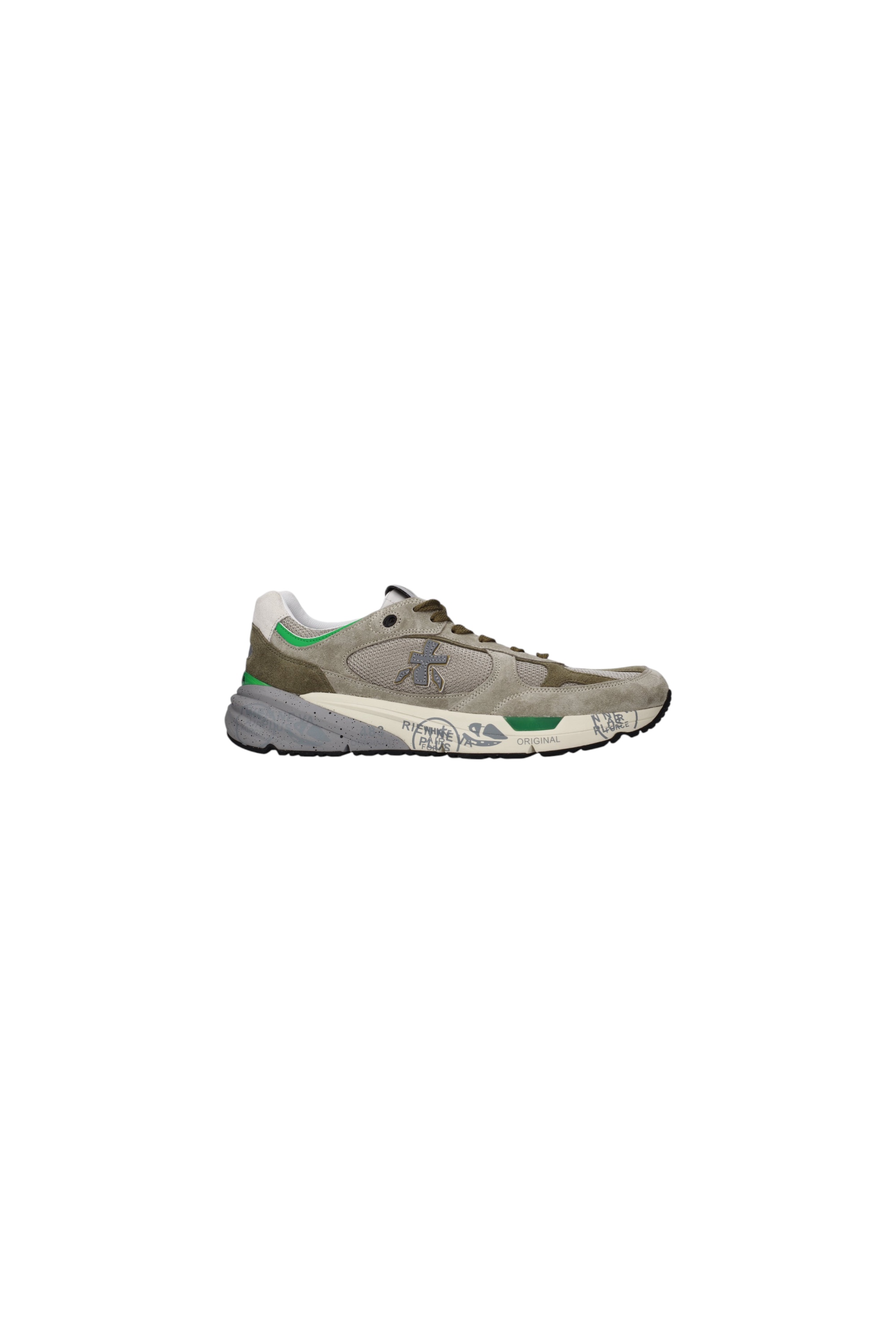 Комбинированные кроссовки с закругленным мысом и функциональной шнуровкой на легкой упругой подошве со знаковыми печатями и штампами декорированы по бокам фирменными иероглифами бренда.