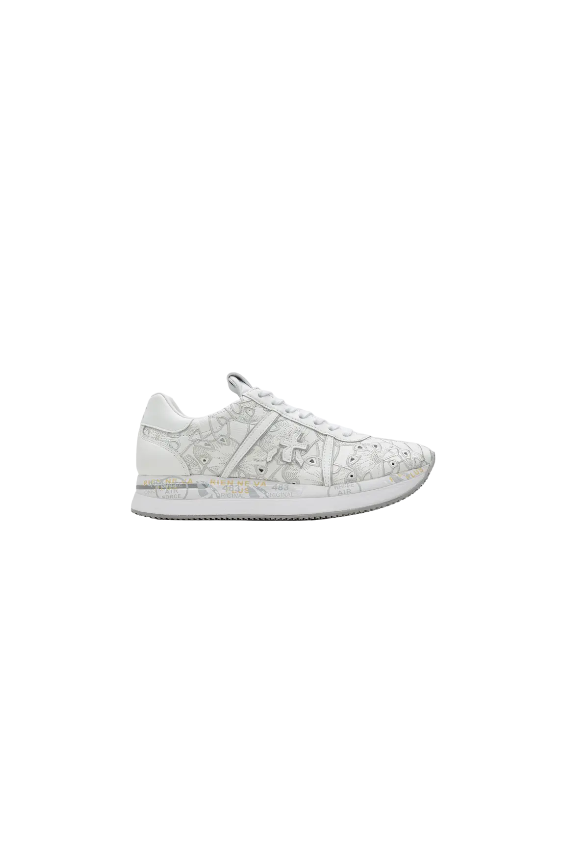 Кроссовки CONNY из кожи кенгуру с вышитым узором и перфорацией на высокой подошве с мелким протектором, усиленными задниками, защитой мыска и цветным принтом в виде печатей украшены по бокам фирменной аппликацией.