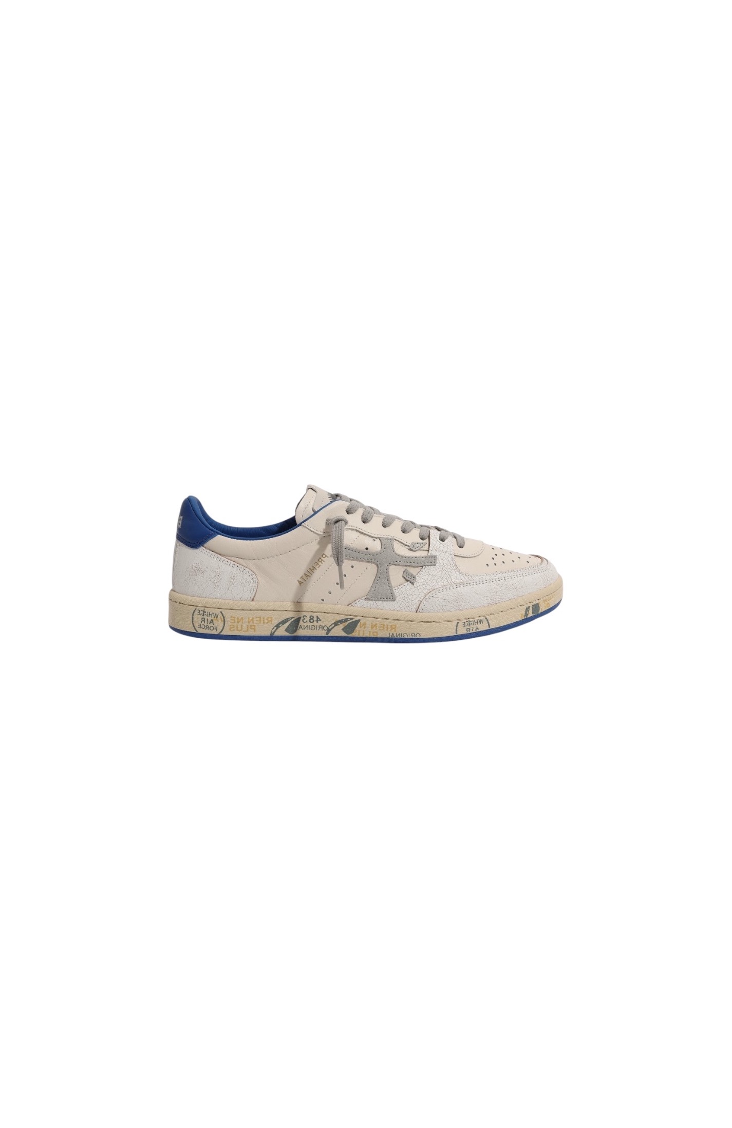 Кеды из матовой кожи ягненка с перфорированным мысом дополнены контрастными задниками, вставками с эффектом кракле и украшена фирменными иероглифами бренда по бокам.