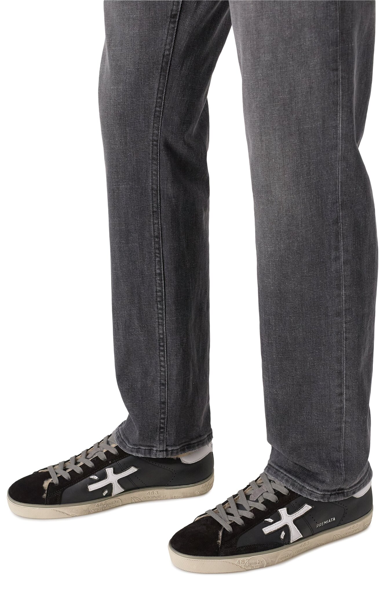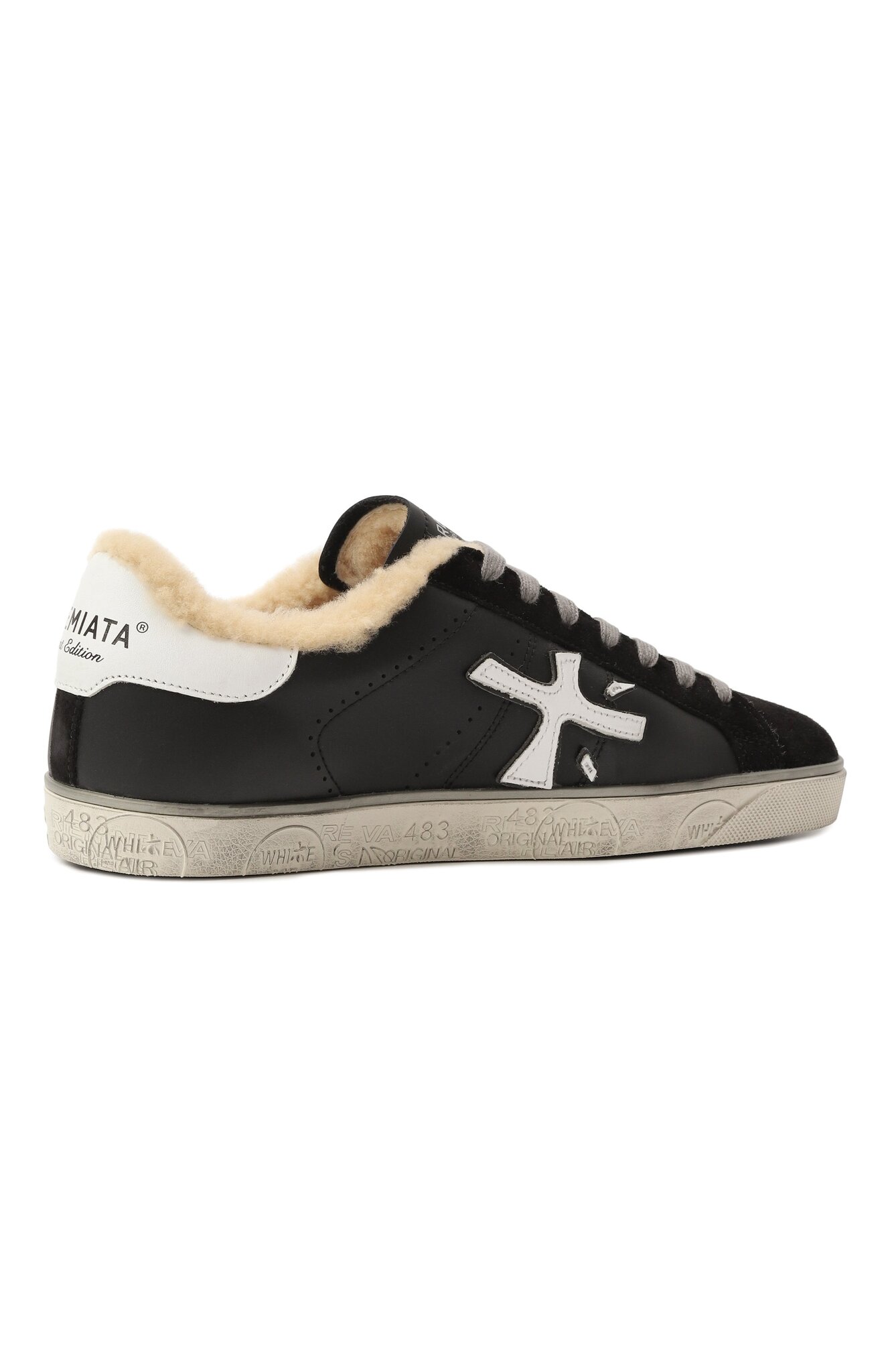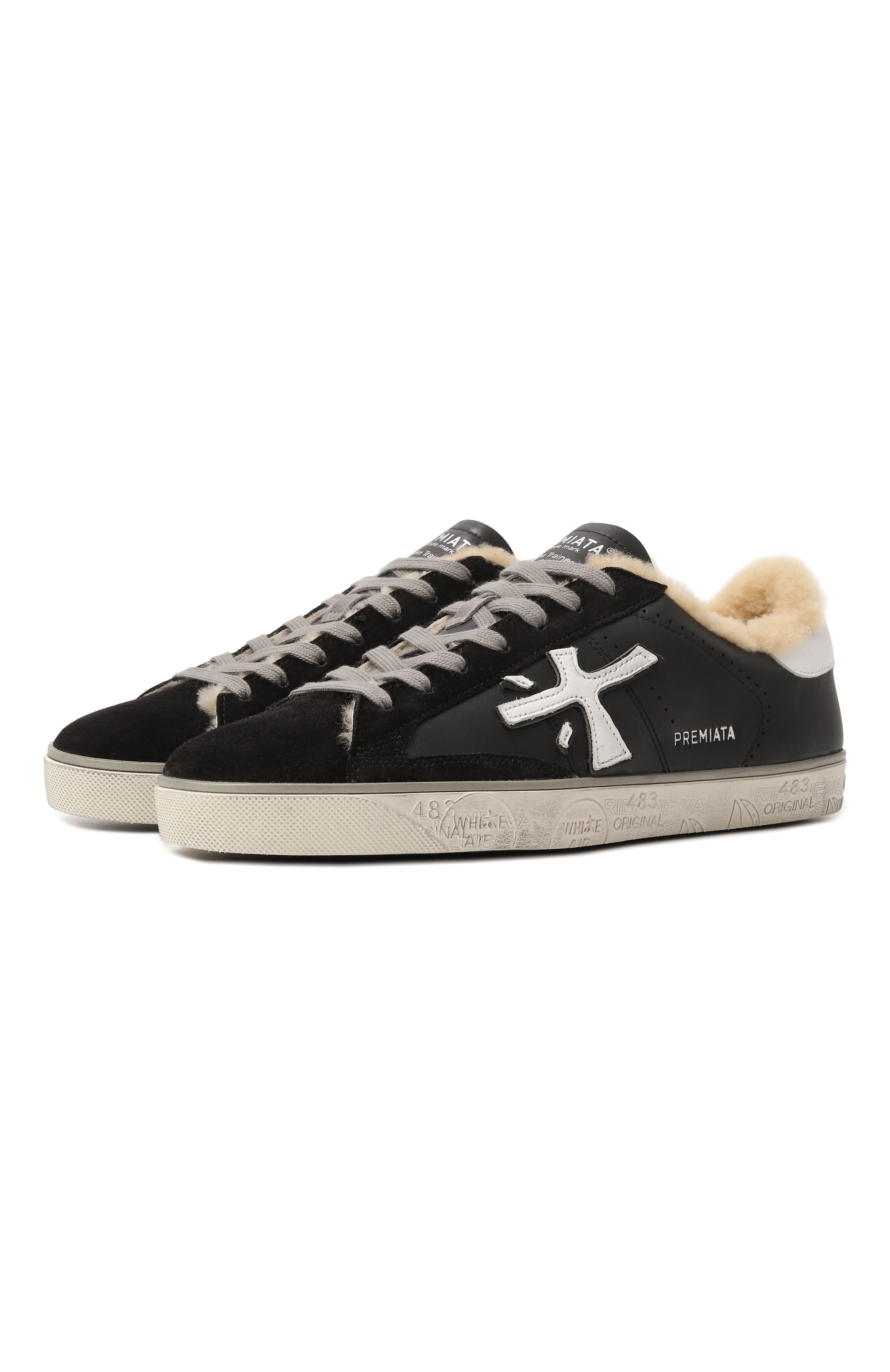 Кеды Steven с внутренней отделкой из овчины выполнили из гладкой телячьей кожи и замши. Модель на брендированной подошве украсили логотипами на язычке и заднике, а также фирменными эмблемами-иероглифами по бокам.