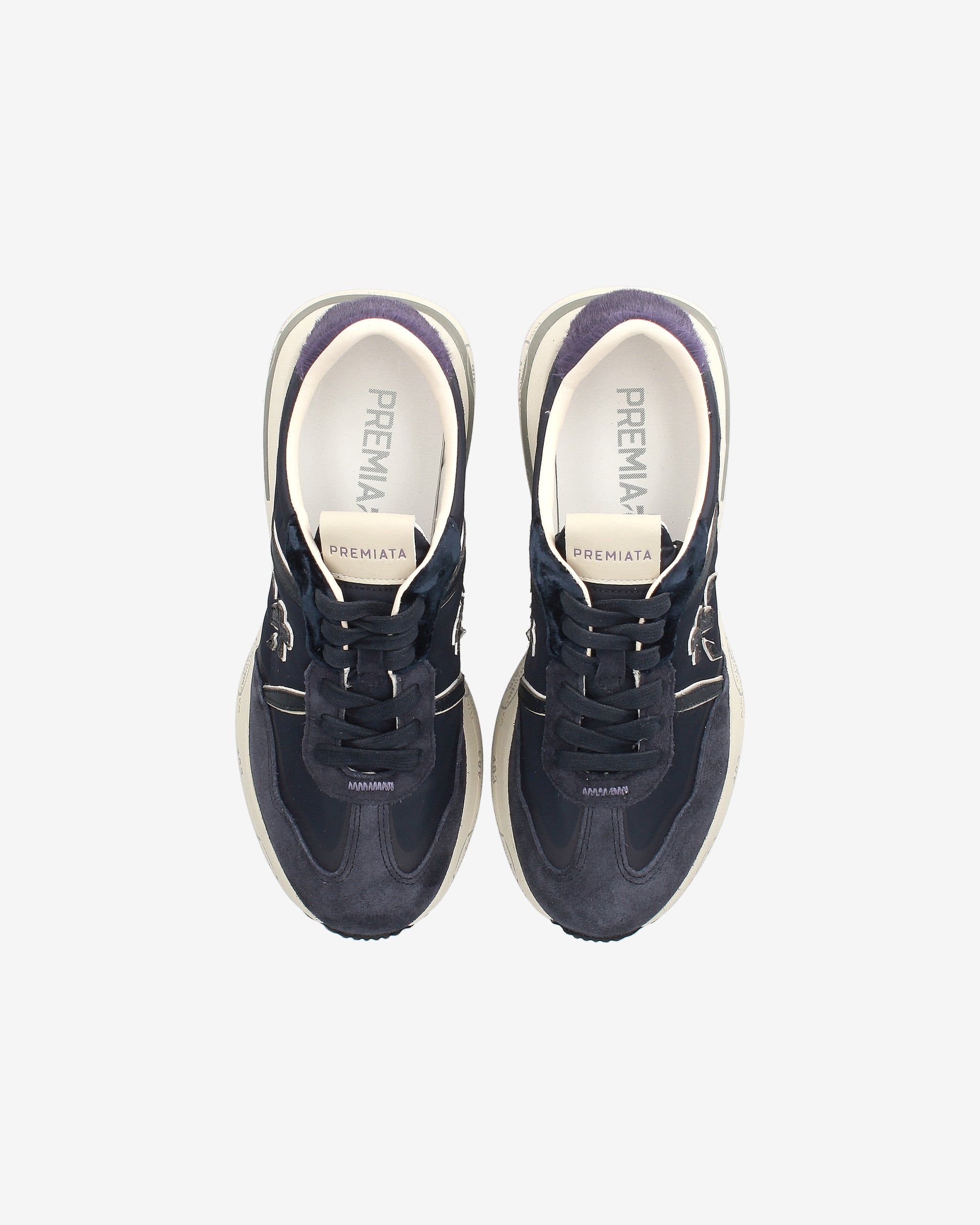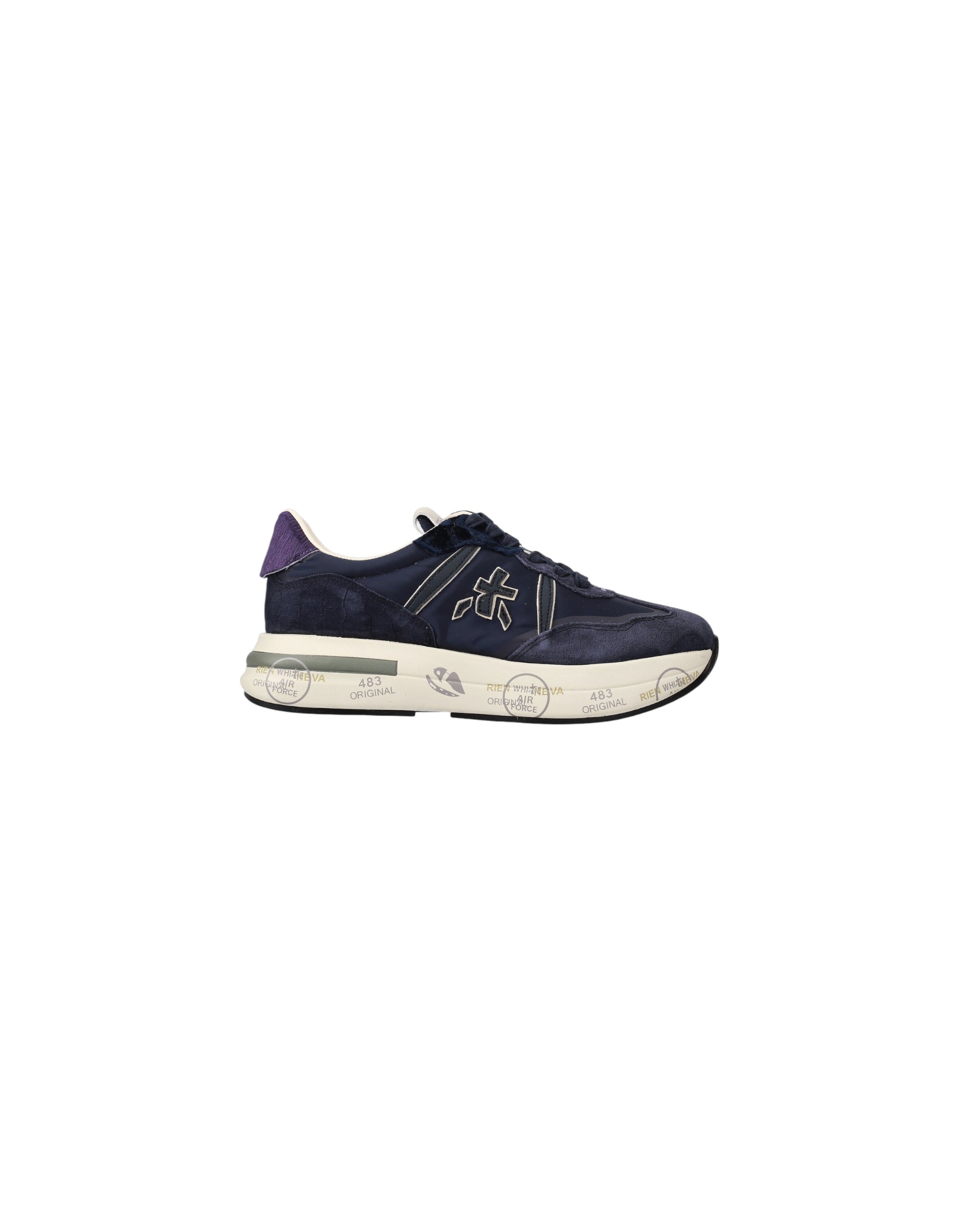 Комбинированные кроссовки CASSIE на толстой подошвой с принтом в виде печатей украшены фирменными иероглифами бренда по бокам.