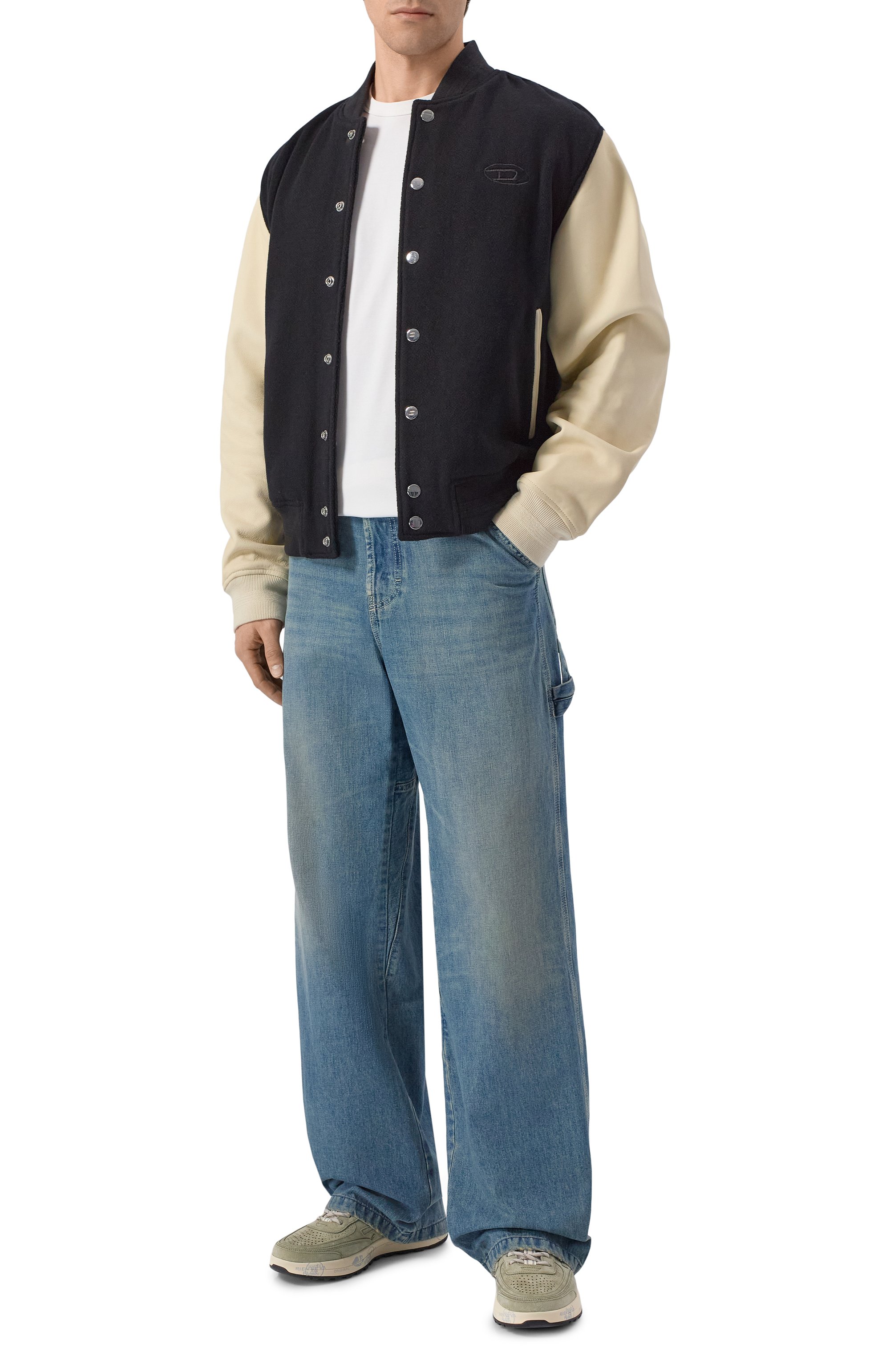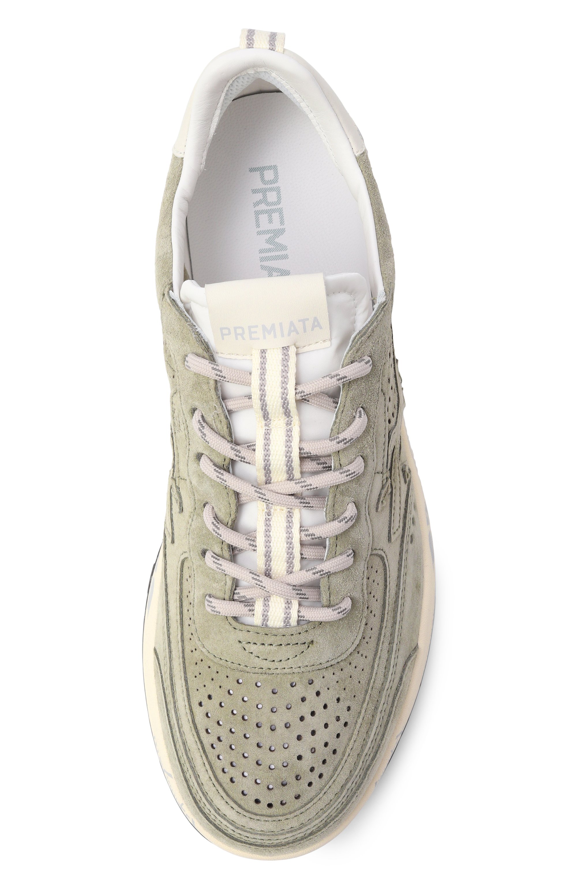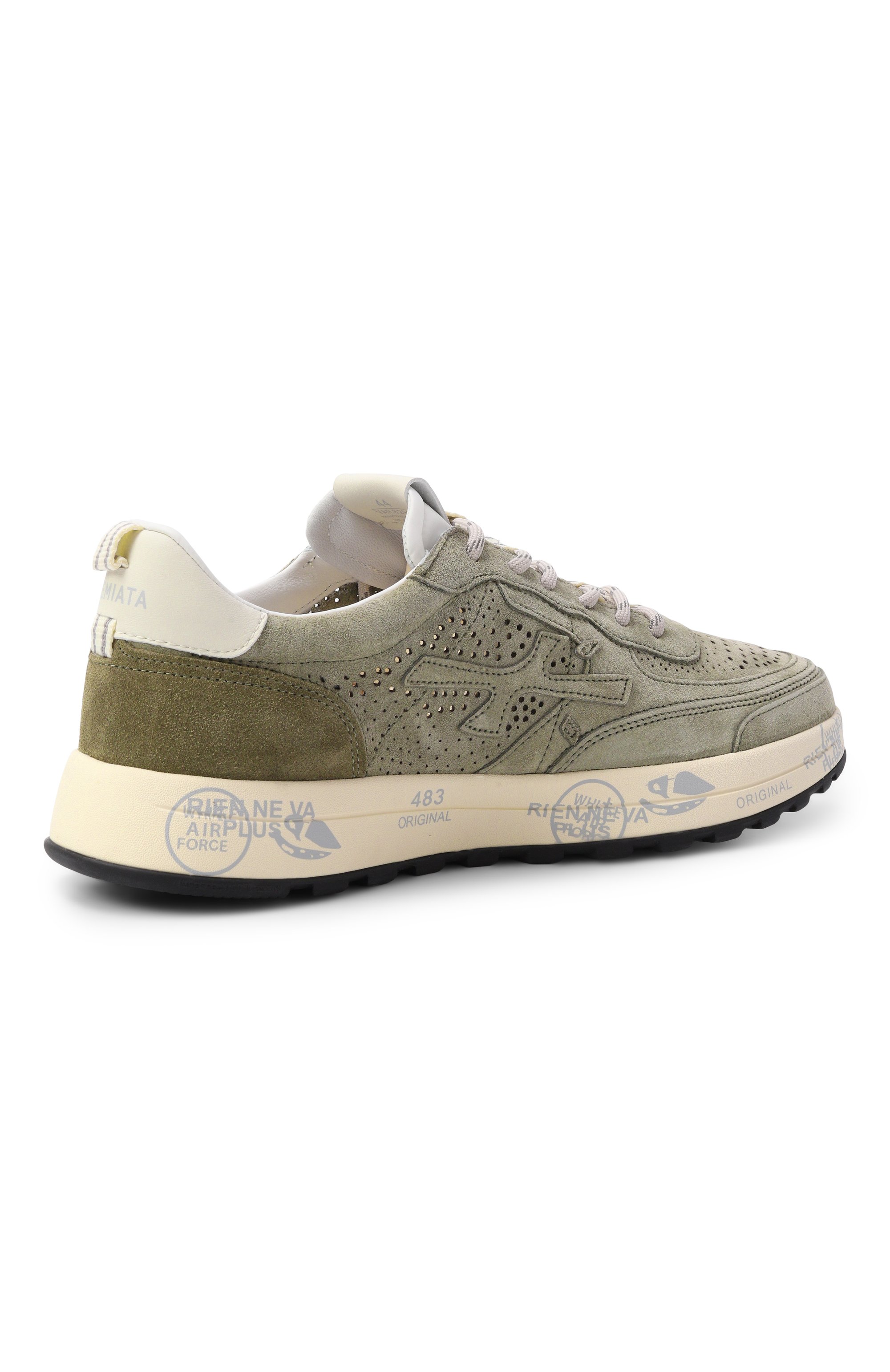 Кроссовки Nous с перфорацией из замши, полимера и текстиля установлены на комбинированную подошву со знаковыми печатями и штампами. Пару дополнили фирменными иероглифами по бокам и брендированной нашивкой на язычке, которой вторит вставка на заднике.