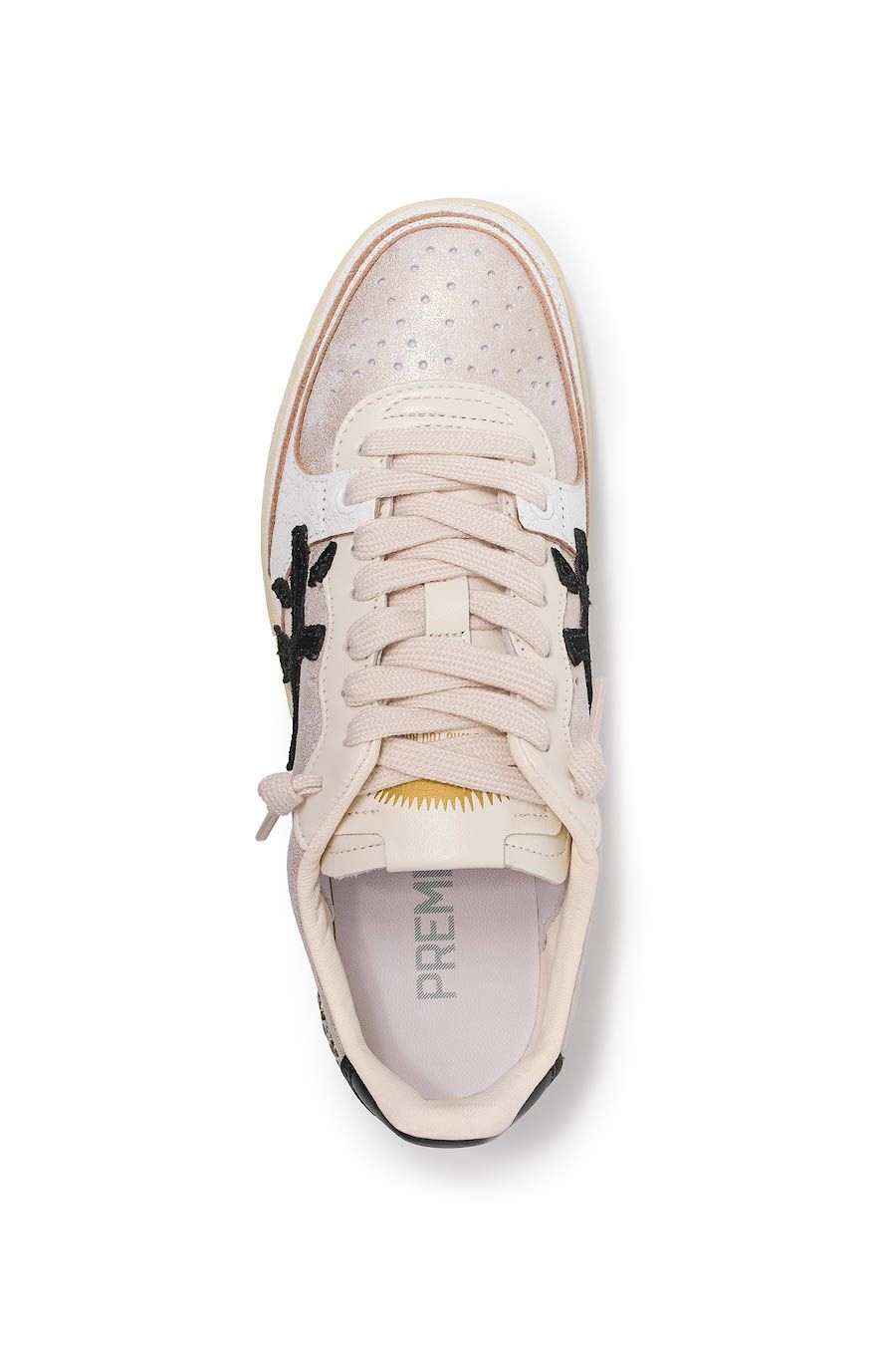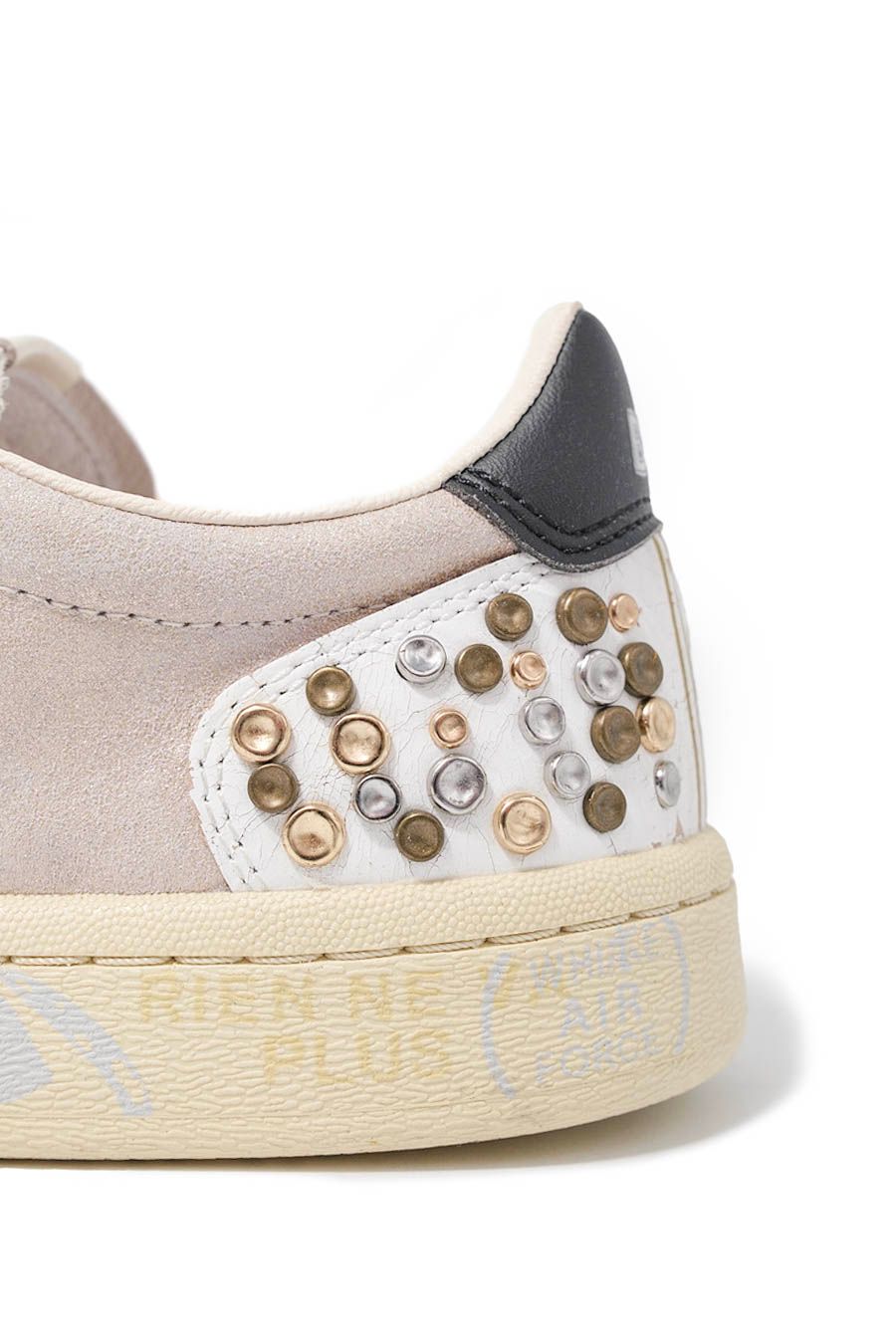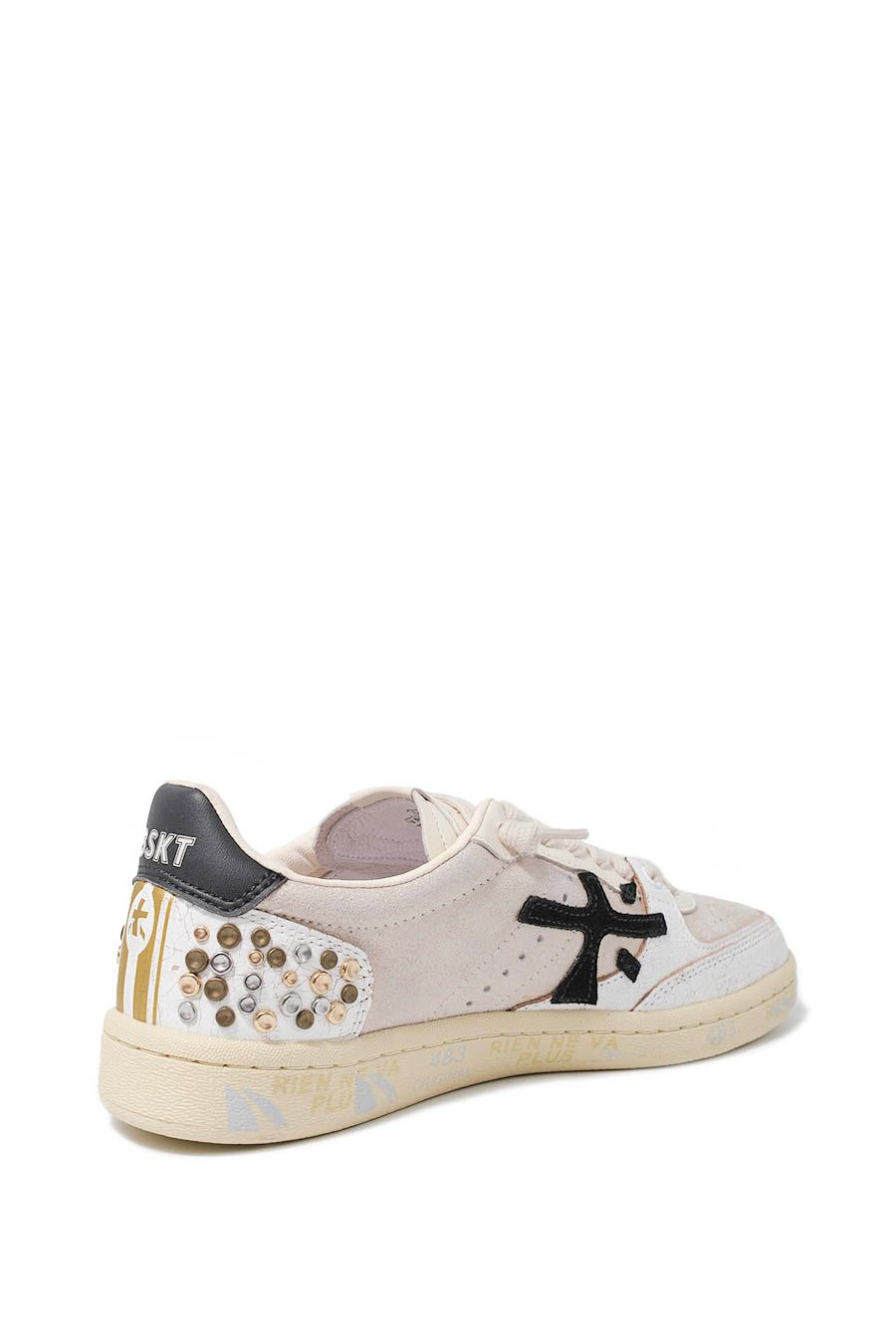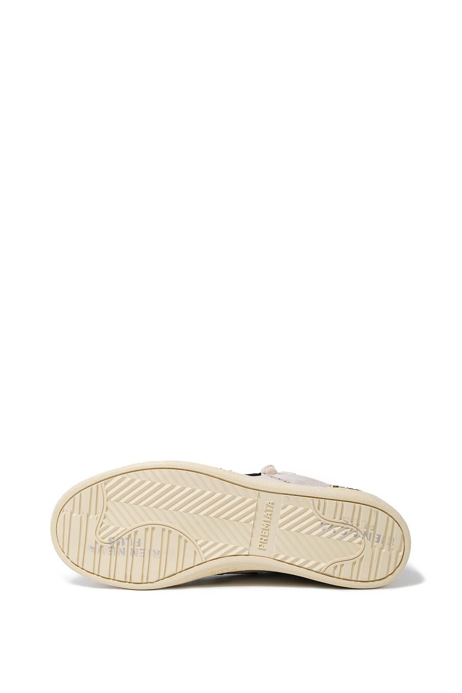 Кеды с перфорацией на мысе и по бокам из гладкой мягкой кожи и отделкой с эффектом кракелюра дополнили брендированными задниками и бархатистыми черными аппликациями в виде иероглифов на боковых панелях и печатями на гибкой нескользящей подошве.