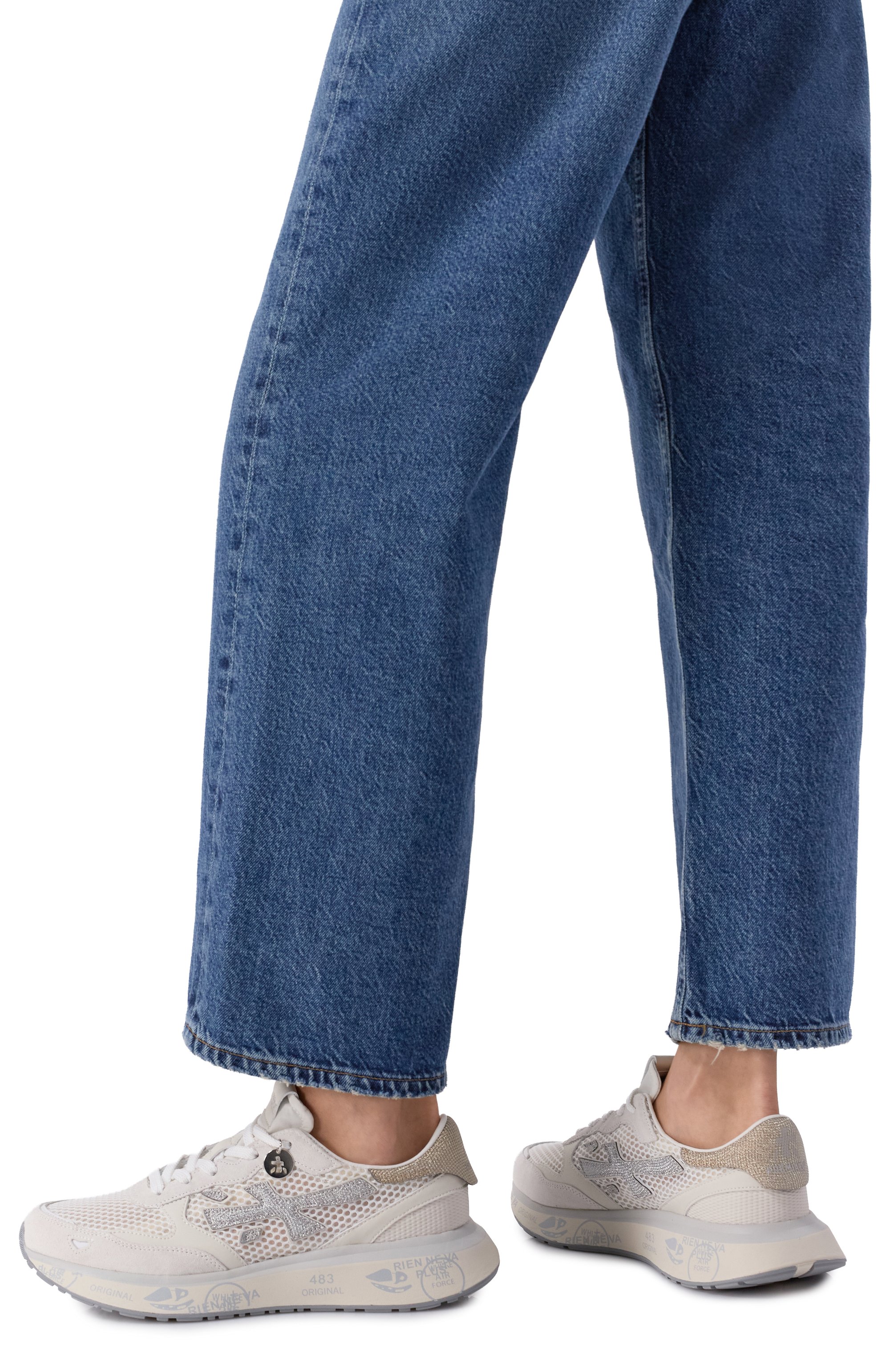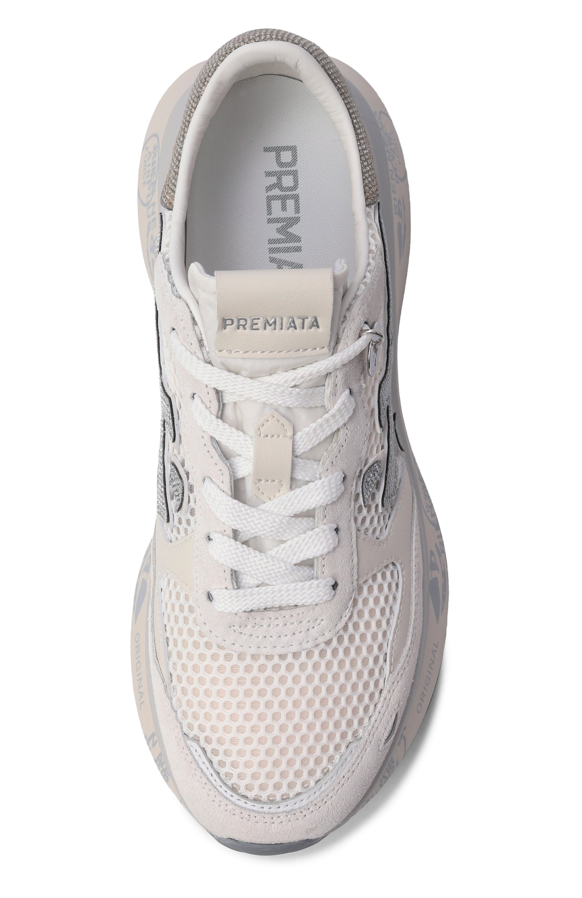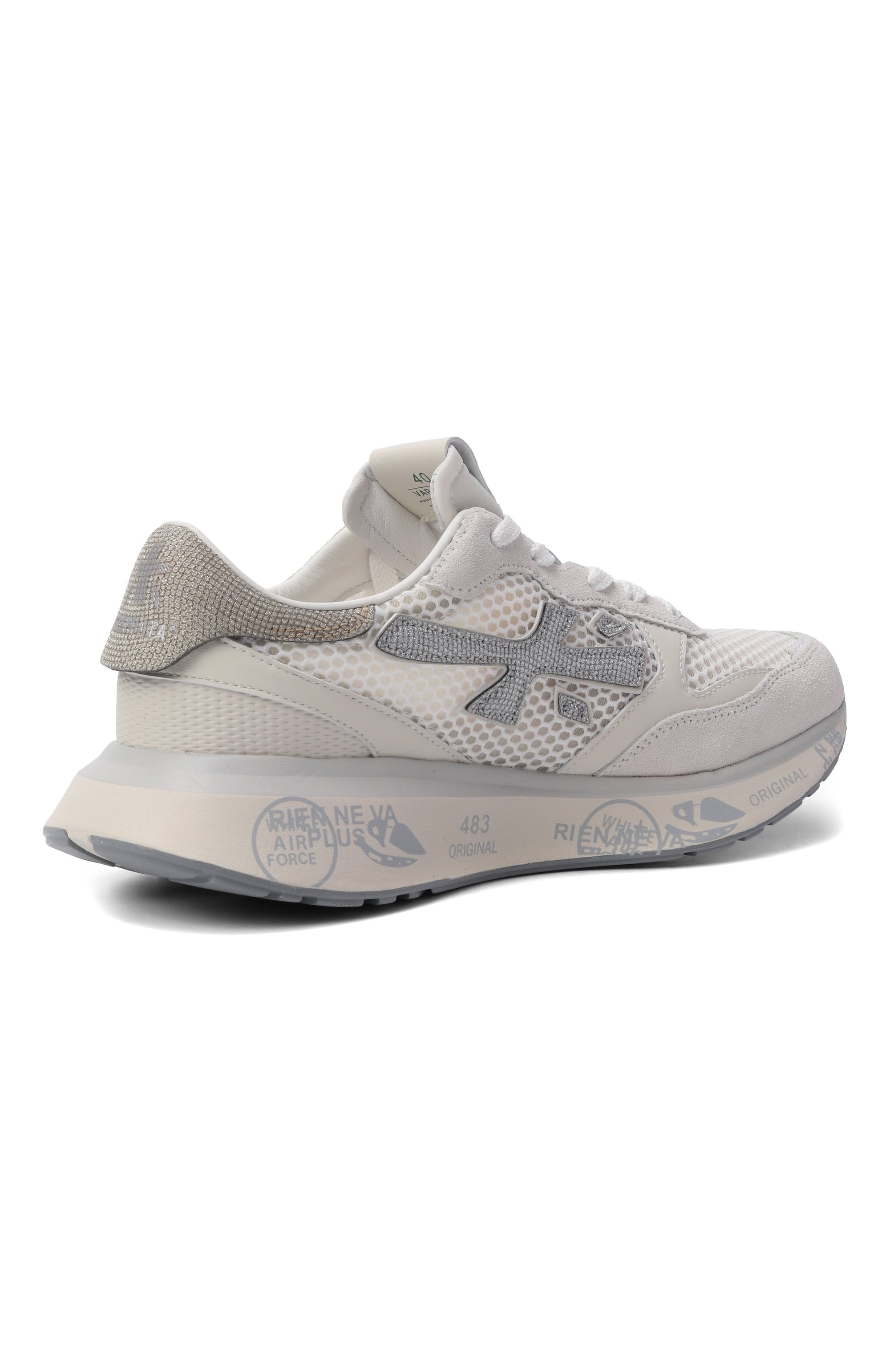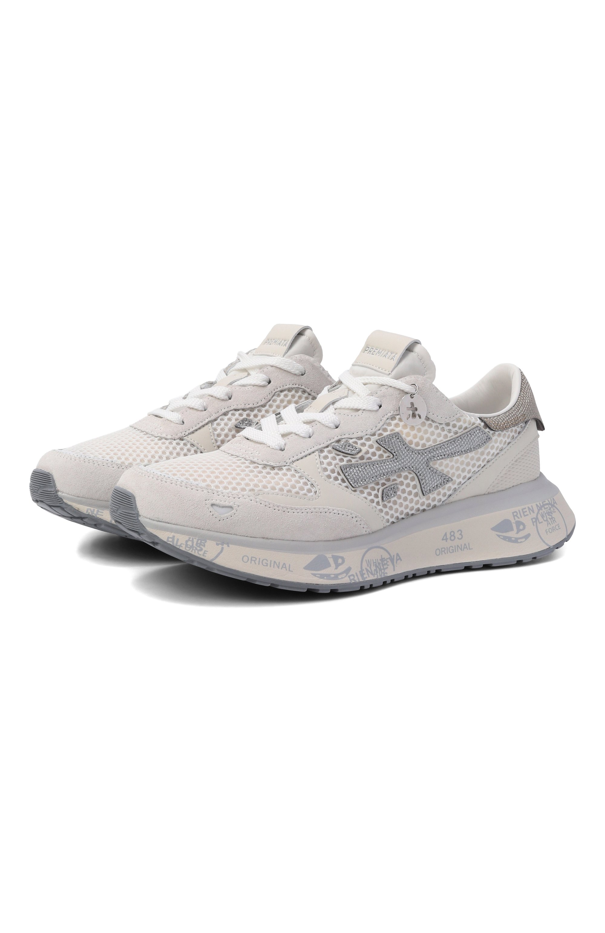 Кроссовки из комбинации бархатистой замши и высокотехнологичного полимера на массивной подошве с амортизацией дополнены эффектными сверкающими деталями.