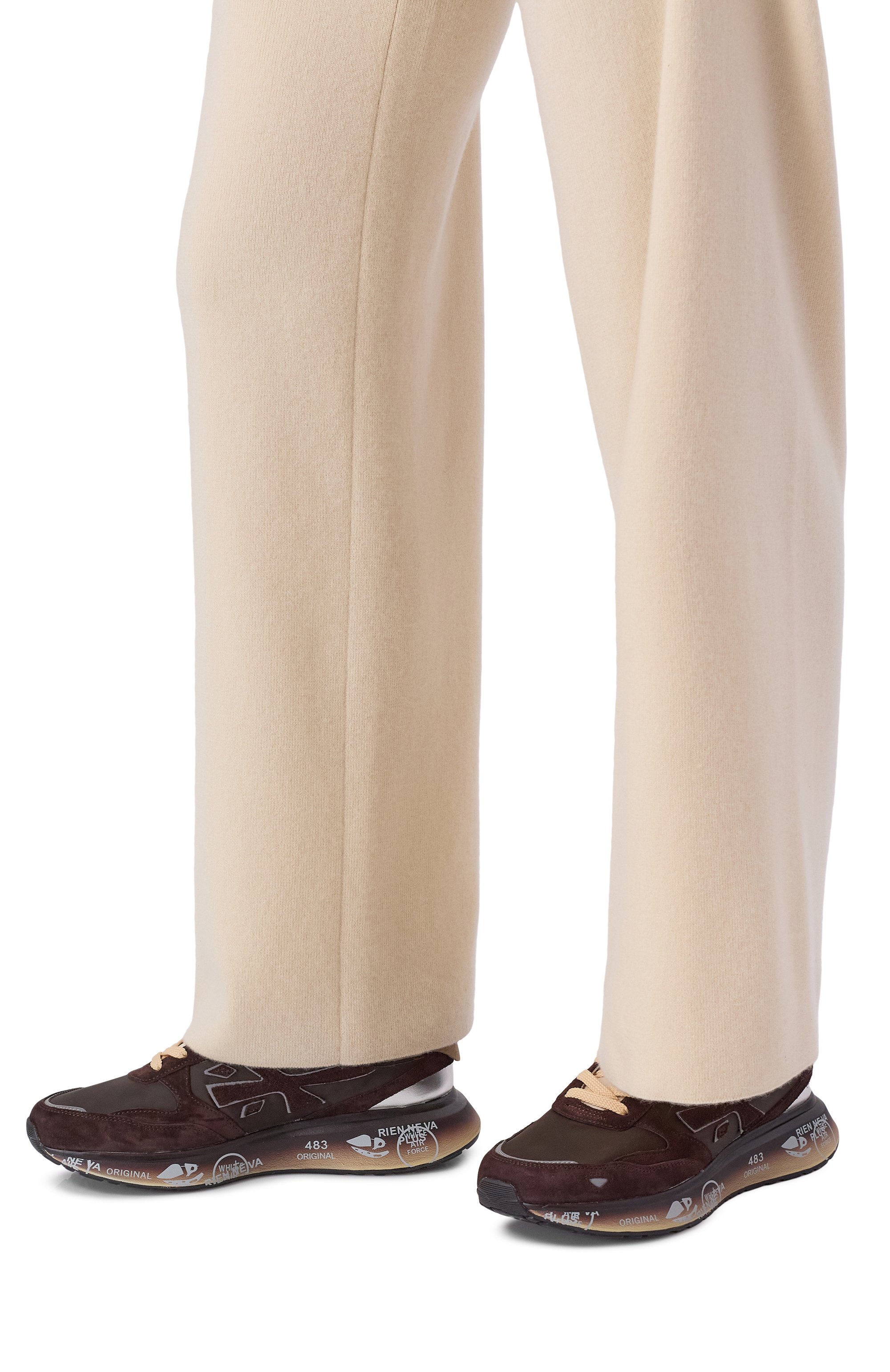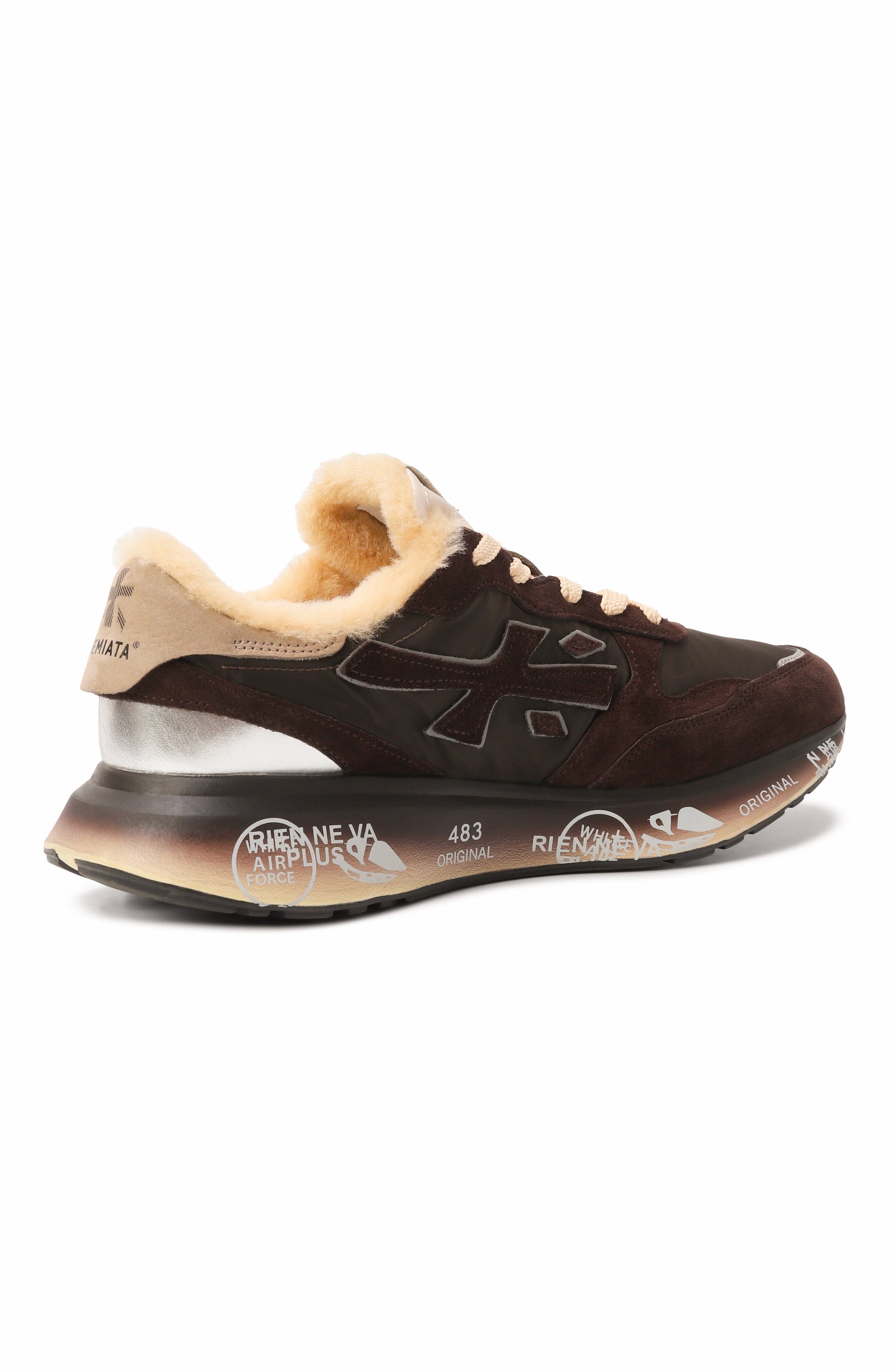 Кроссовки, утепленные овчиной, установили на брендированную подошву с градиентным окрашиванием и украсили нашивкой на язычке, логотипом на заднике и фирменными иероглифами по бокам.