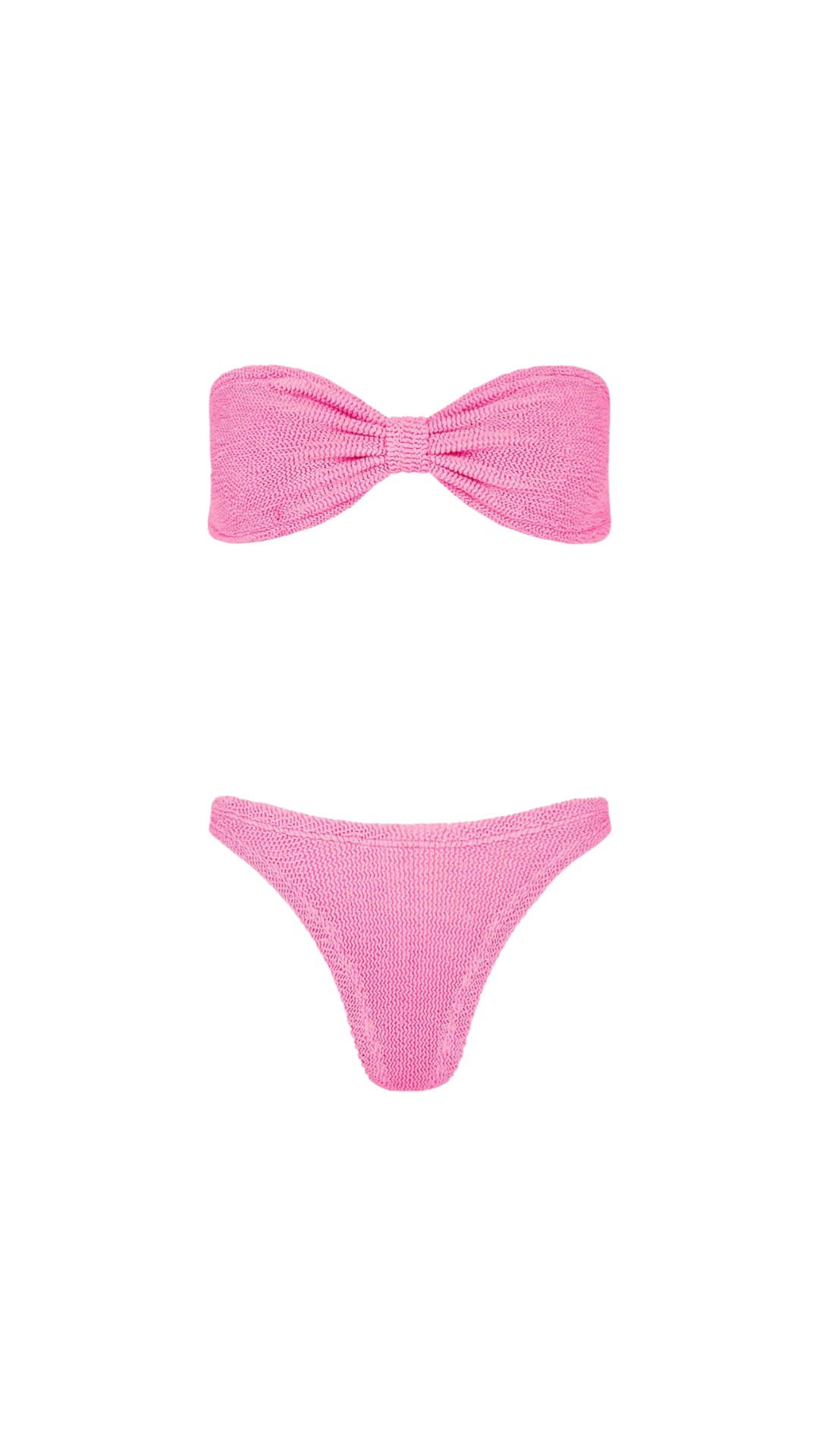Раздельный купальник из материала, знакового для изделий бренда, текстиль которого легко узнать по фактуре: множество складок позволяют ему тянуться лучше других тканей и садиться точно по фигуре от XS до XL, благодаря такому свойству бра-бандо с перемычкой в центре не нужна силиконовая лента по периметру, а плавки обходятся без эластичного пояса.