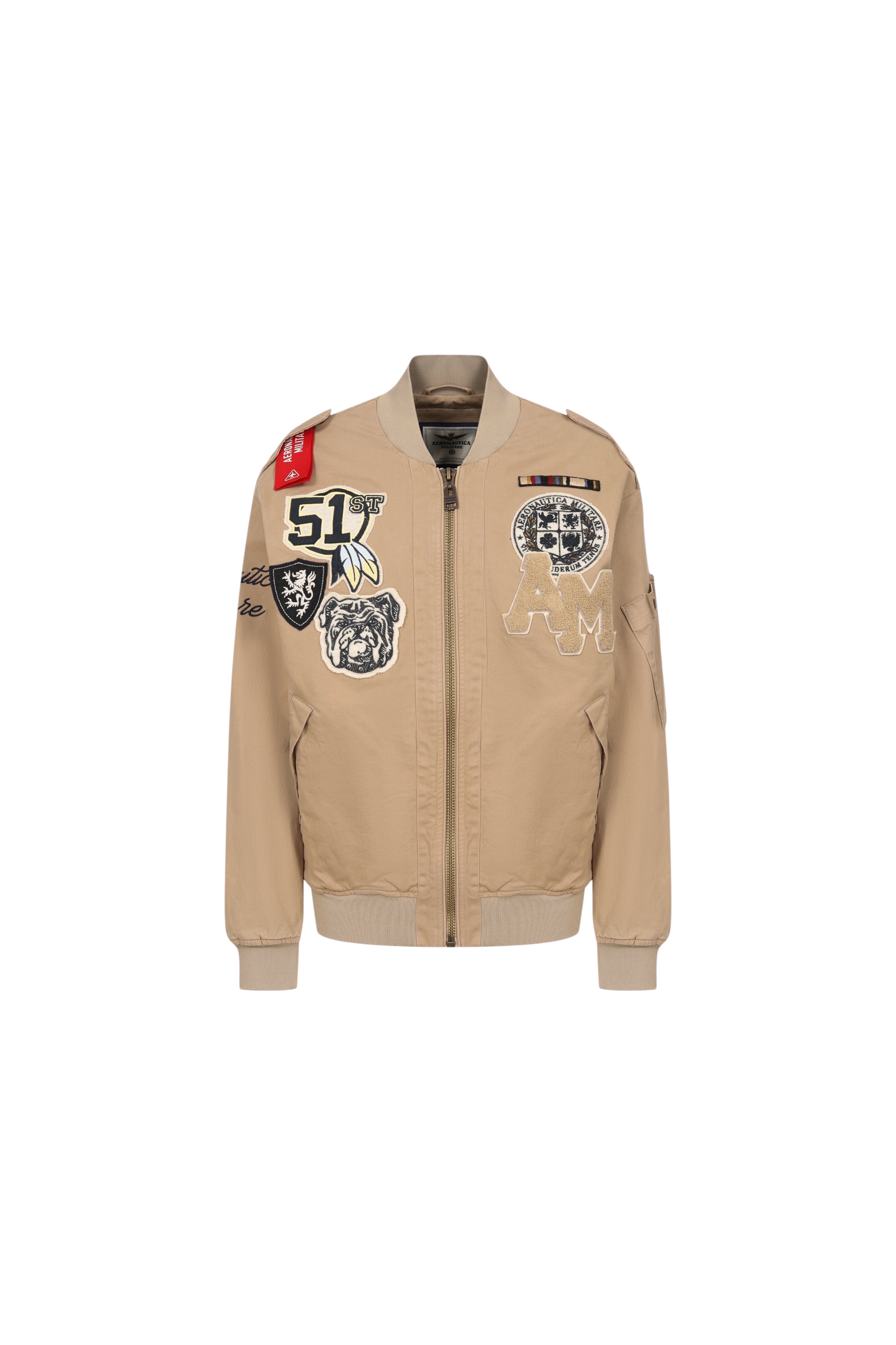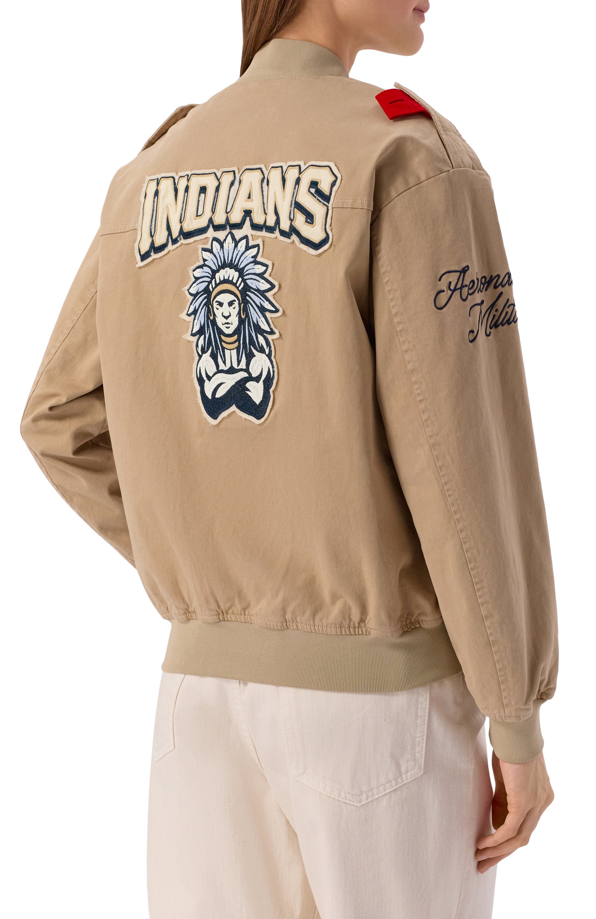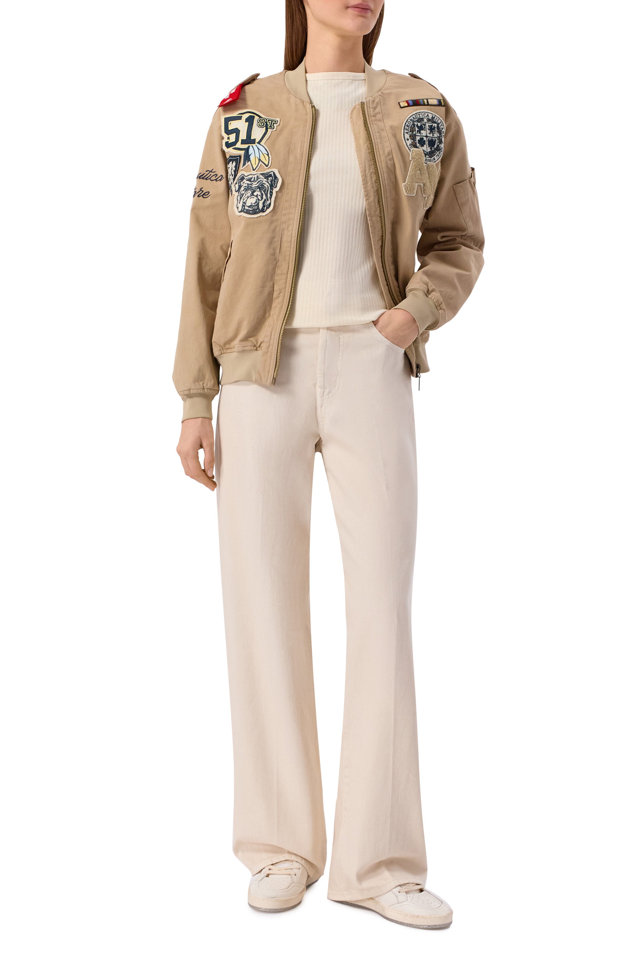 Куртка-бомбер с воротом, поясом и манжетами в рубчик из эластичного хлопкового габардина дополнена боковыми, нарукавным карманами и украшена фирменными нашивками, вышитым логотипом и лентой с надписью Kiss Me Before Flight.