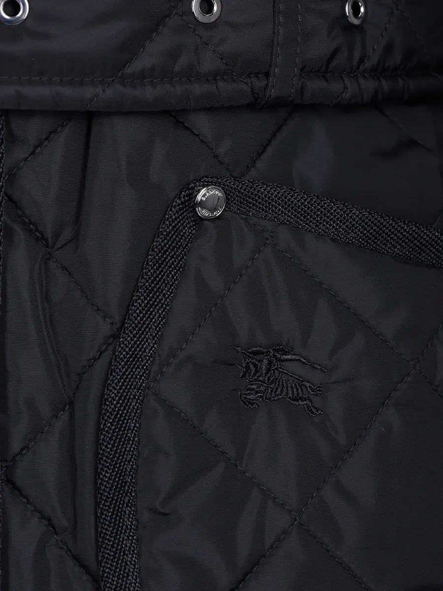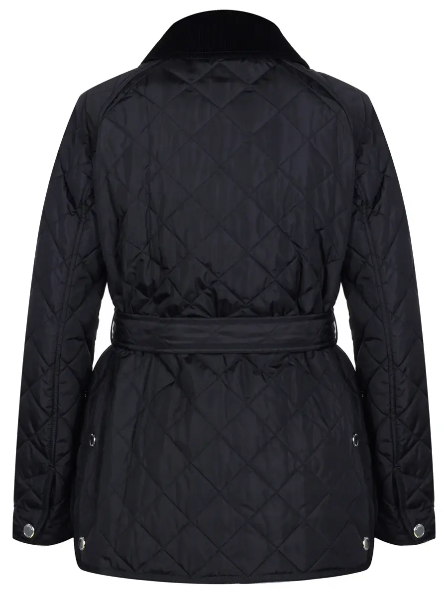 Стеганая куртка в черном цвете прямого кроя с длинными рукавами, отложным воротником, накладными карманами и застежкой на пуговицы. Такая модель прекрасно дополнит повседневные образы с брюками или джинсами.
