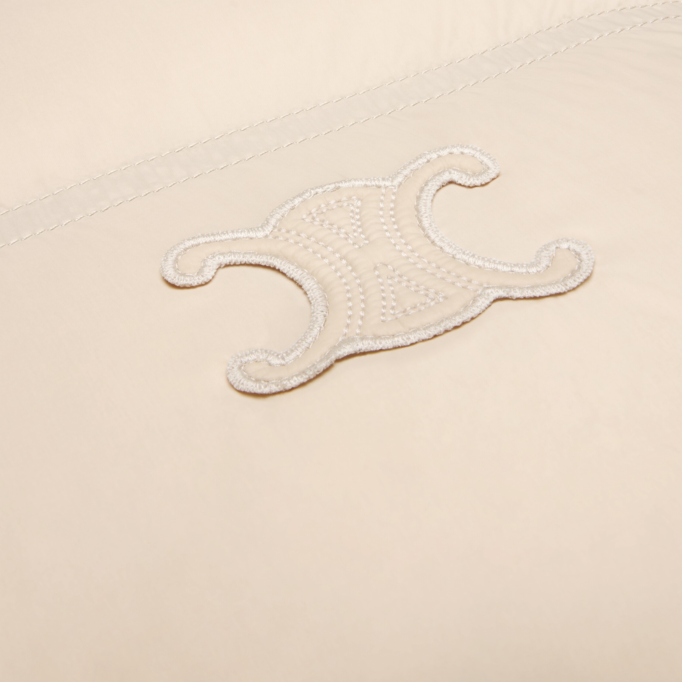 Стеганая куртка свободного силуэта дополнена высоким воротником, регулируемой кулиской снизу, накладными карманами и украшена фирменной эмблемой бренда в тон.