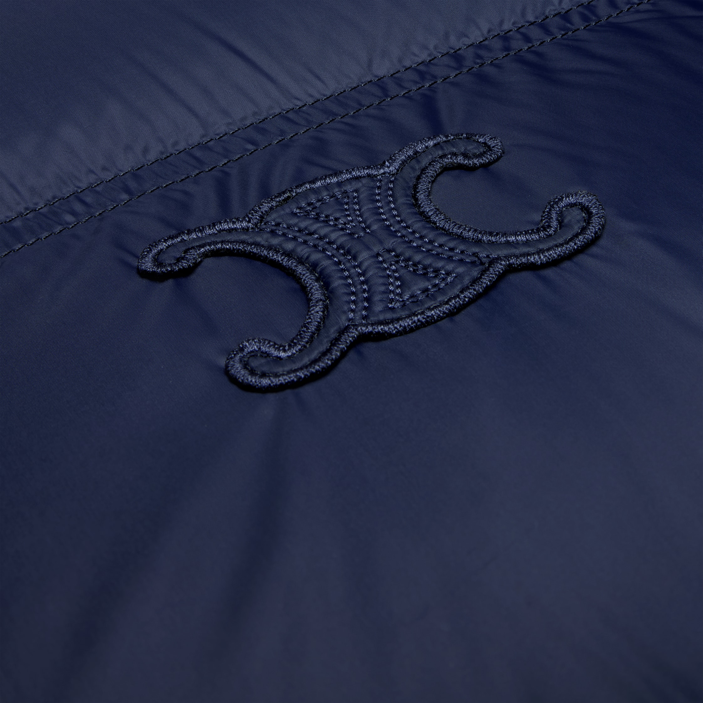 Стеганая куртка свободного силуэта дополнена высоким воротником, регулируемой кулиской снизу, накладными карманами и украшена фирменной эмблемой бренда в тон.