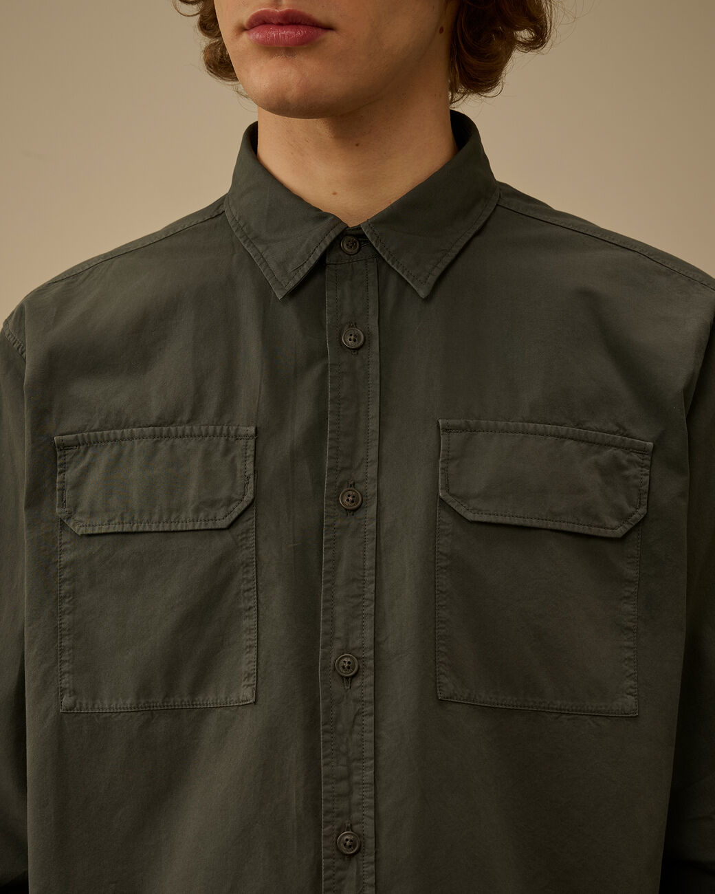 Рубашка из чистого хлопка с застежкой на пуговицы дополнена накладными карманами и украшена фирменной линзой бренда на рукаве.