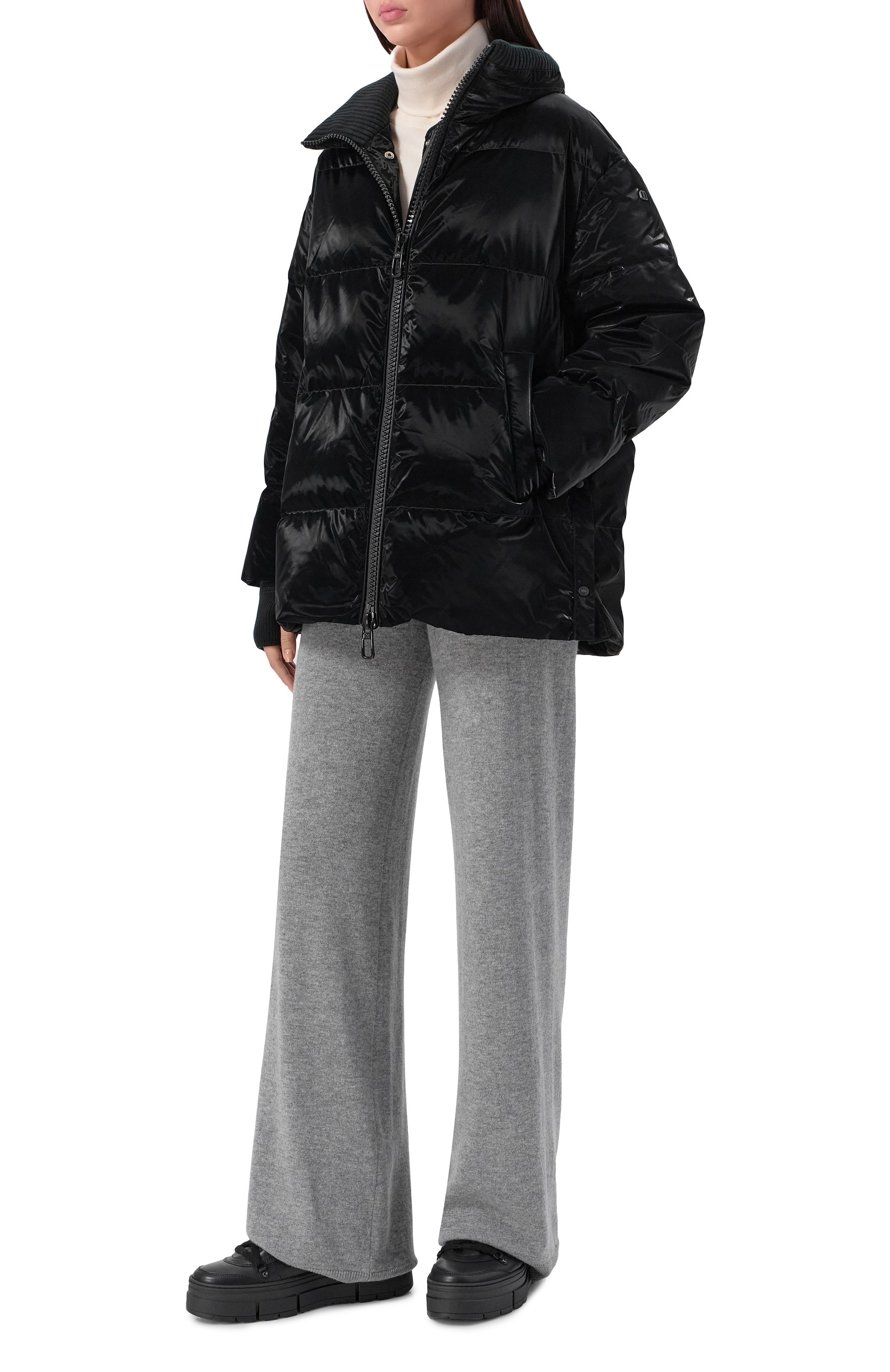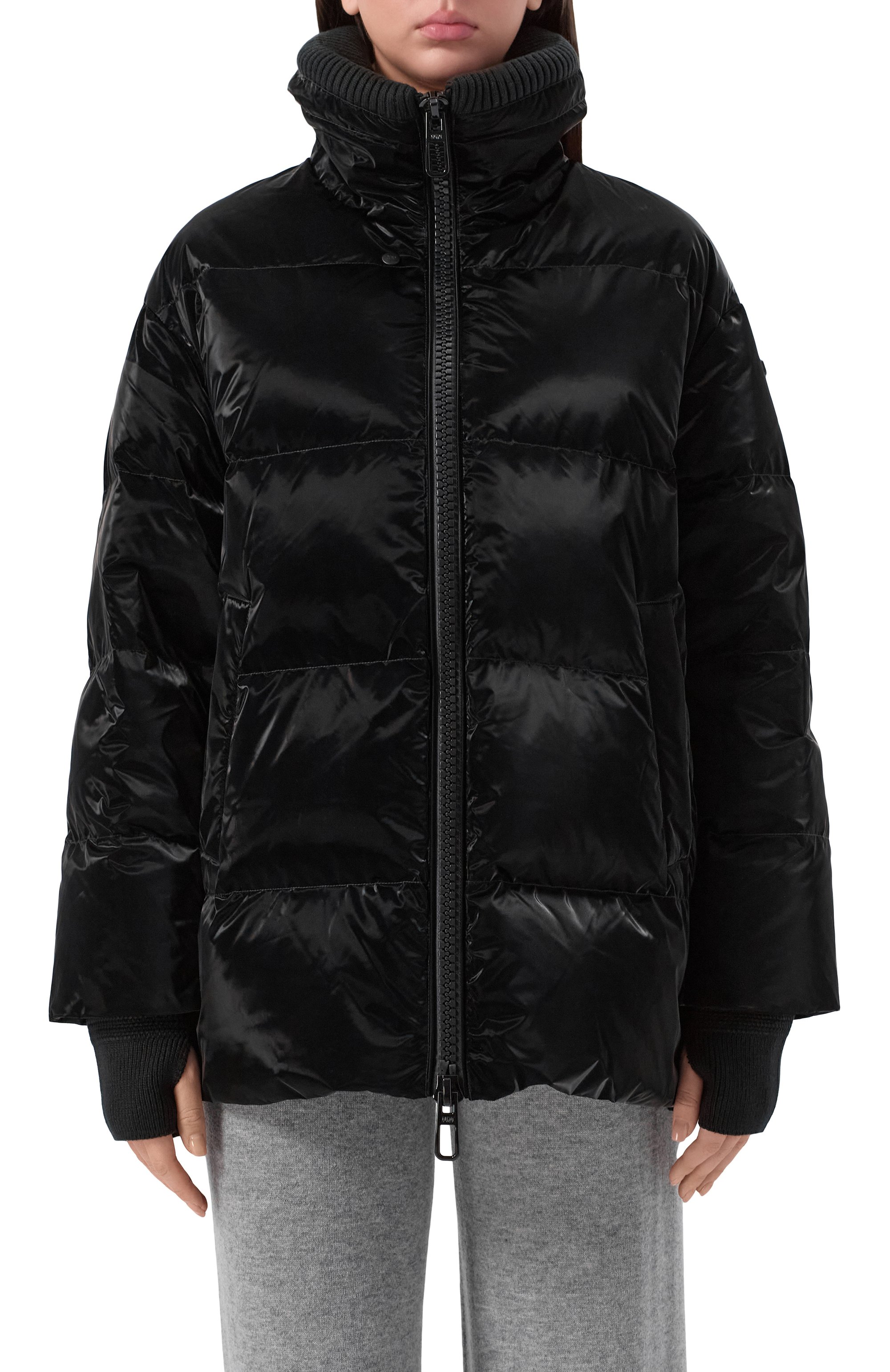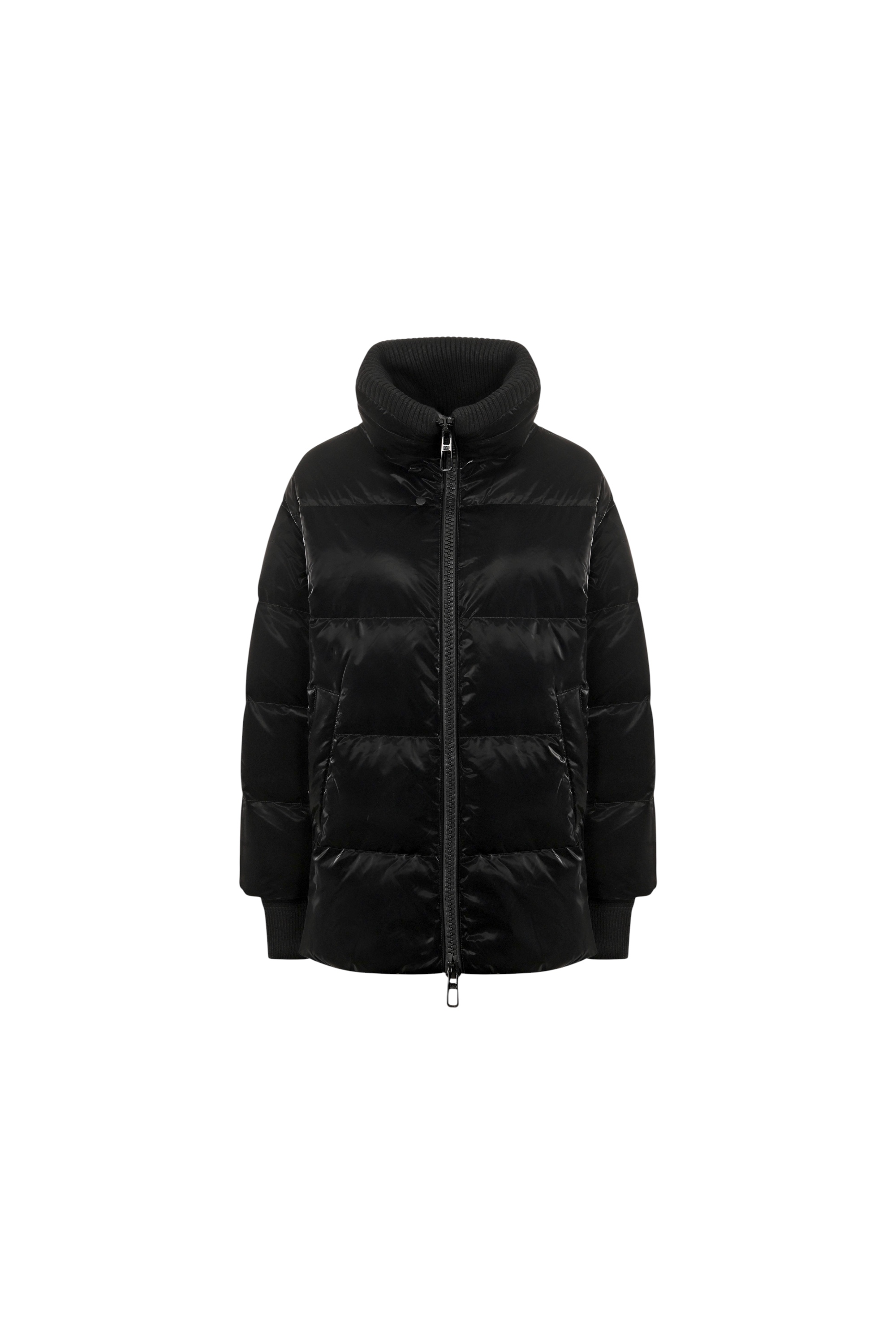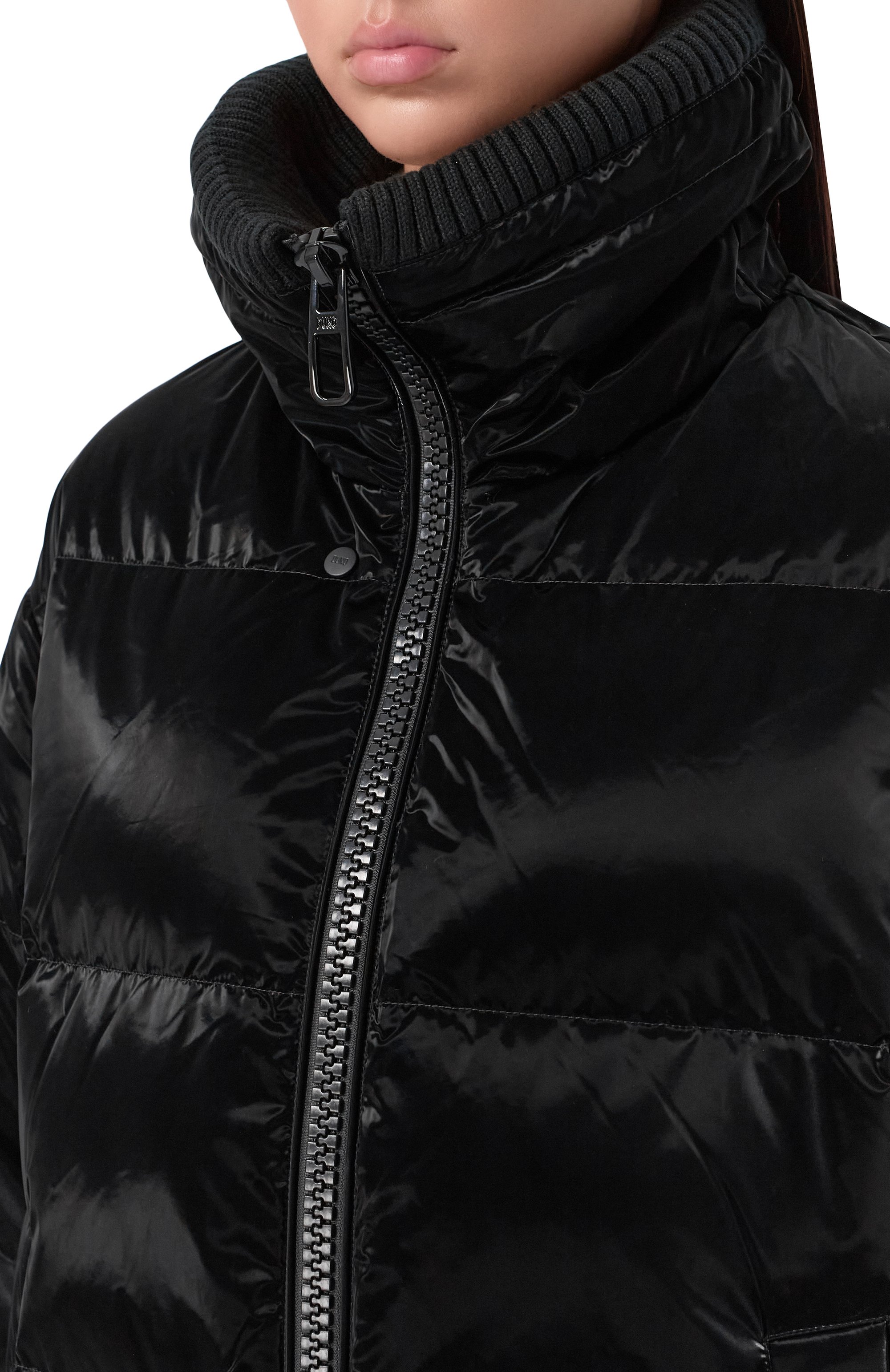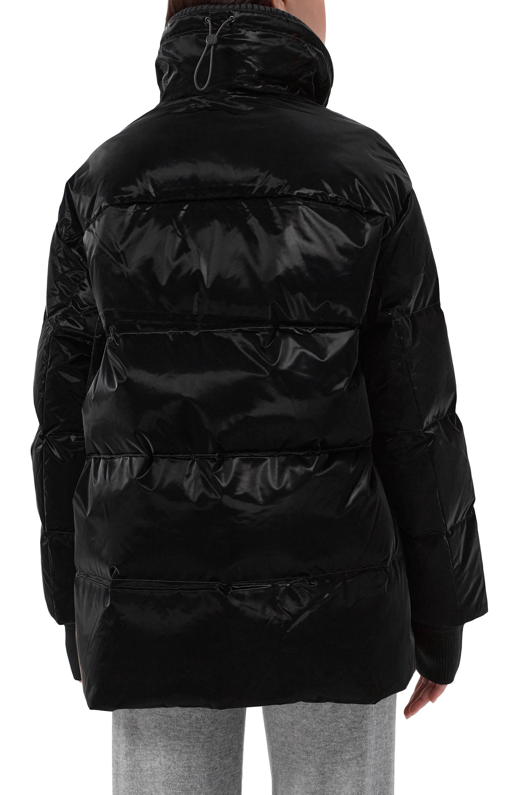 Стеганая куртка Glossy на утином пуху из глянцевого полиуретана с трикотажными манжетами-митенками и вставкой на регулируемом воротнике-стойке застегивается встречной молнией, а разрезы по бокам — кнопками. Изделие с двумя карманами украсили фирменной накладкой на рукаве.