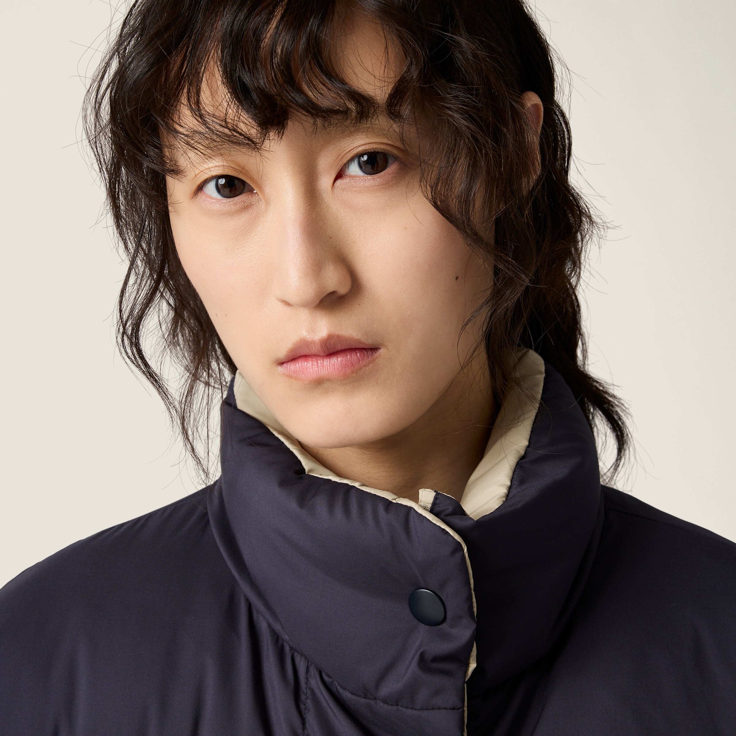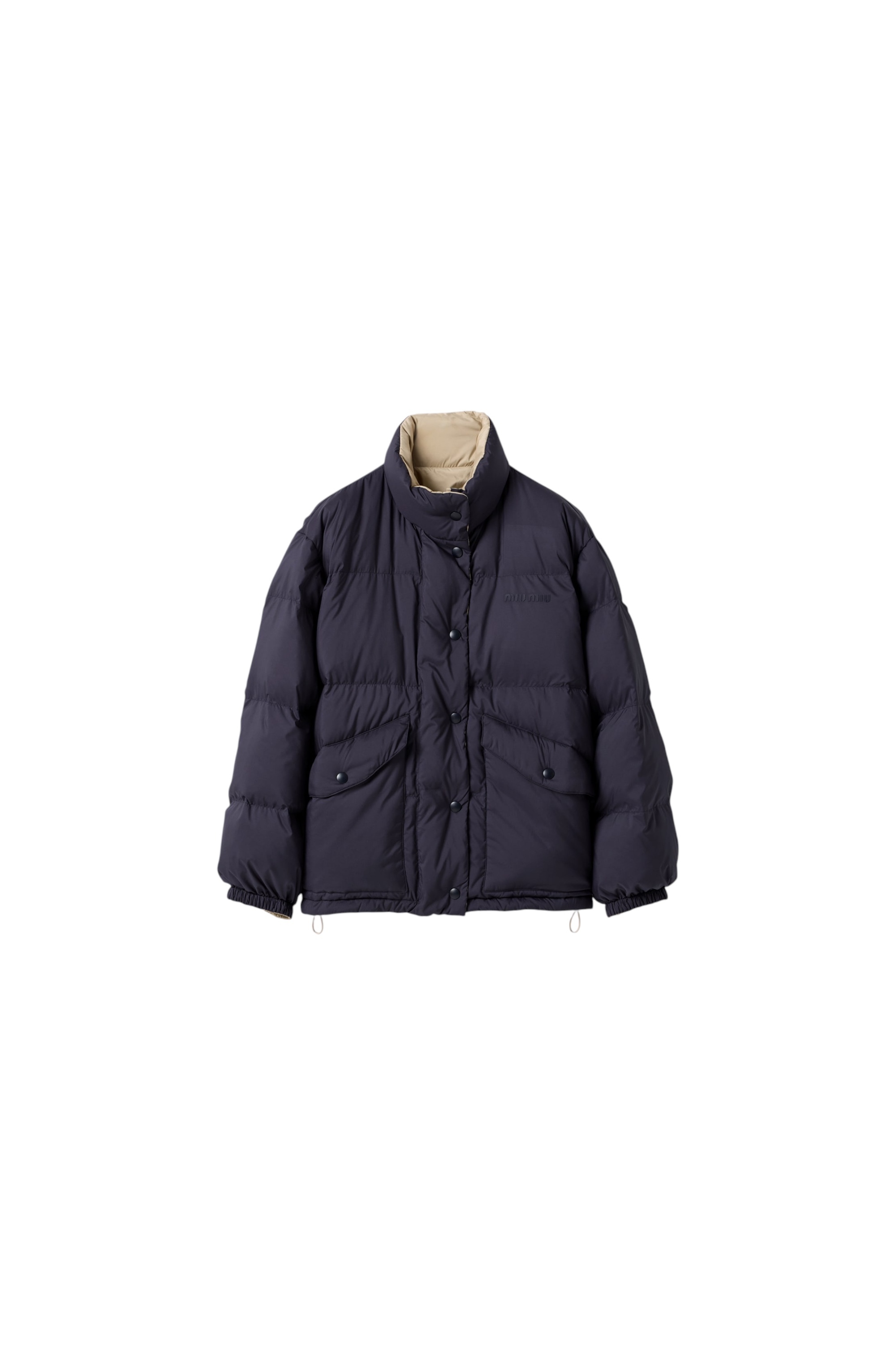 Стеганый двусторонний пуховик со спущенной линией плеч дополнен высоким воротником, накладными боковыми карманами и украшен логотипом бренда.
