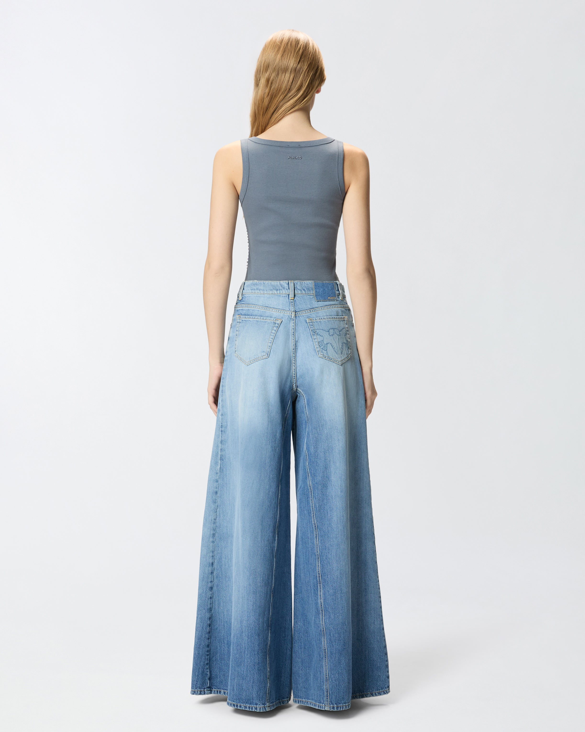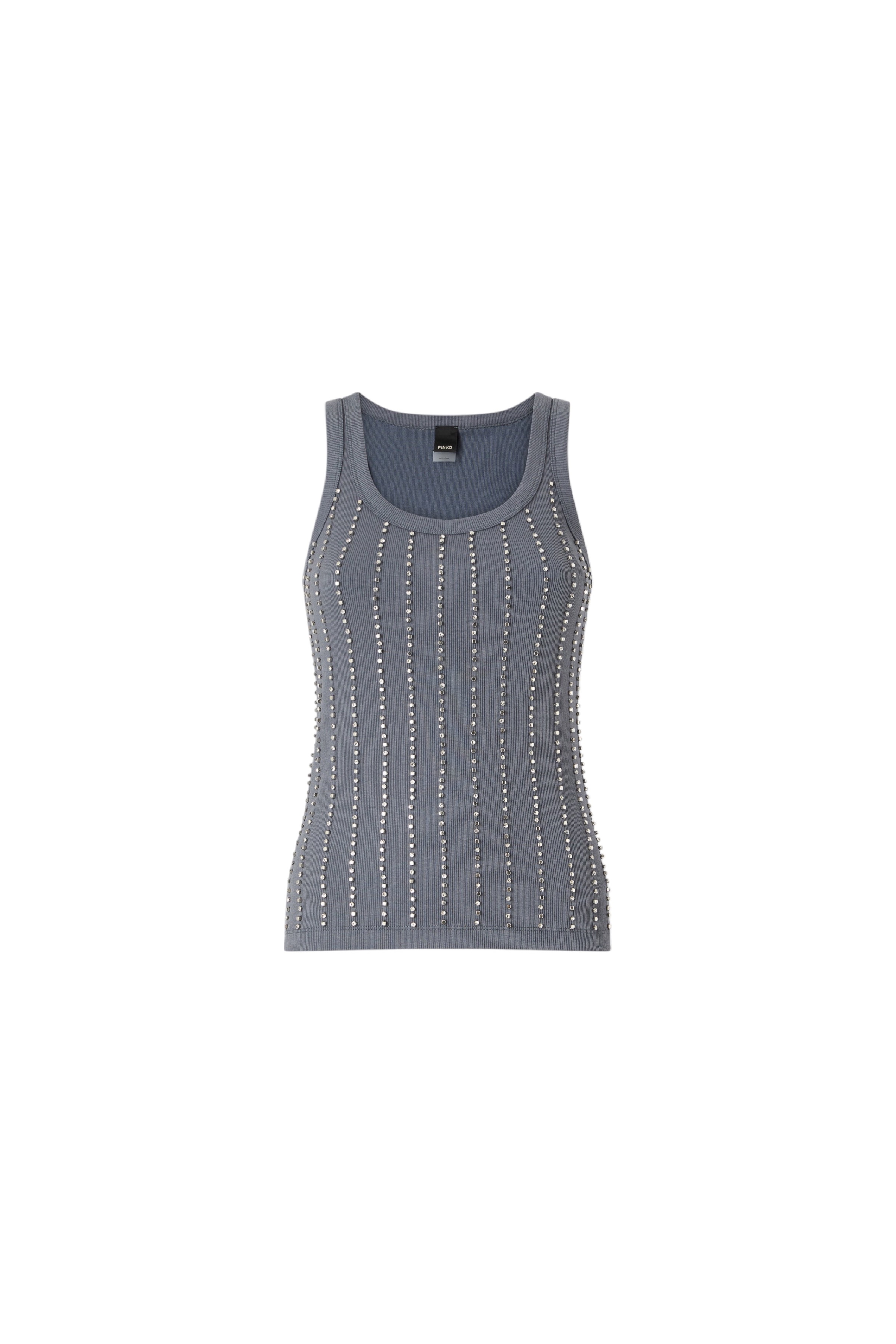 Топ приталенного силуэта на бретелях с круглым вырезом украшен спереди эффектными стразами.