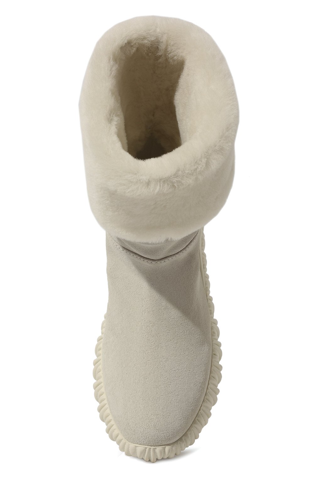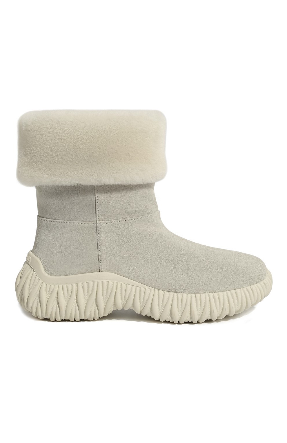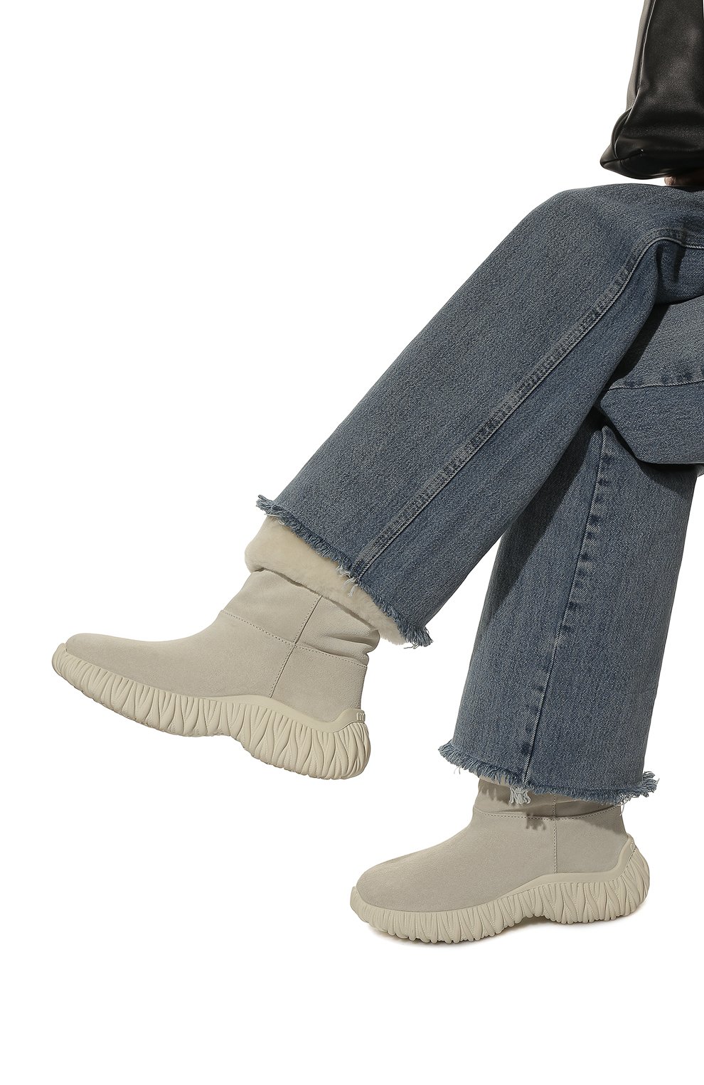 Сапоги из мягкой фактурной замши и отделкой из густой овчины, которую можно продемонстрировать, отвернув край голенища. Пару дополнили скульптурной подошвой со знаковым объемным мотивом Matelasse.