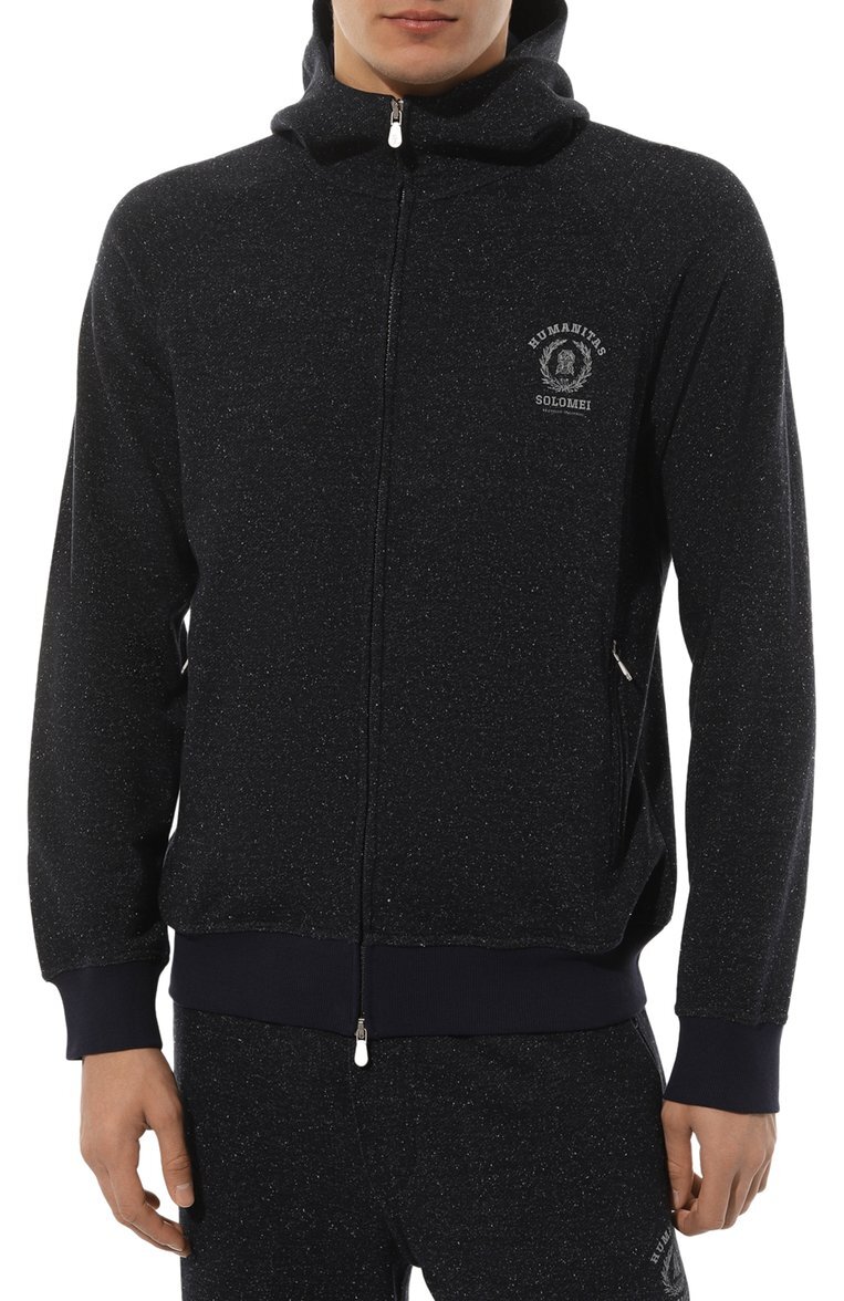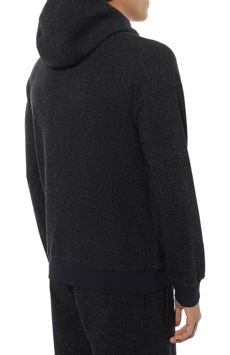 - толстовка из смесового хлопка полуприлегающего кроя с длинными рукавами-реглан, эластичными манжетами и поясом дополнена капюшоном, прорезными карманами и застежкой на молнию;