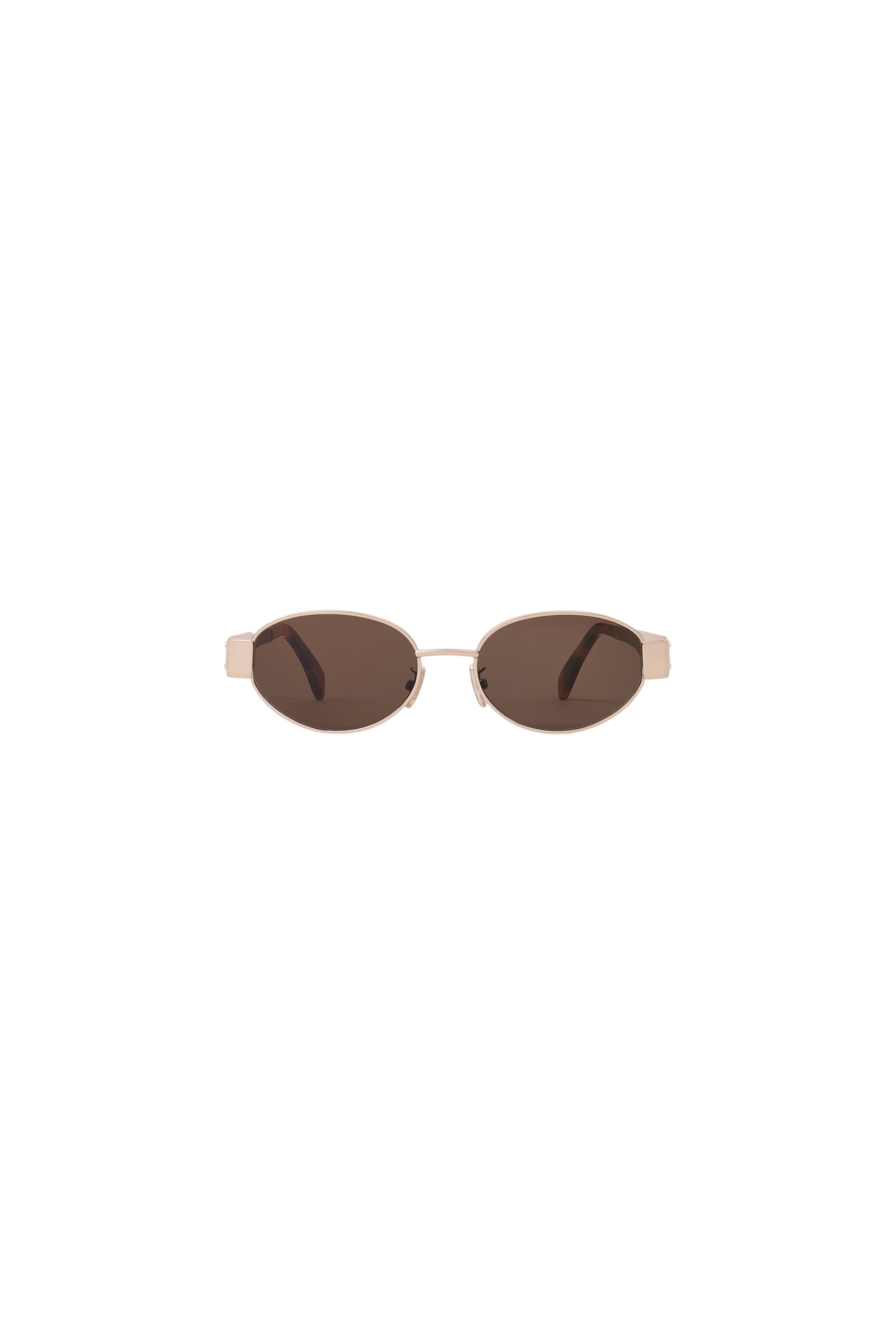 Овальные солнцезащитные очки из золотистого металла оснастили линзами цвета бутылочного стекла. Дужки с заушниками из черепахового ацетата украсили рельефной эмблемой Triomphe.