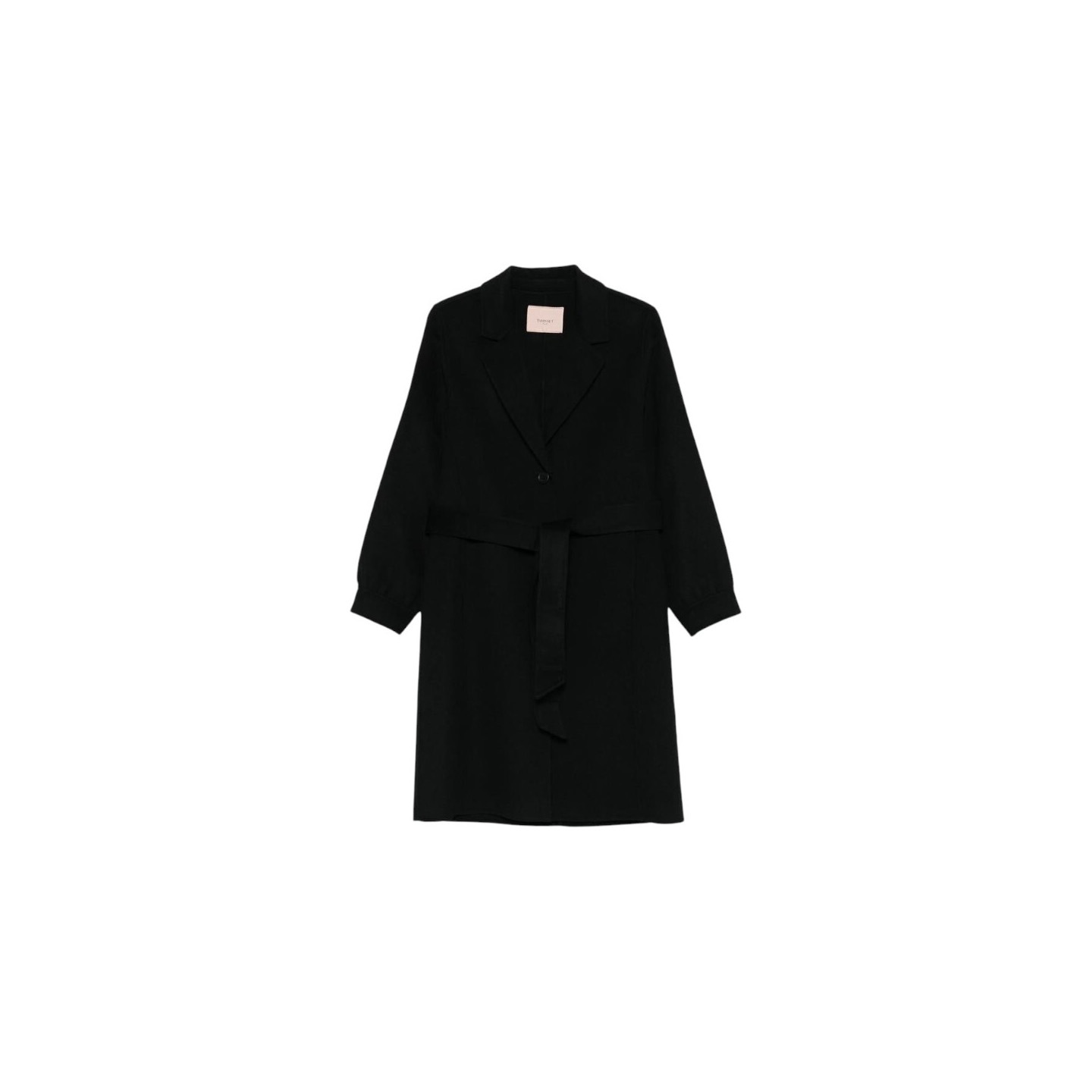 Роскошное пальто из шерсти и полиэстера с длинными рукавами фиксируется поясом на талии.