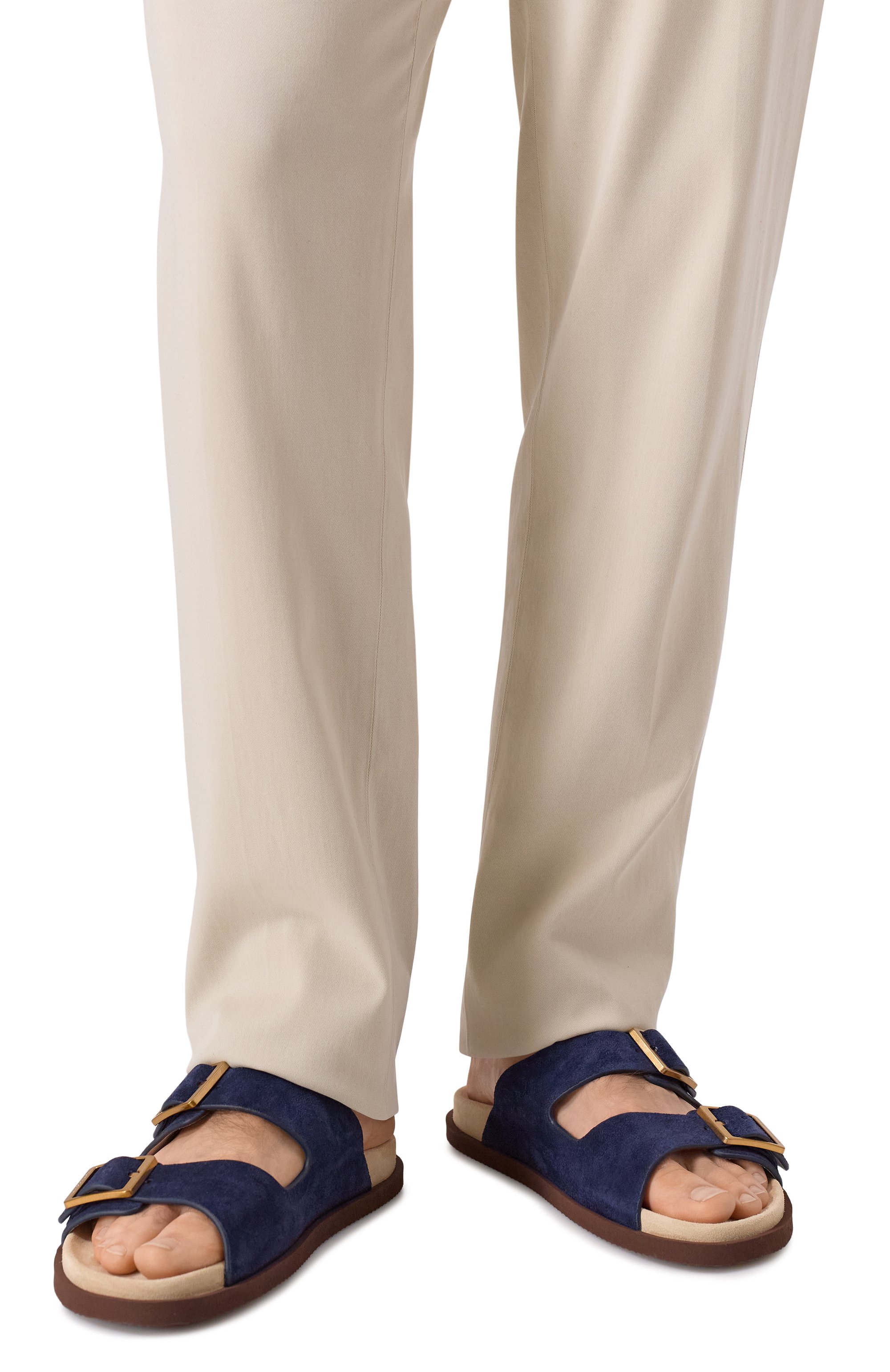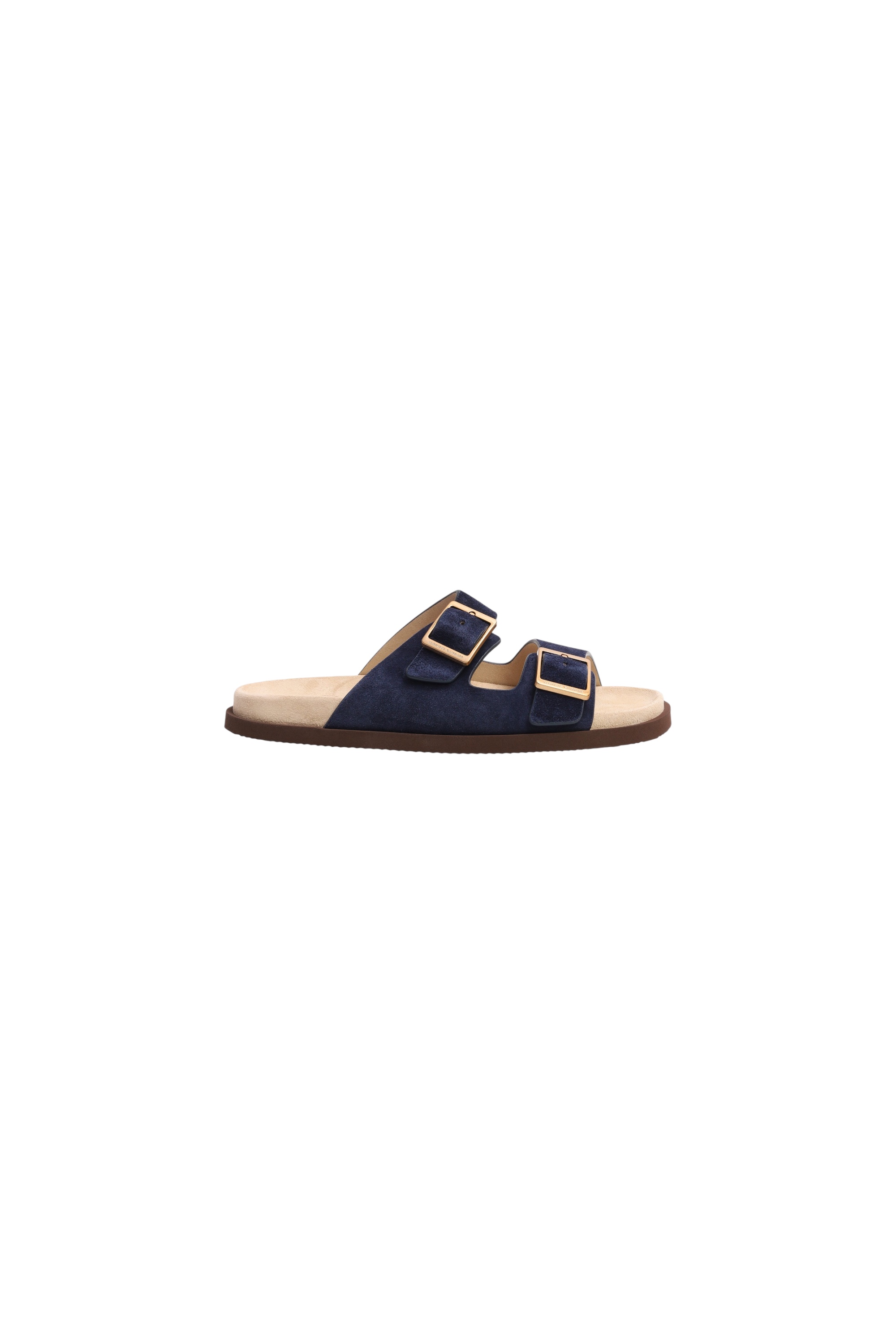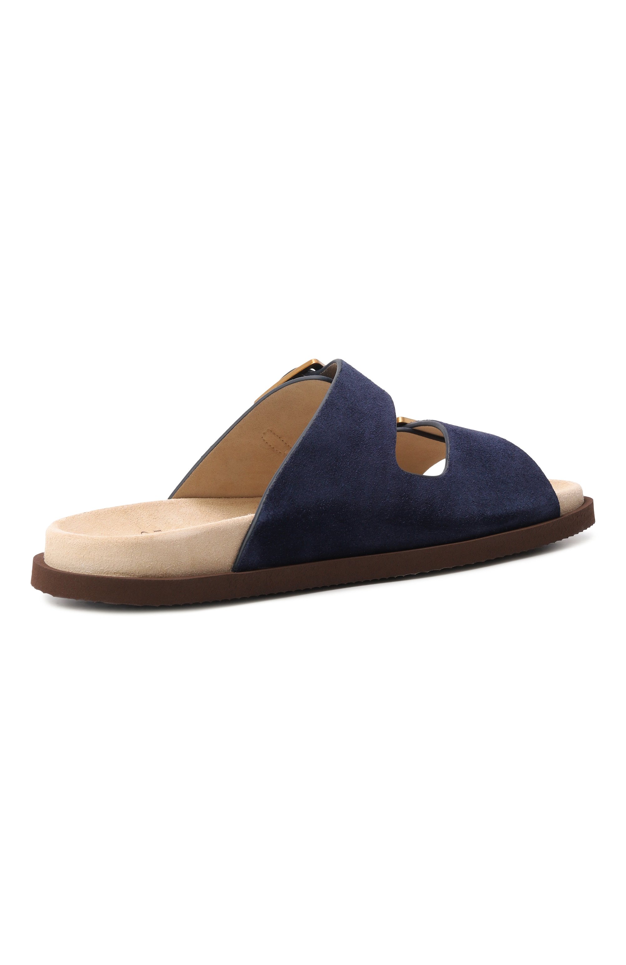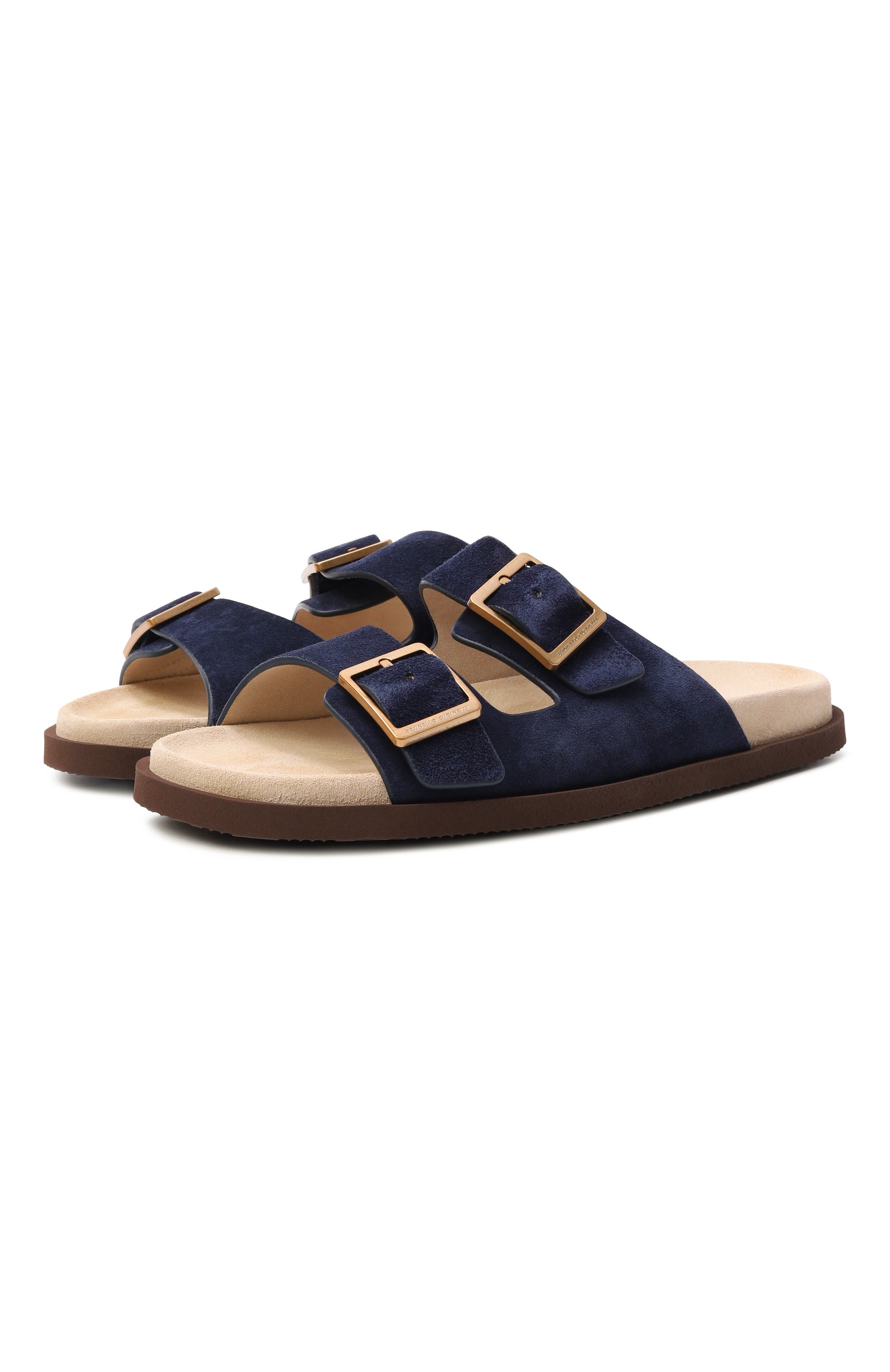 Замшевые пантолеты с формованной брендированной стелькой на полимерную подошву с регулируемой посадкой, которую можно регулировать пряжками на двух ремешках.