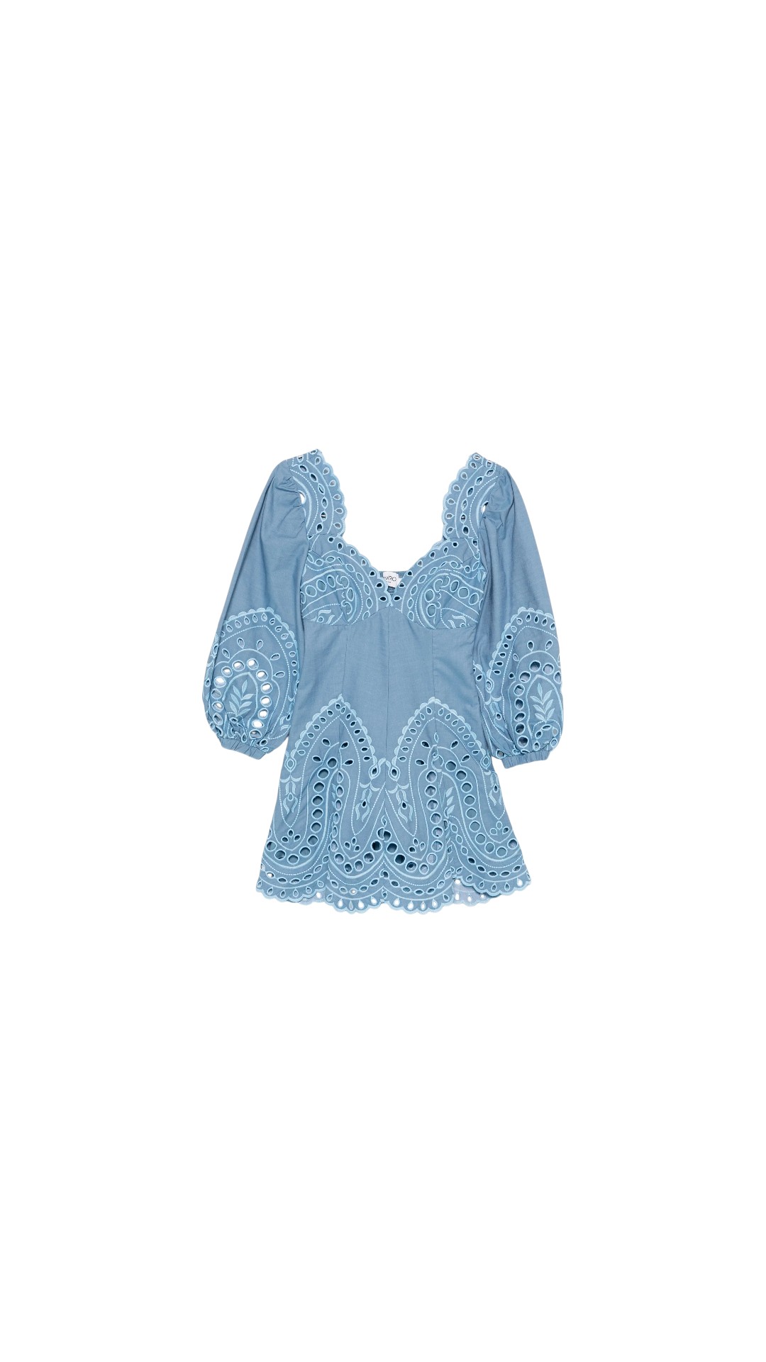 Платье длины мини из смеси хлопка и полиэстера с объемными рукавами дополнено эластичной вставкой на спине и украшено ажурной вышивкой.