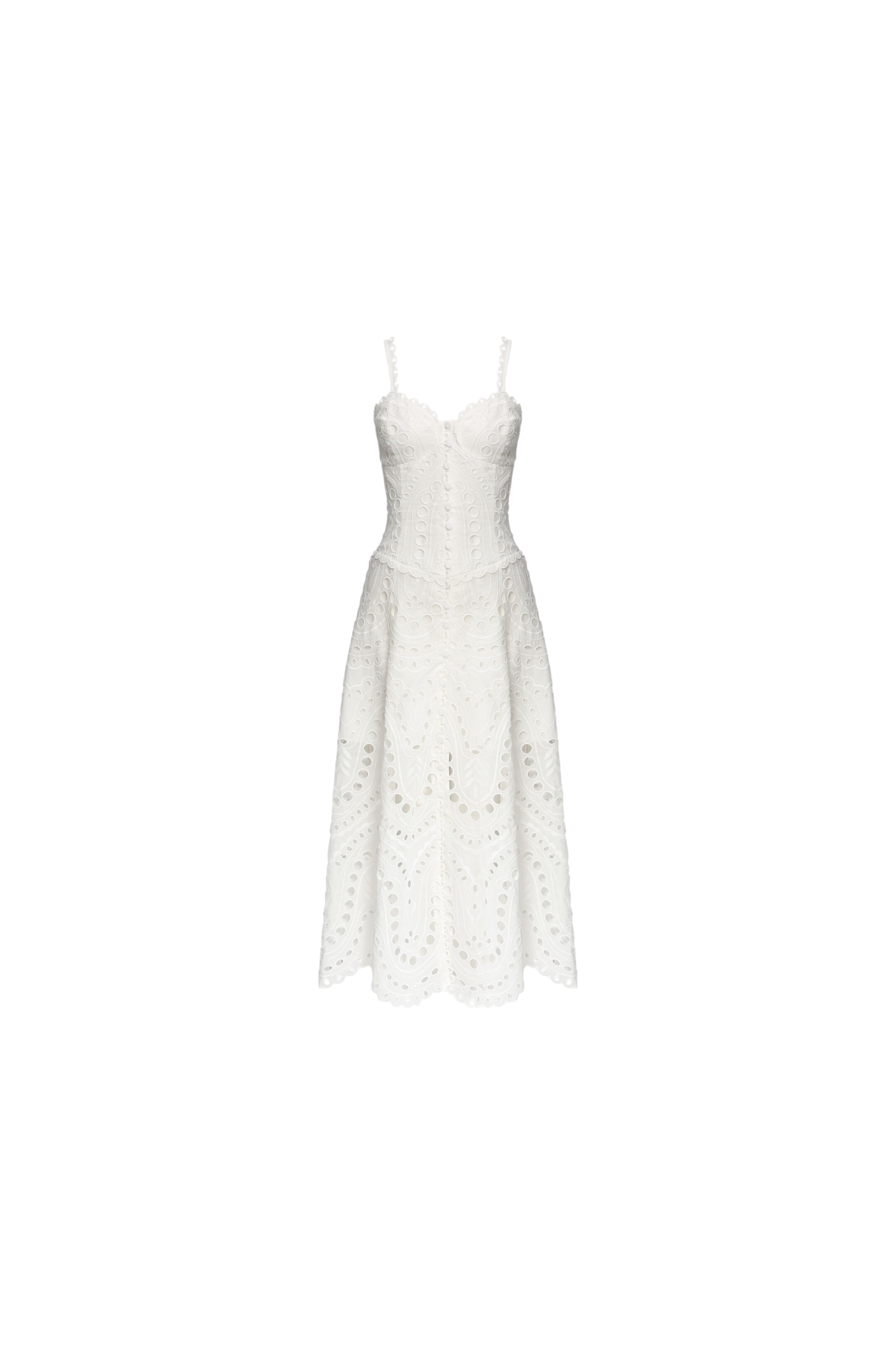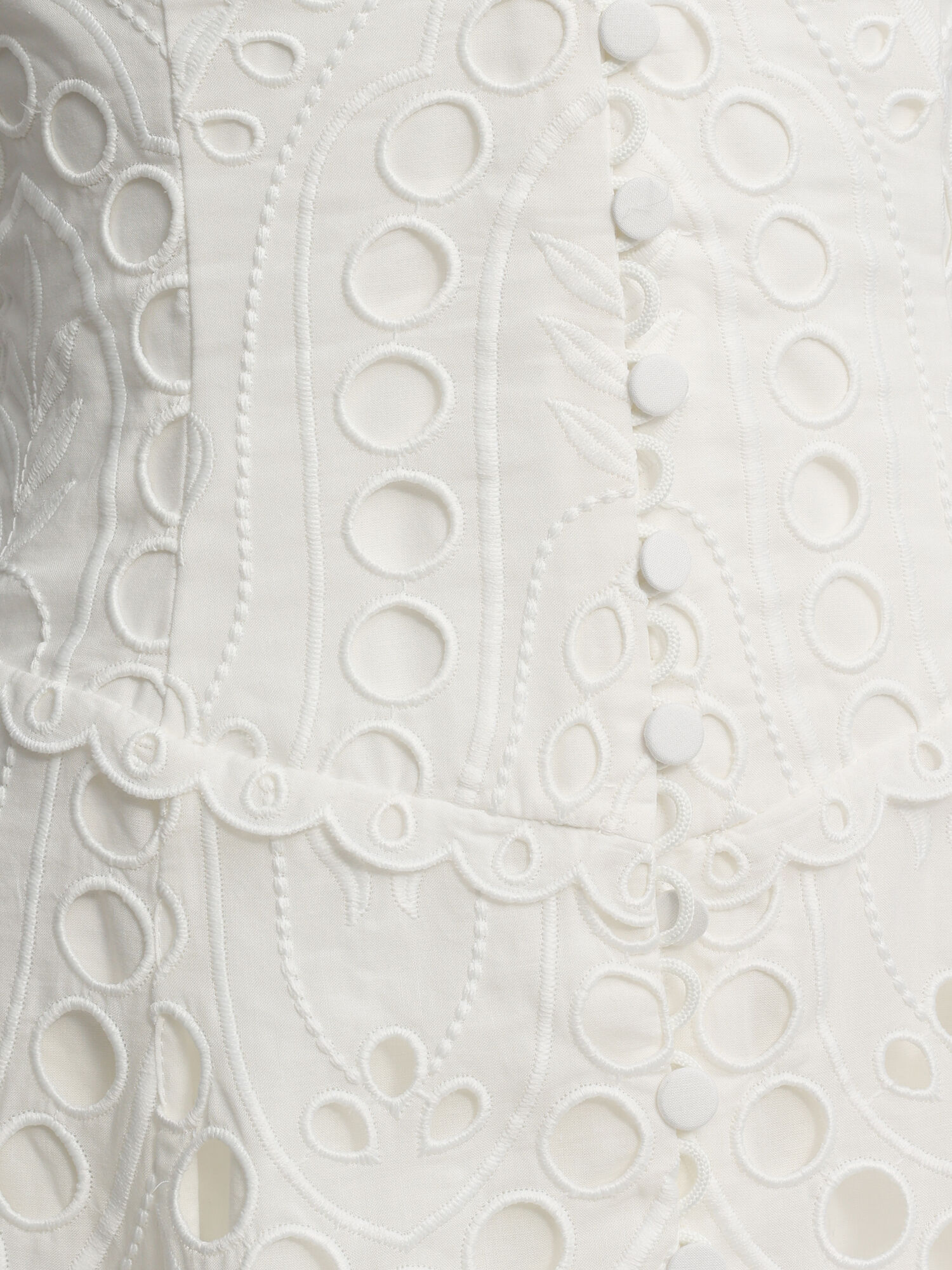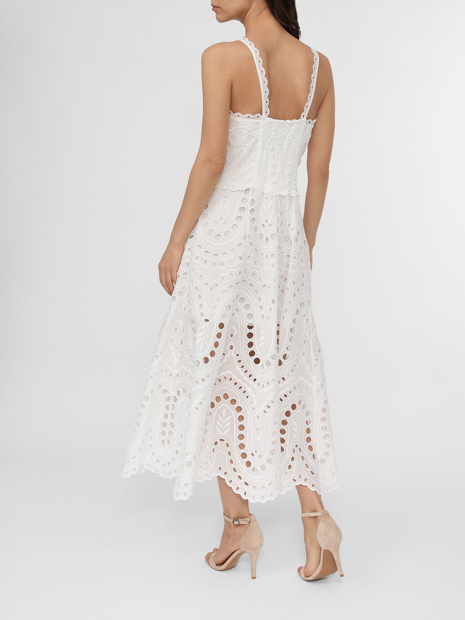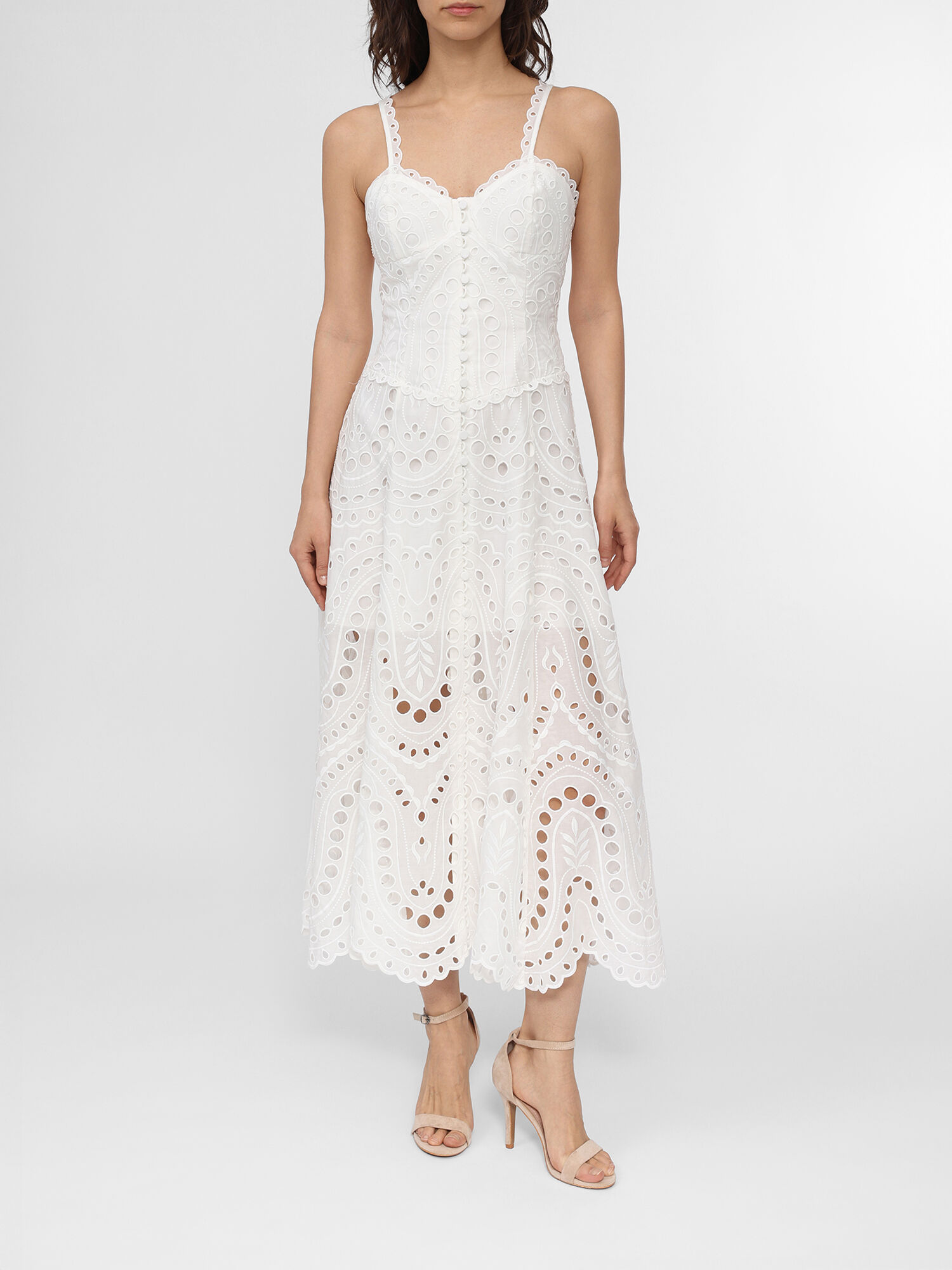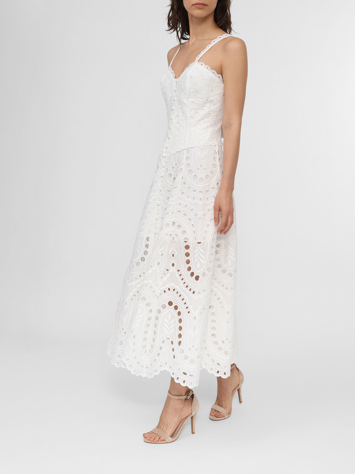 Эффектное платье длины миди с ажурной отделкой на бретелях дополнено застежкой на пуговицы спереди.