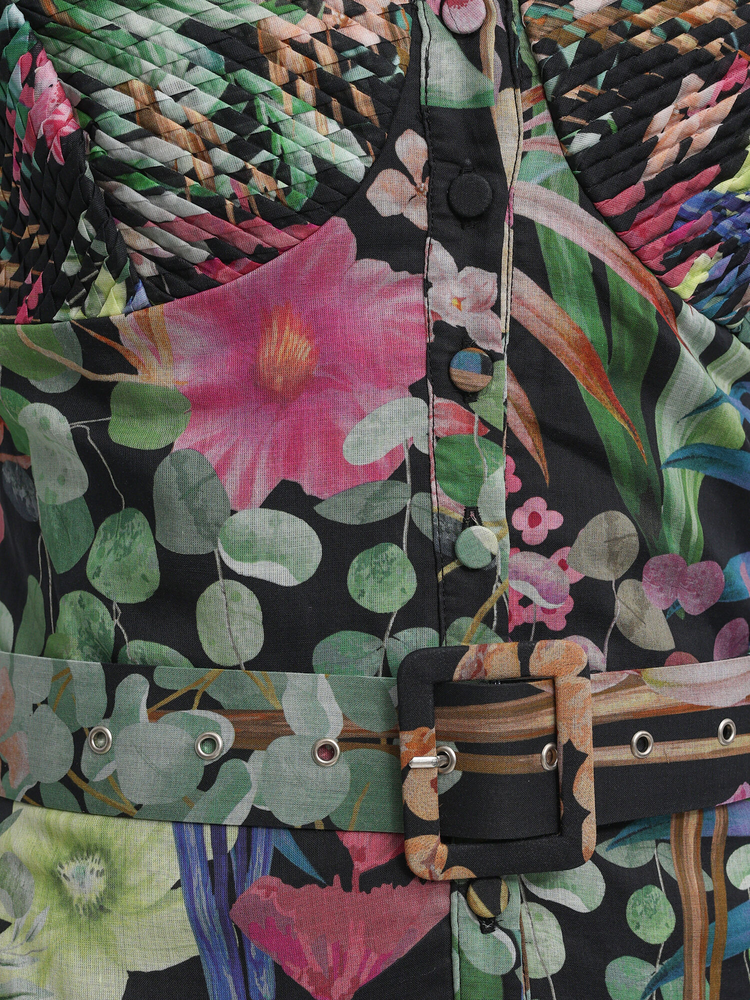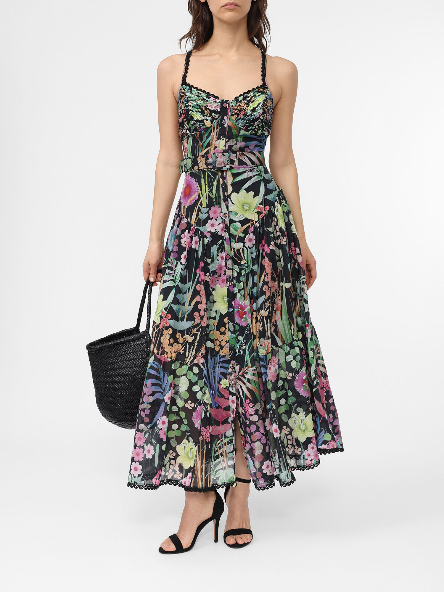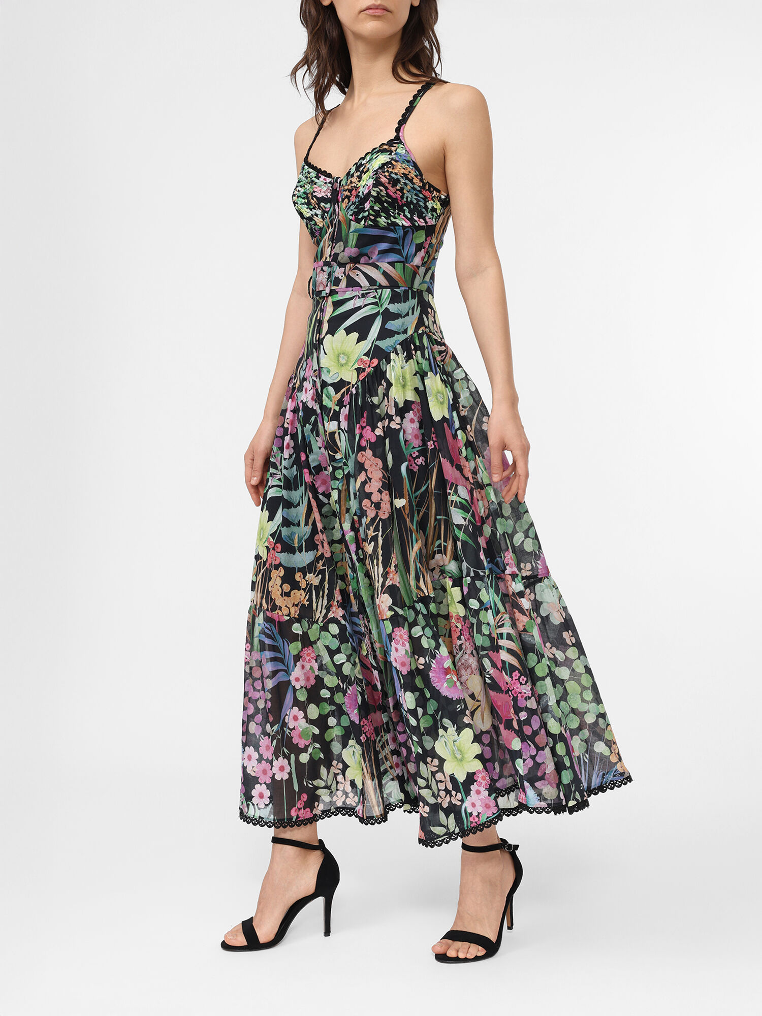Платье длины миди с цветочным мотивом на тонких бретелях дополнено кружевными деталями и регулируемым поясом на талии.