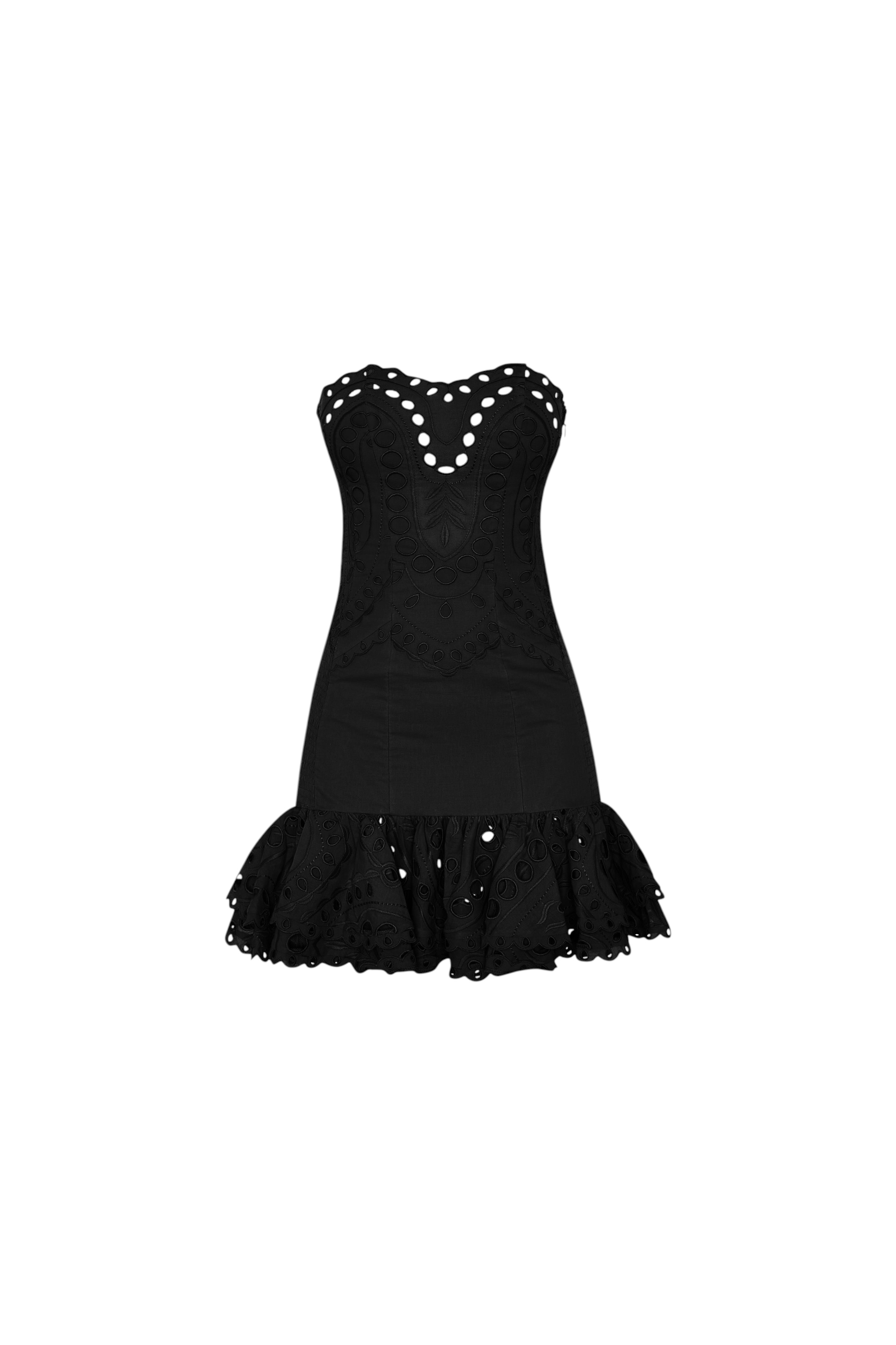 Платье-бюстье приталенного силуэта с эффектным кружевом дополнено эластичными вставками по бокам.