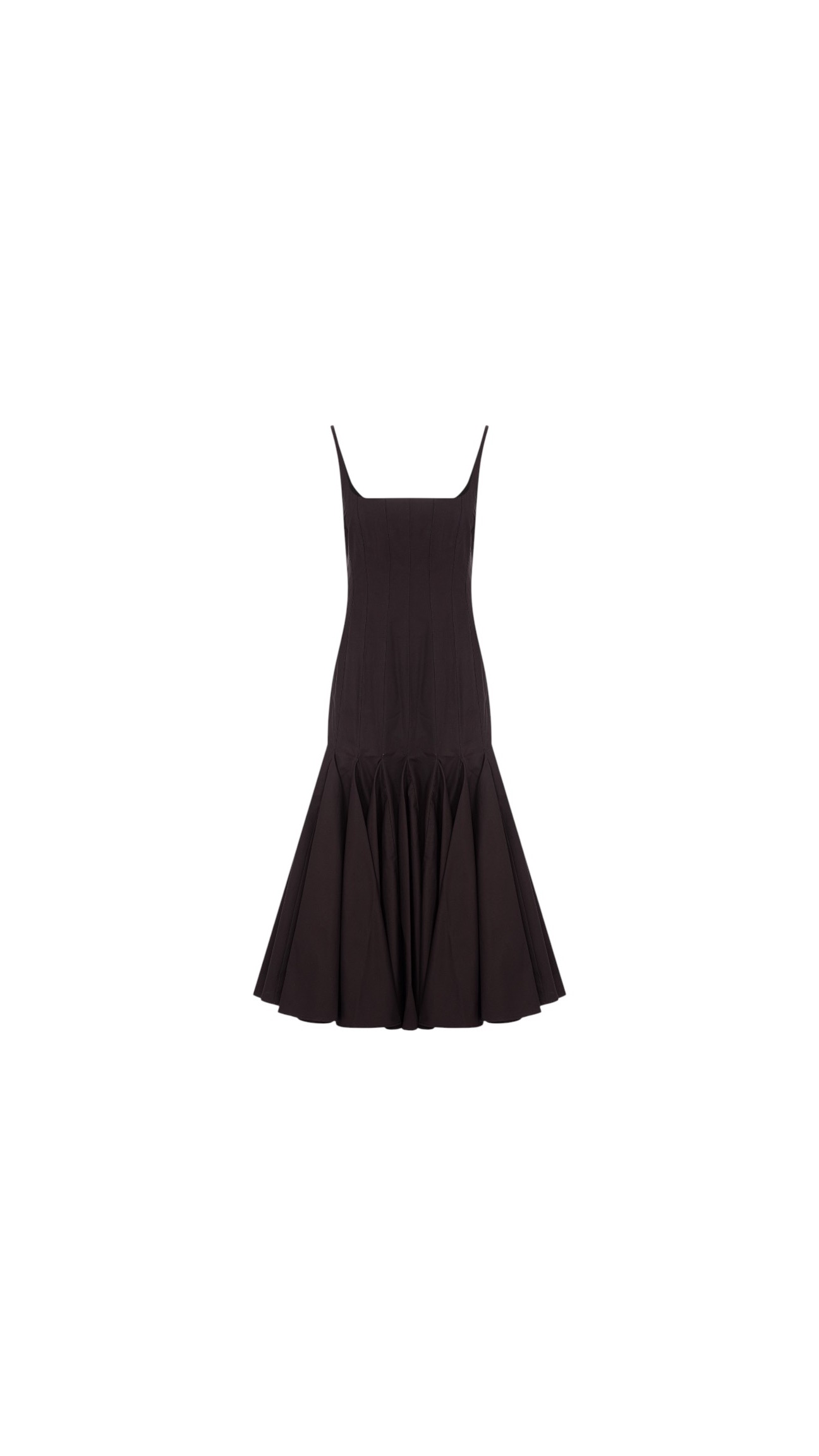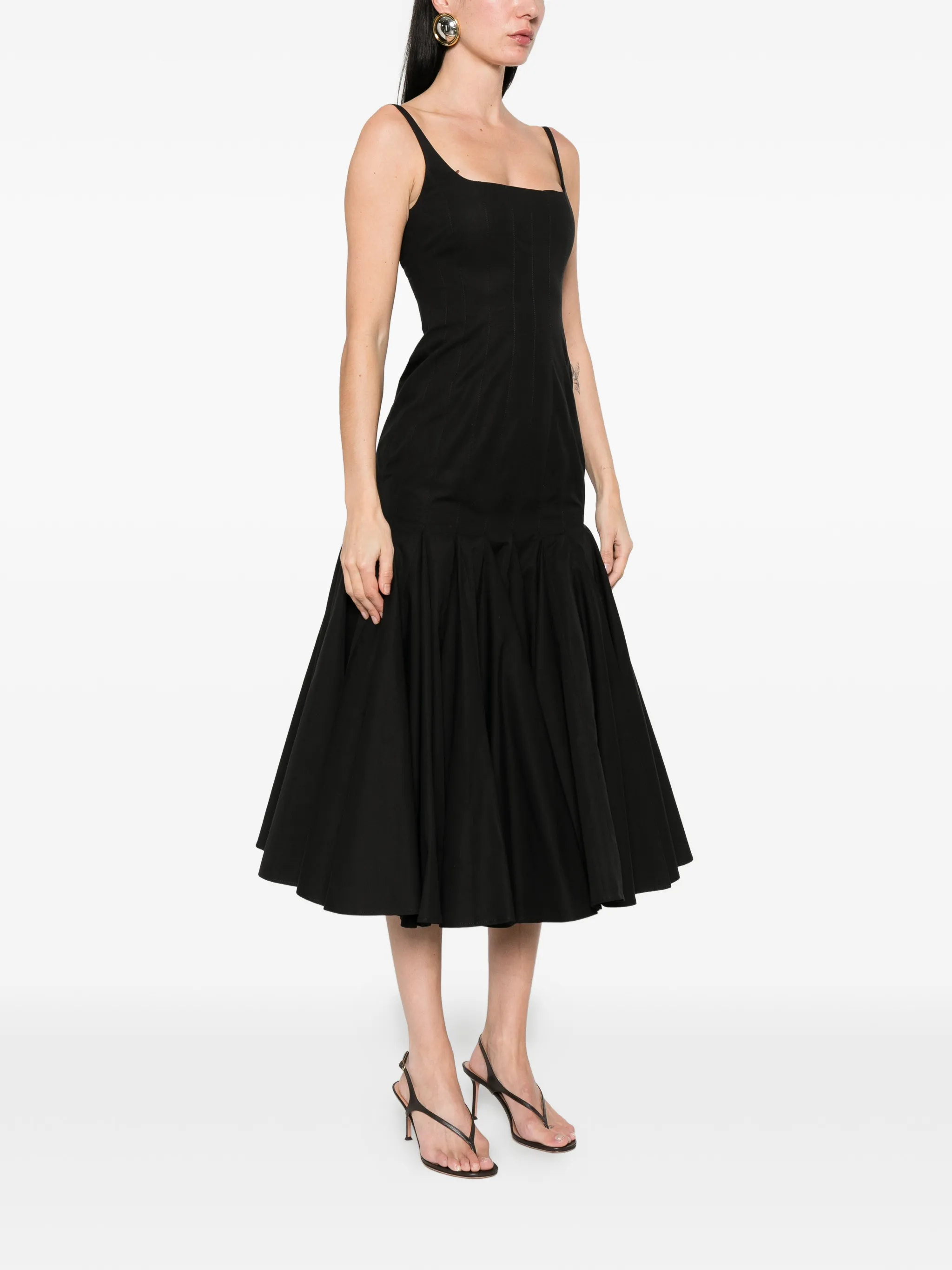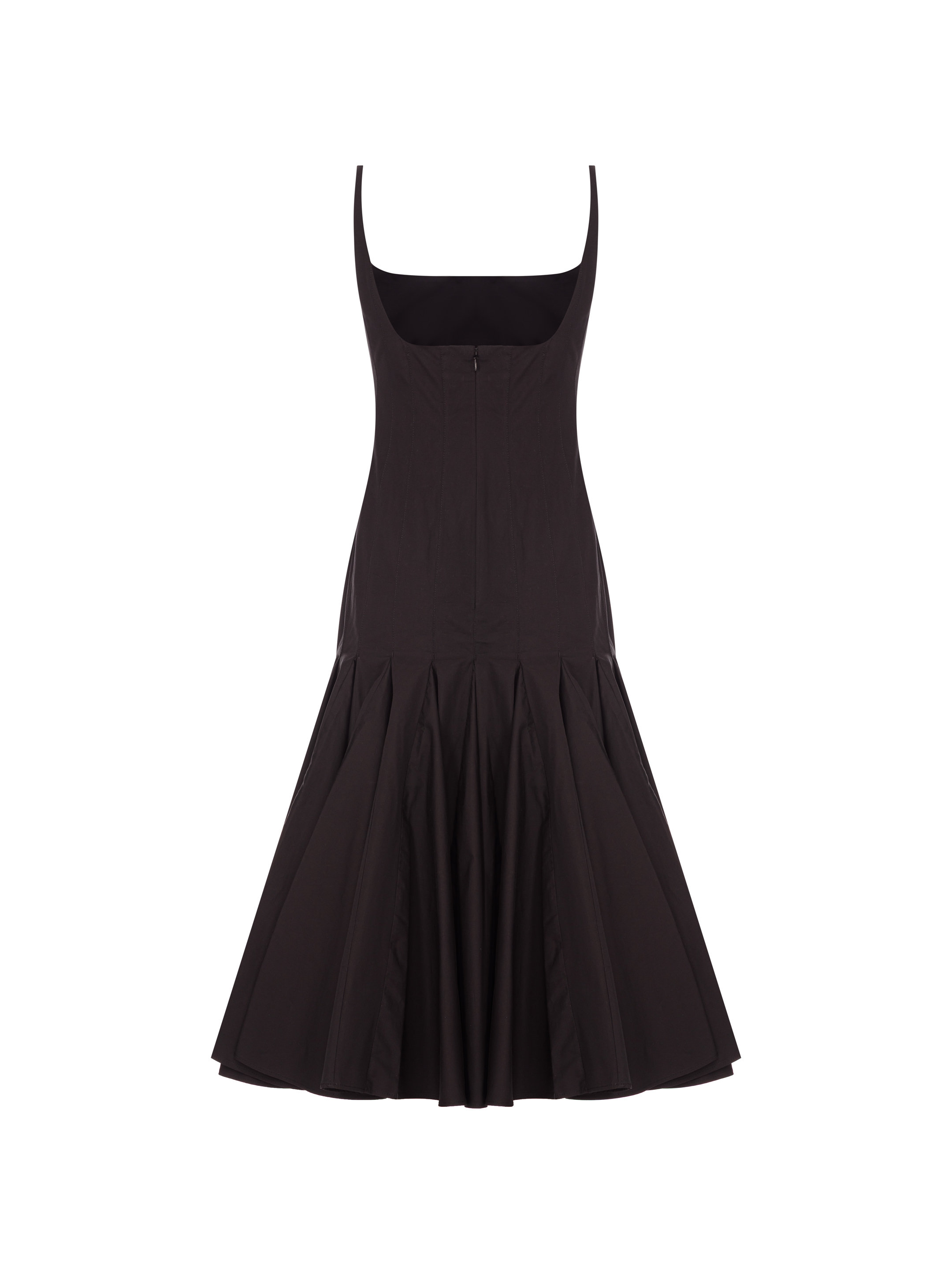 Платье приталенного кроя длины миди на бретелях из хлопкового поплина с U-образным вырезом, застежкой на крючок и молнию сзади дополнено объемной, расклешенной юбкой.