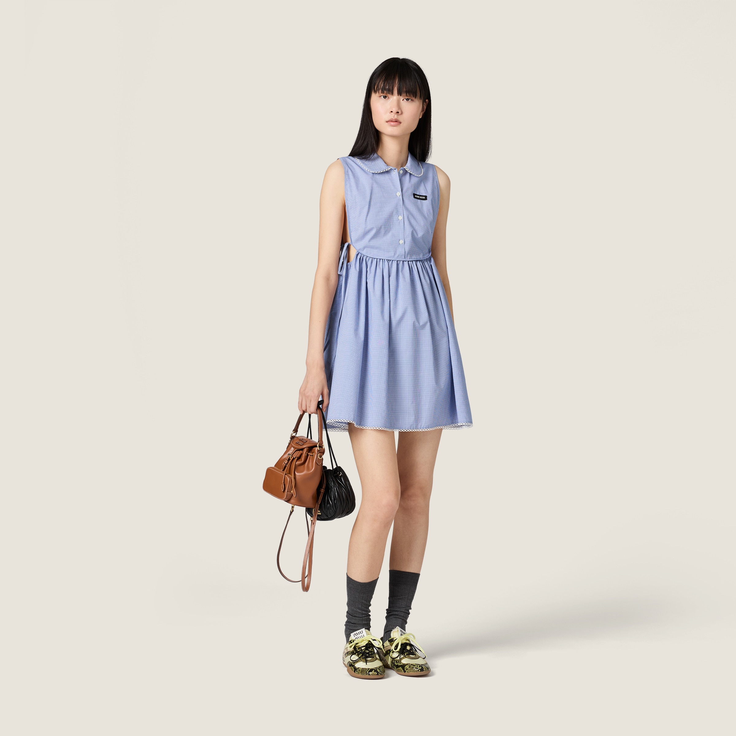Лаконичное платье с принтом в полоску и расклешенным подолом длины мини дополнено воротником-поло, короткой застежкой на пуговицы спереди и боковыми разрезами.