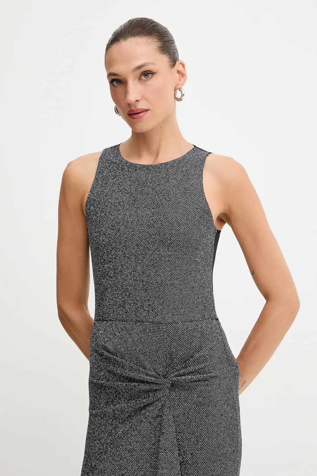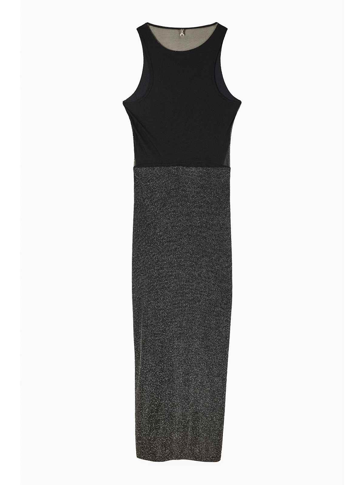Платье длины миди прилегающего силуэта с круглым вырезом дополнено полупрозрачными вставками и асимметричным низом.