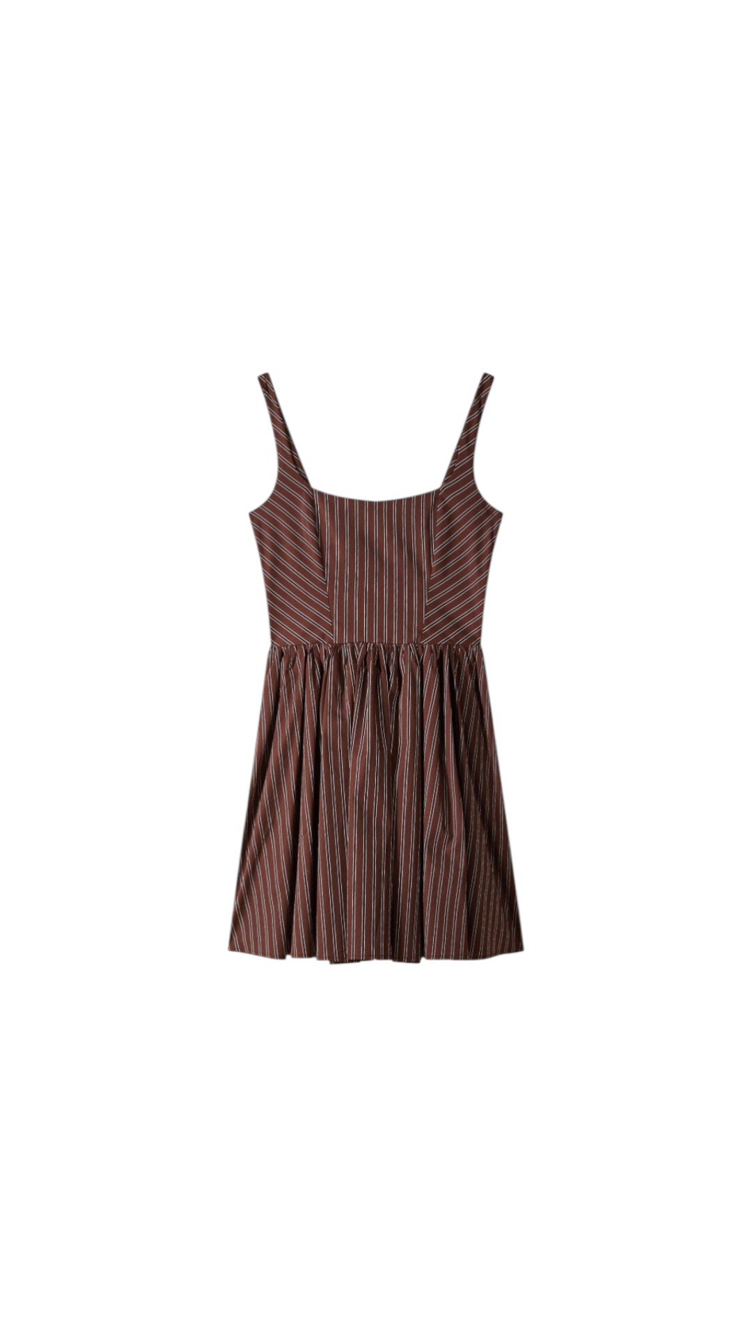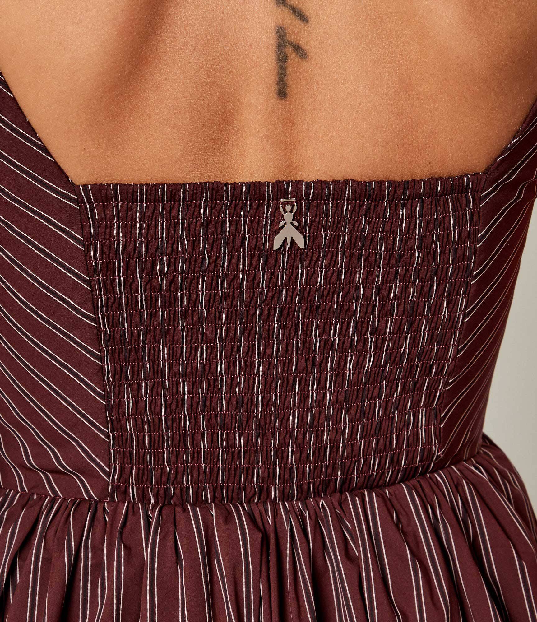 Платье длины мини в полоску с расклешенным подолом на бретелях дополнено корсетной вставкой на спине и украшено фирменным металлическим логотипом бренда.