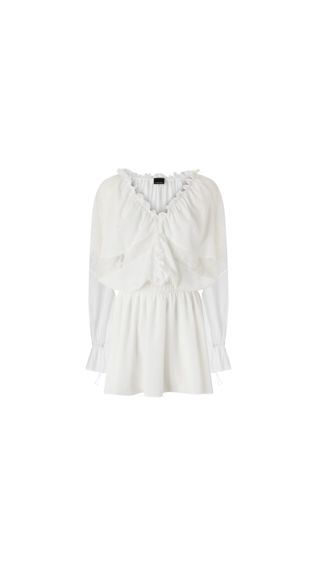 Утонченное платье длины мини с V-образным вырезом дополнено эластичным поясом на талии и украшено эффектными кружевными вставками.