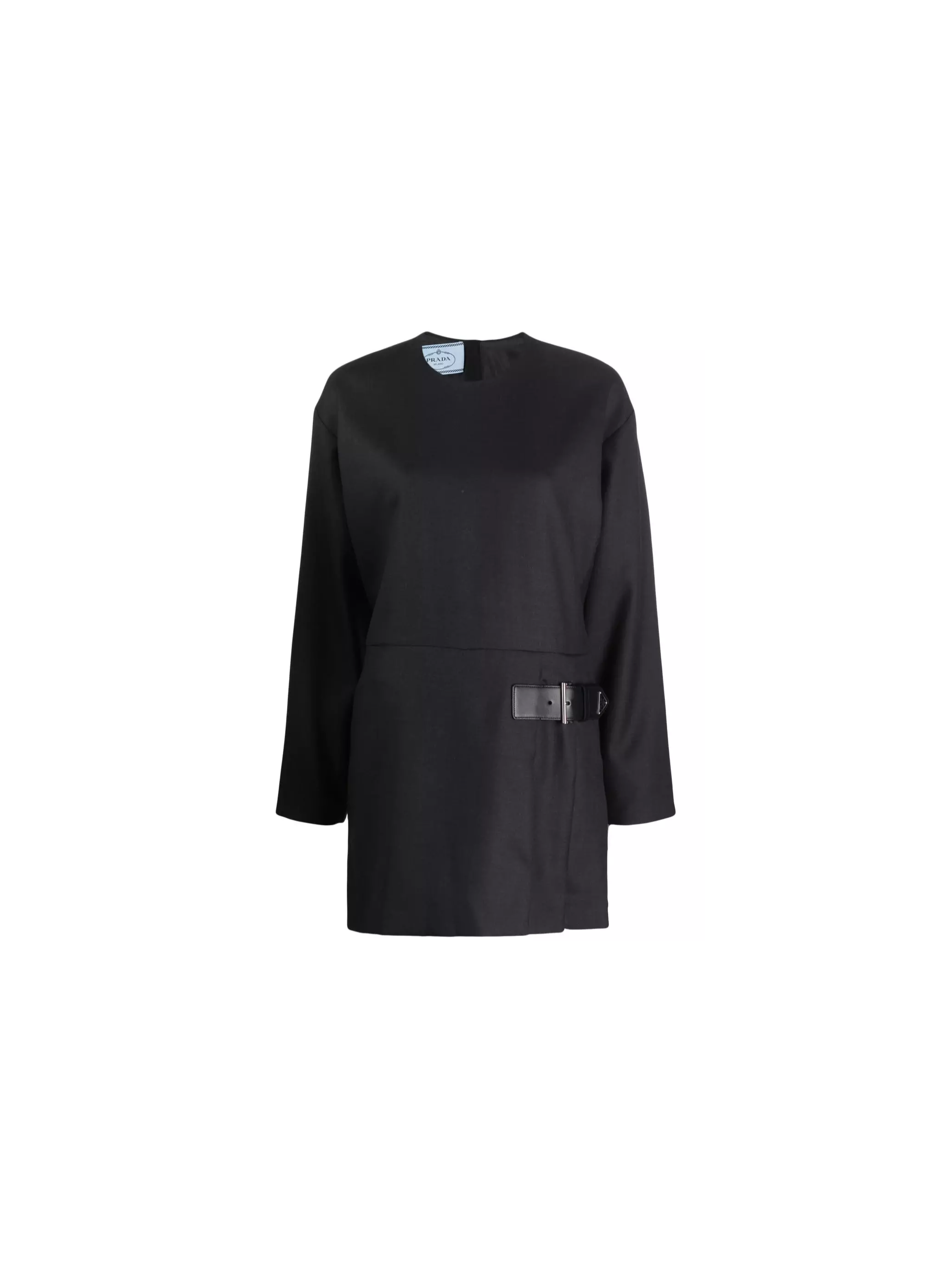 Мини-платье прямого кроя с круглым вырезом минимально украшено культовой треугольной табличкой с логотипом бренда сбоку.
