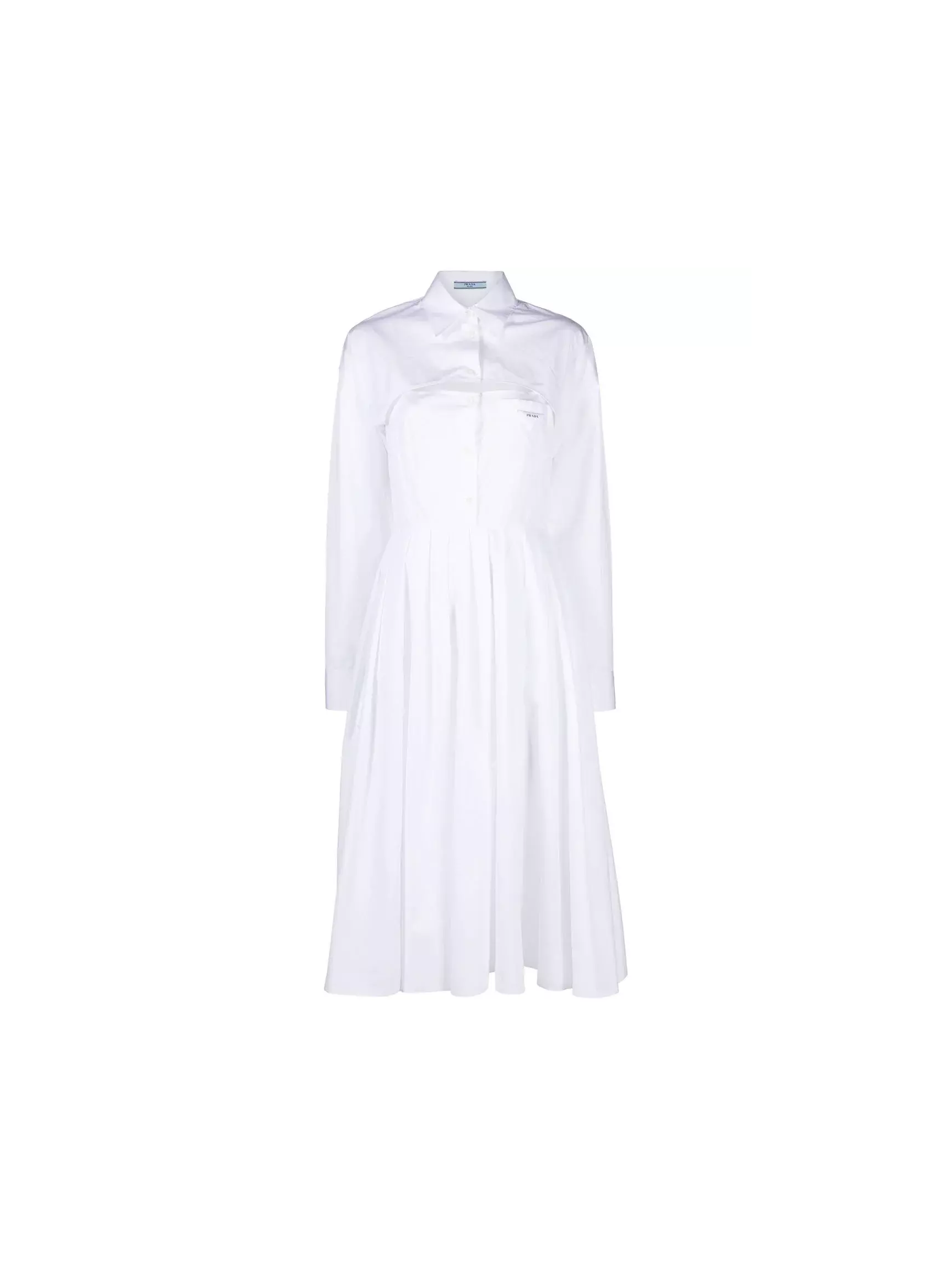 Длинное хлопковое платье с классическим воротником и застежкой на пуговицы дополнено вырезами, накладным карманом и украшено логотипом бренда.