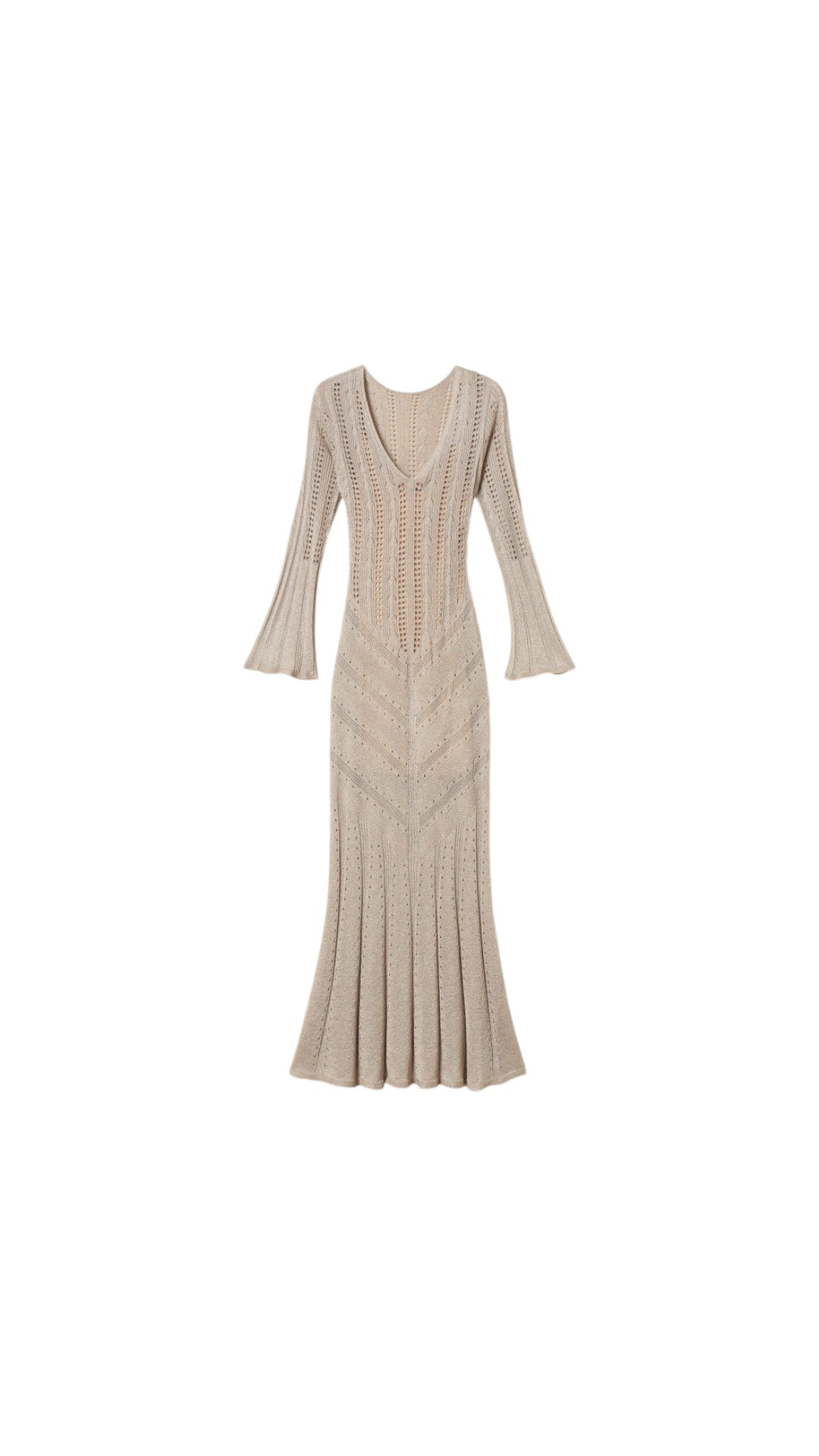 Эффектное платье длины макси из вискозы и полиэстера приталенного силуэта с V-образным вырезом и расклешенными рукавами.