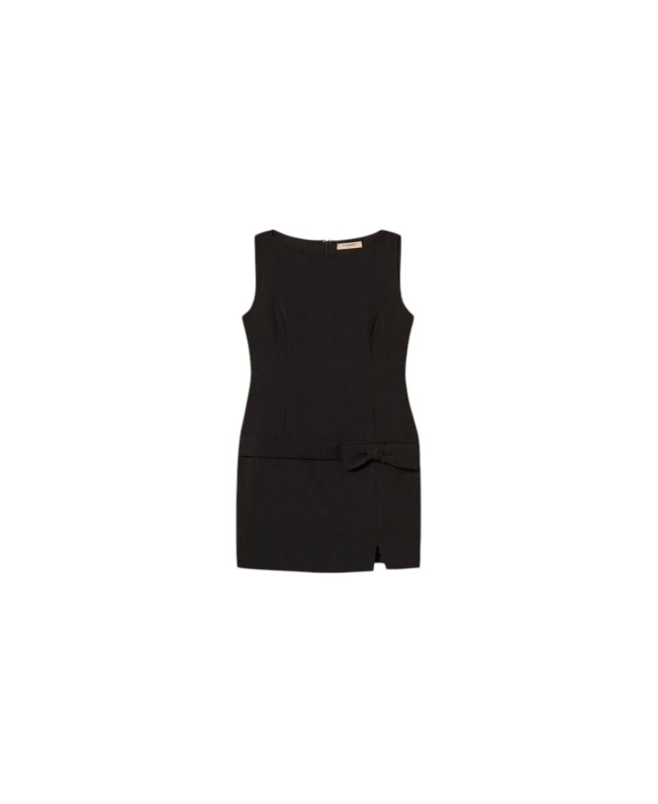 Платье-мини без рукавов с круглым вырезом украшено эффектным бантом на талии.