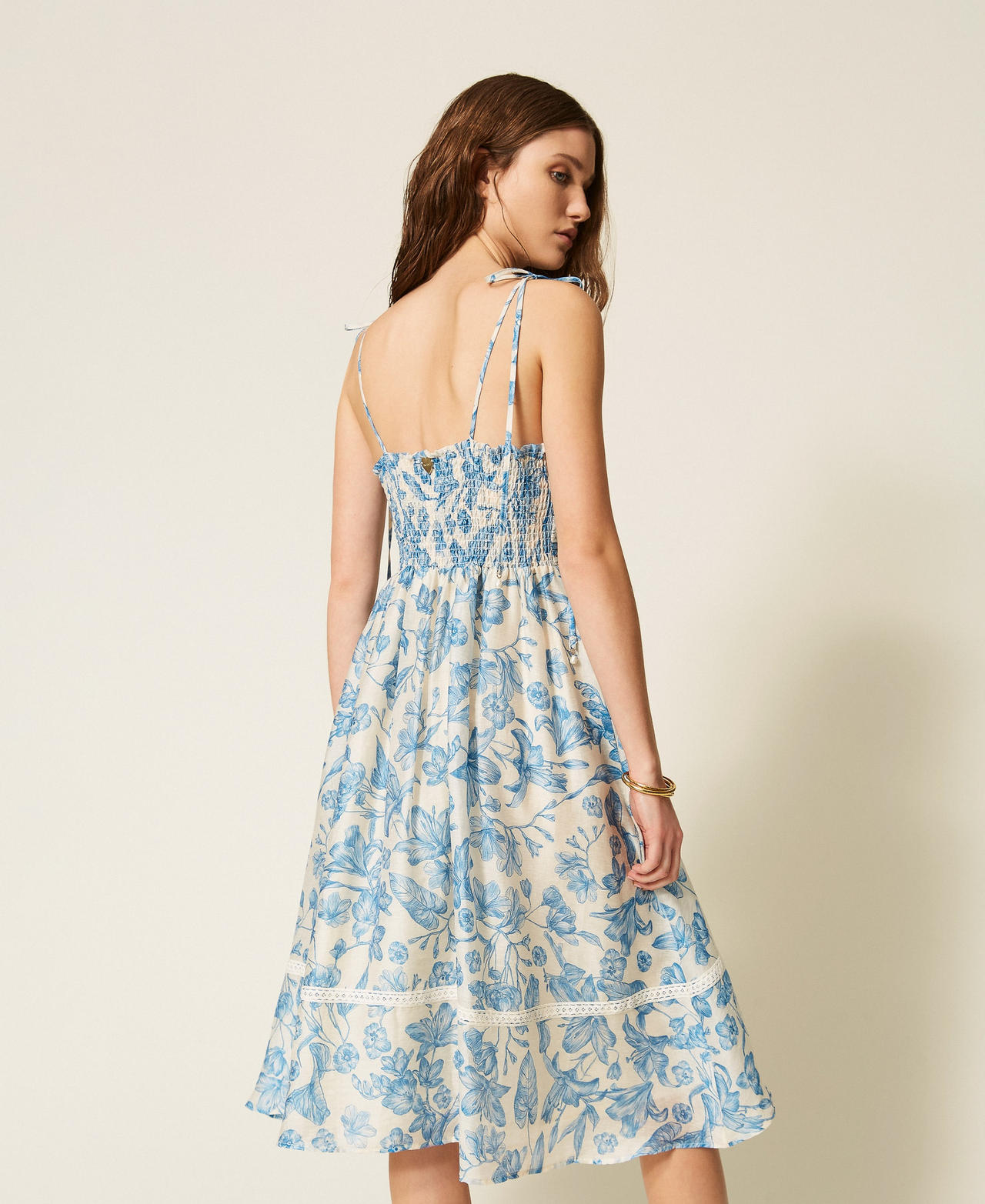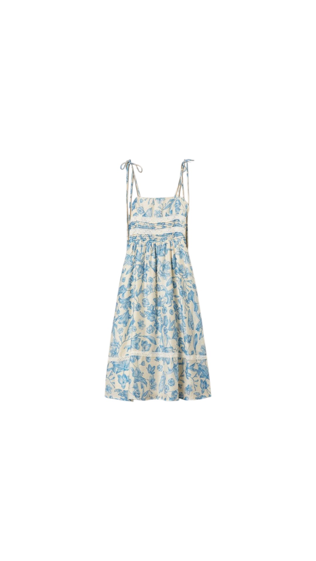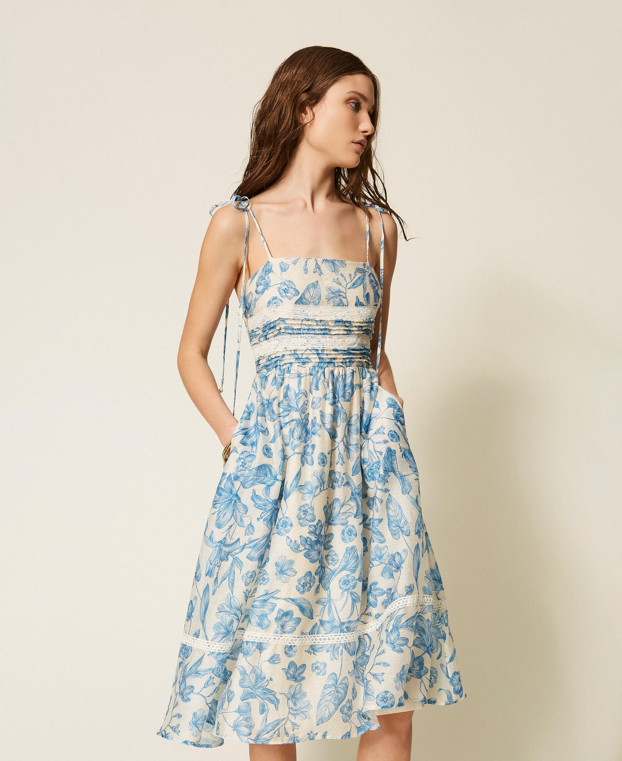 Платье длины миди с цветочным принтом и кружевной отделкой на тонких бретелях дополнено эластичной вставкой на спине и боковыми карманами.