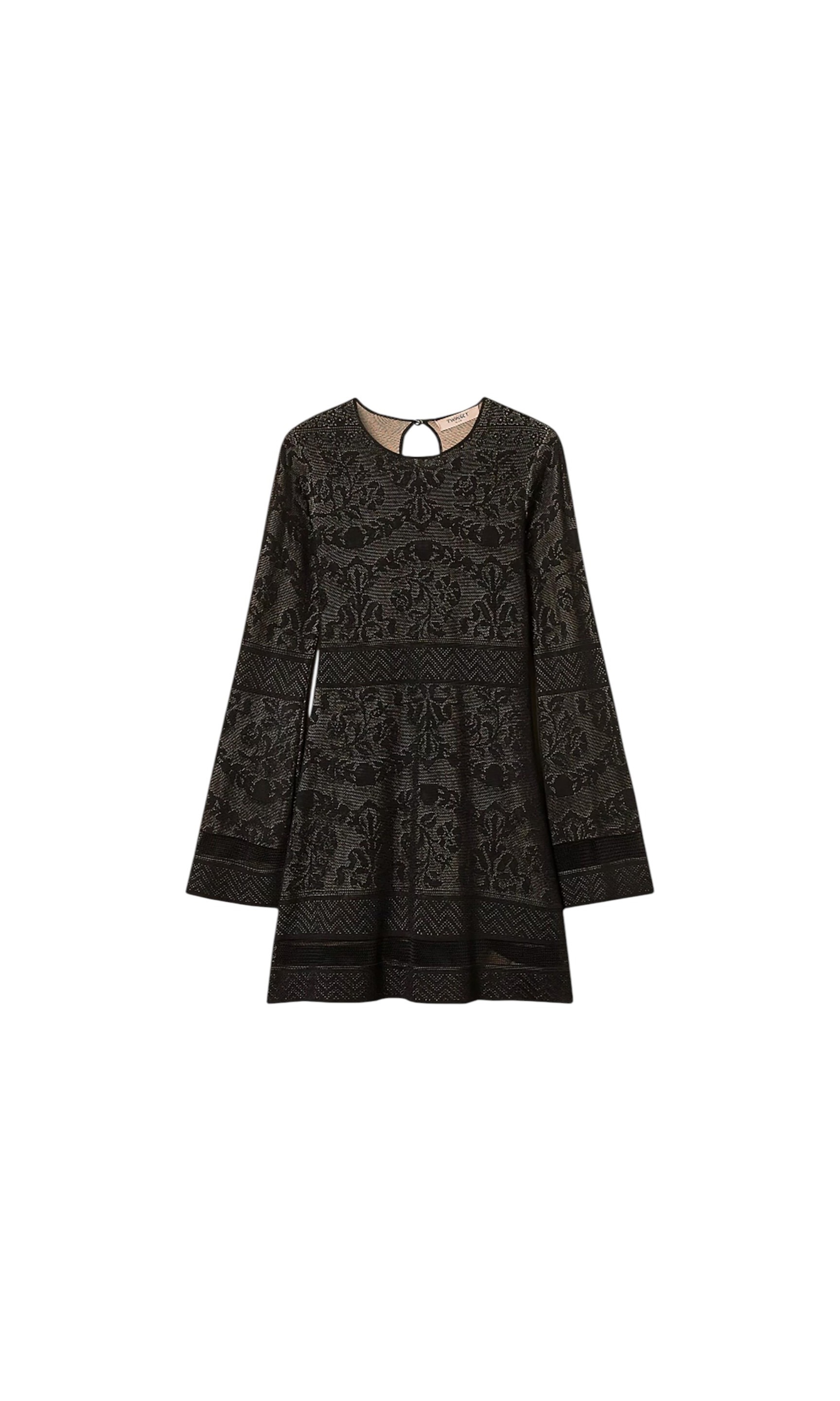 Элегантное платье из вискозного трикотажа со сплошным ажурным узором в тон дополнили круглым вырезом, длинными рукавами и небольшим разрезом на пуговице сзади.