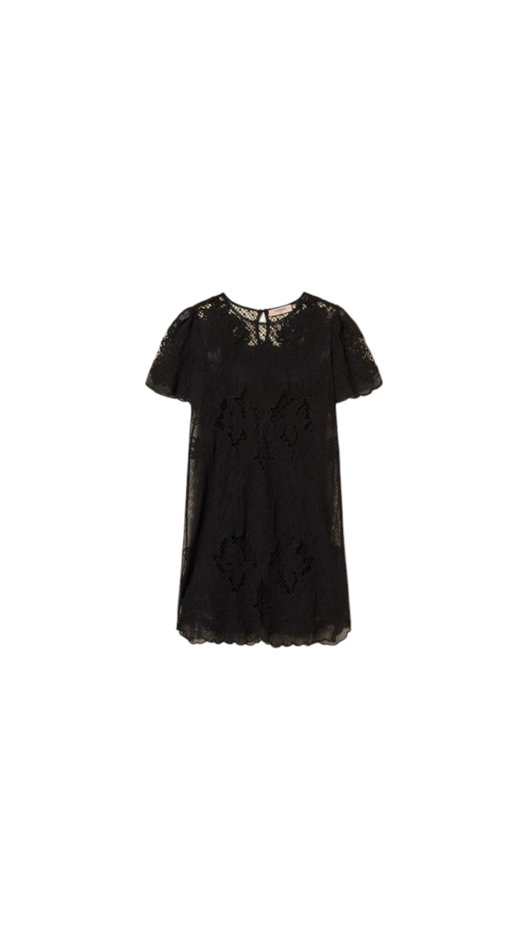 Платье длины мини прямого кроя с круглым вырезом и короткими рукавами украшено эффектной полупрозрачной вышивкой.