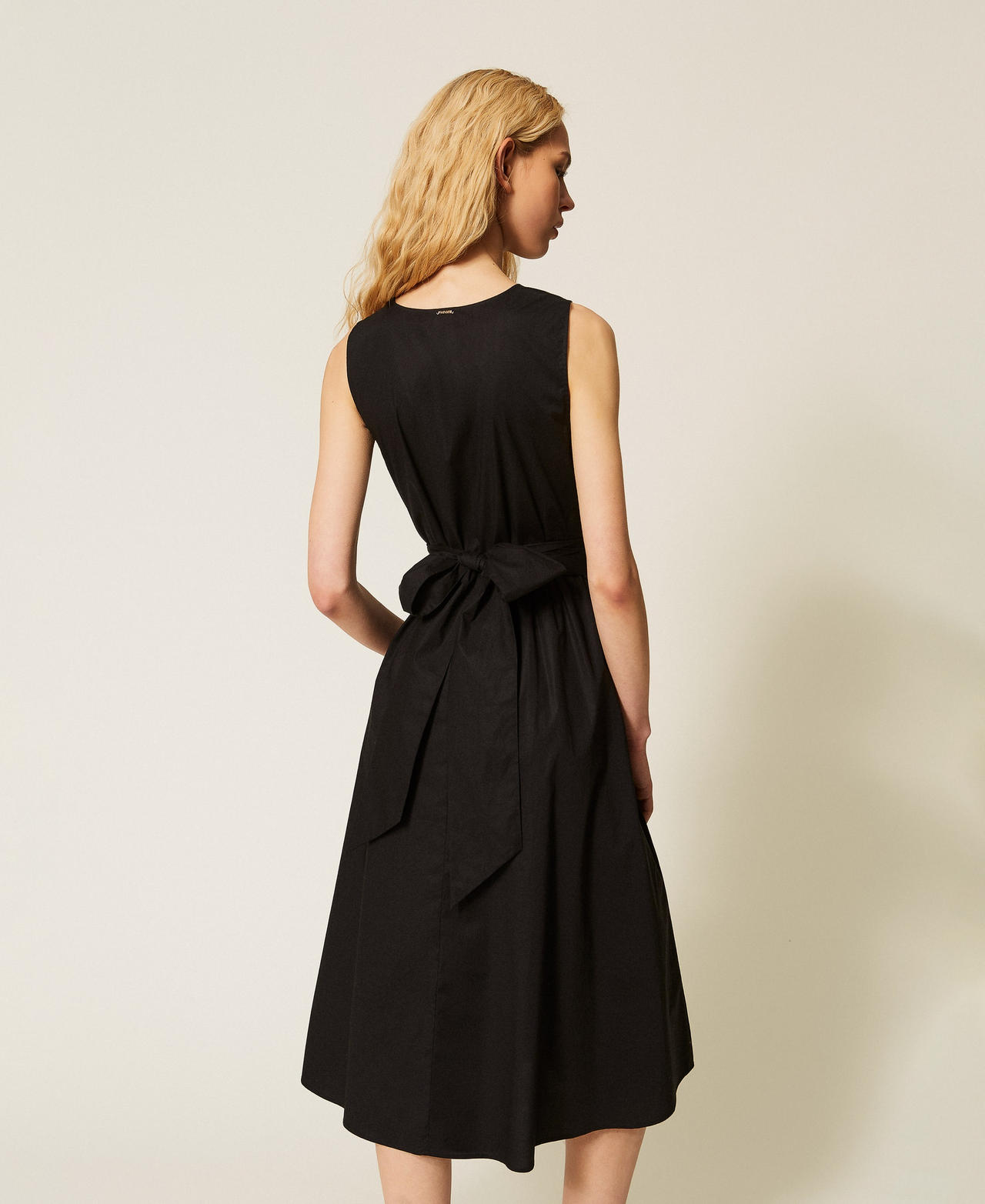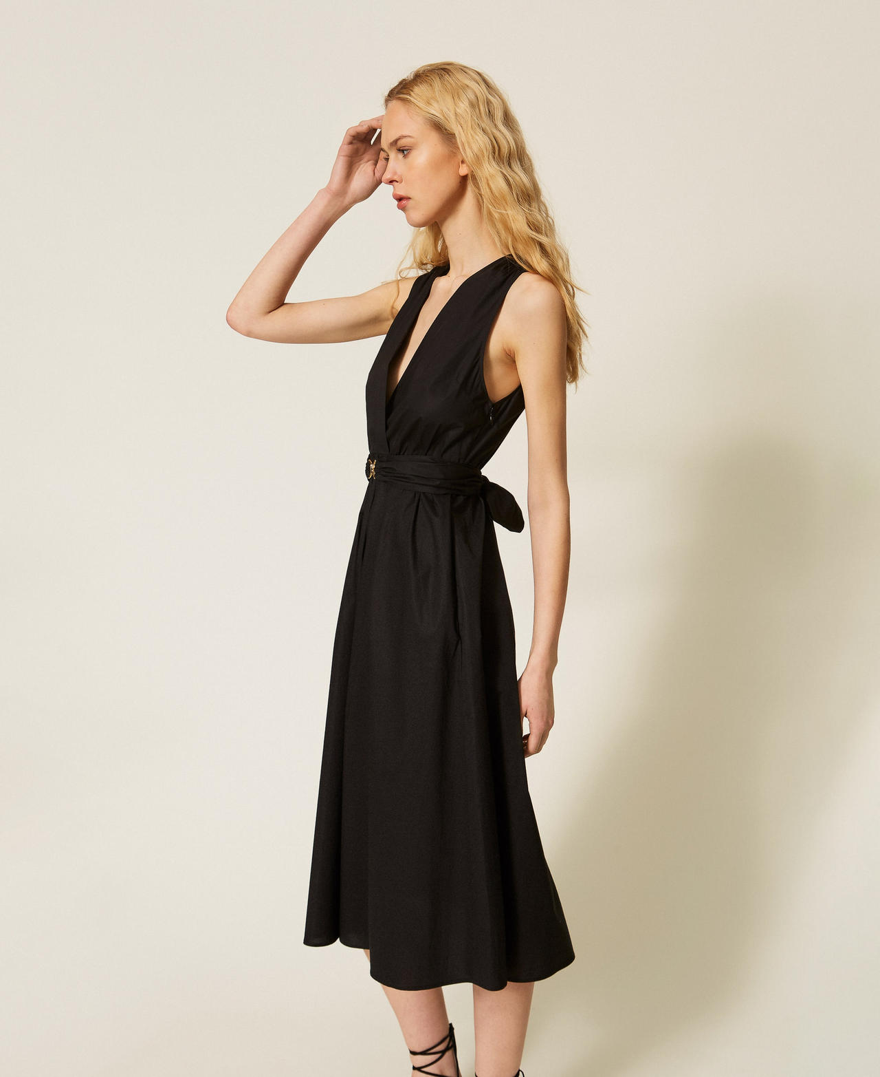 Платье длины миди из хлопка и эластана с V-образным вырезом и расклешенной юбкой дополнено регулируемым поясом на талии.