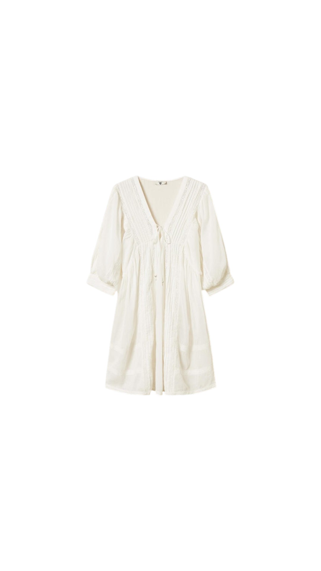 Платье длины мини свободного силуэта c V-образным вырезом дополнено объемными рукавами и прозрачными кружевными вставками.