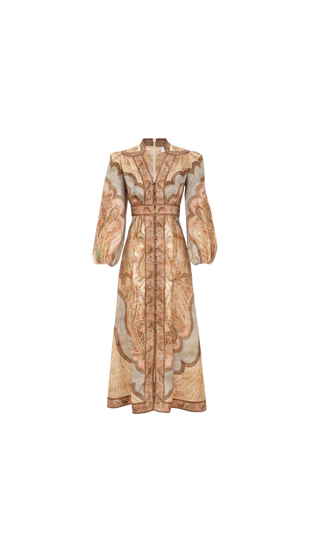 Приталенное платье Wanderlust Plunge из льняной ткани дополнено застежкой на пуговицы спереди и молнию сзади, воротником-стойкой, V-образным вырезом, объемными рукавами и украшено принтом Tapestry Multi.