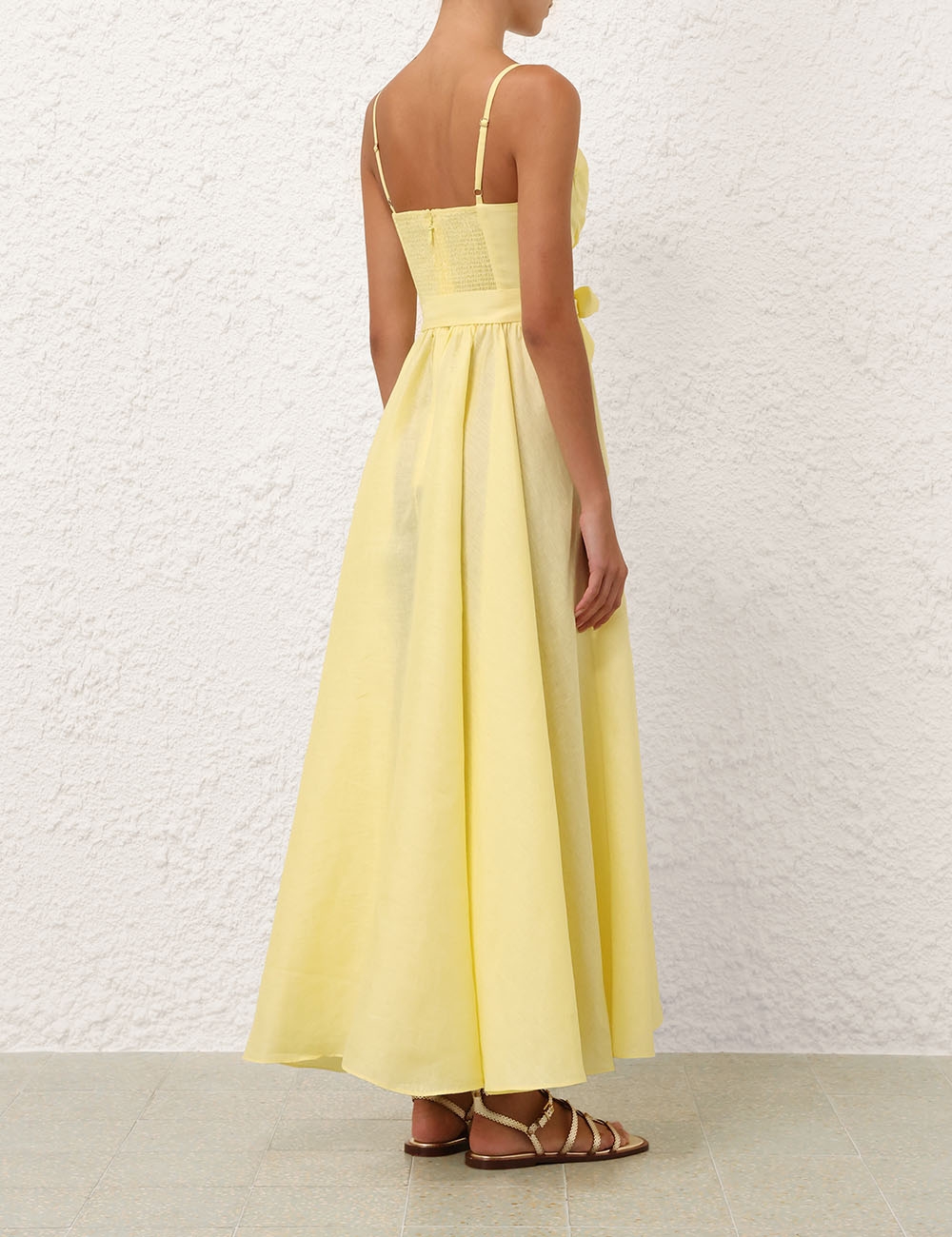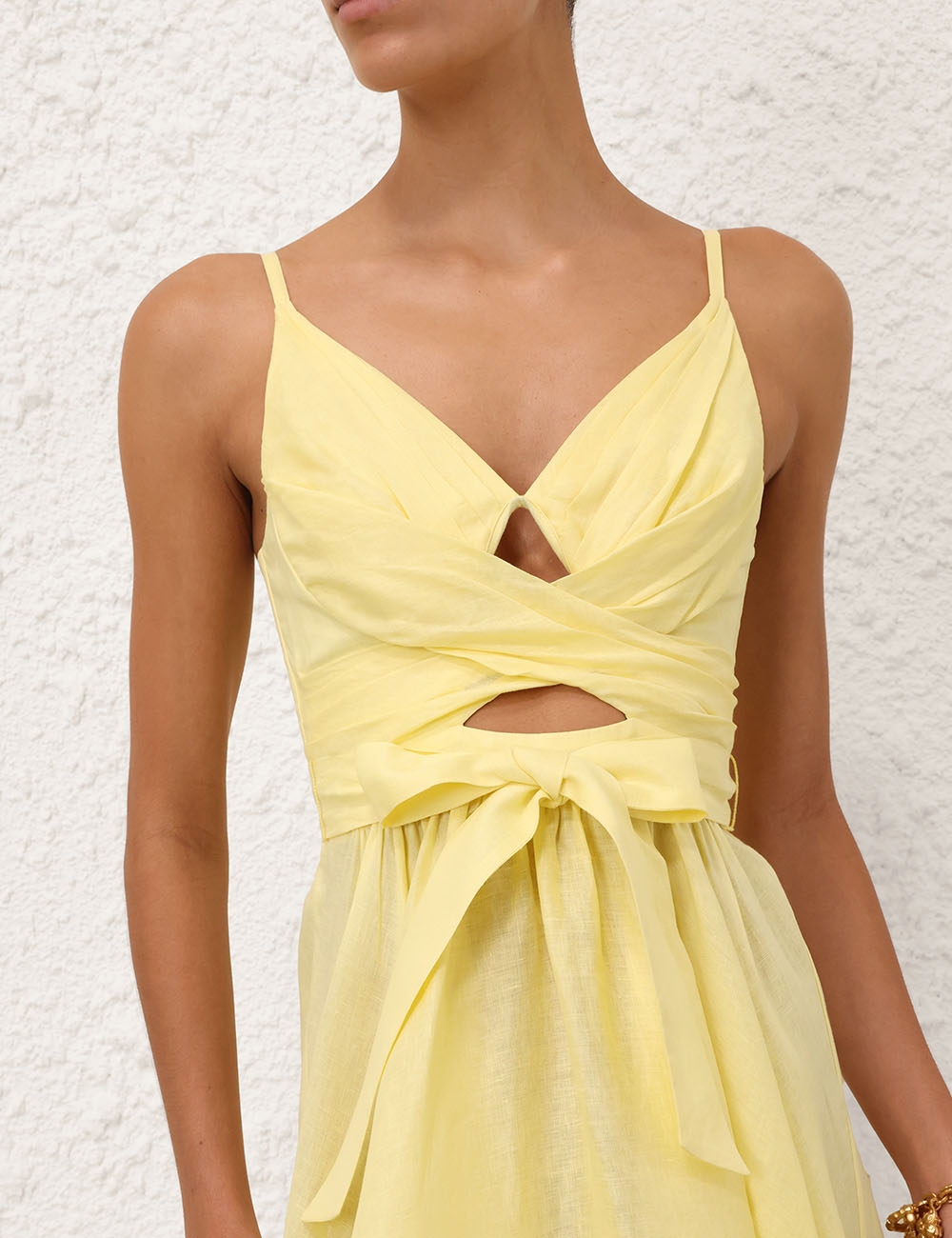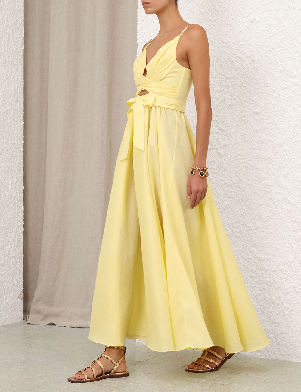 Эффектное льняное платье с глубоким V-образным вырезом на тонких регулируемых бретелях дополнено поясом на талии в тон.