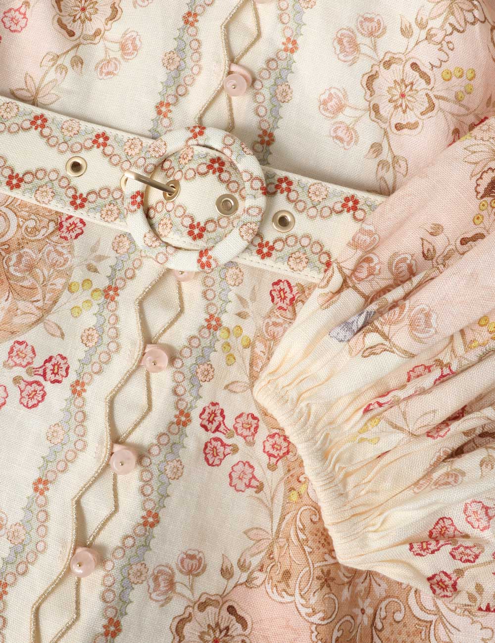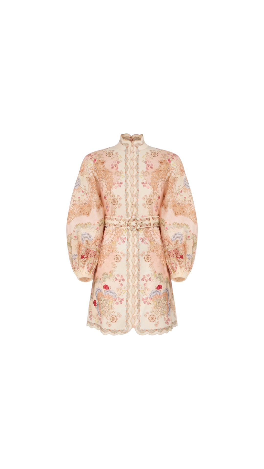 Льняное платье длины мини с цветочным мотивом дополнено воротником-стойкой, застежкой на пуговицы спереди, объемными длинными рукавами и съемным регулируемым поясом на талии.